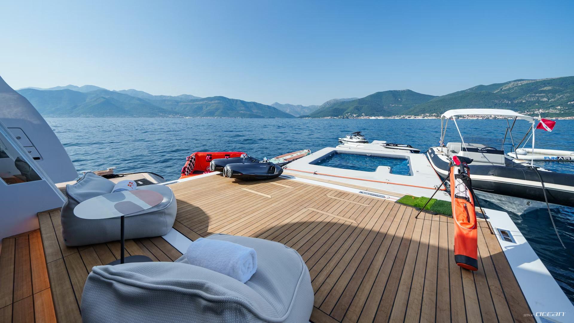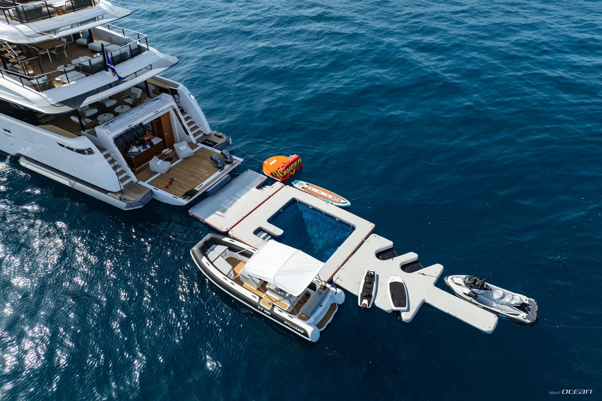 6.32m Williams jet tender, Sea-Doo GTX 325, 2 stand-up paddleboards, 2 SeaBobs, lift flight board (1 medium foil, 1 large foil), 2 inflatable beach lounges, e-surf, inflatable towable toys, jelly fish pool, spear fishing gear, beach toys (frisbee, football, paddle tennis, volleyball and mini soccer ball), inflatable swimming platform, and snorkeling gear
