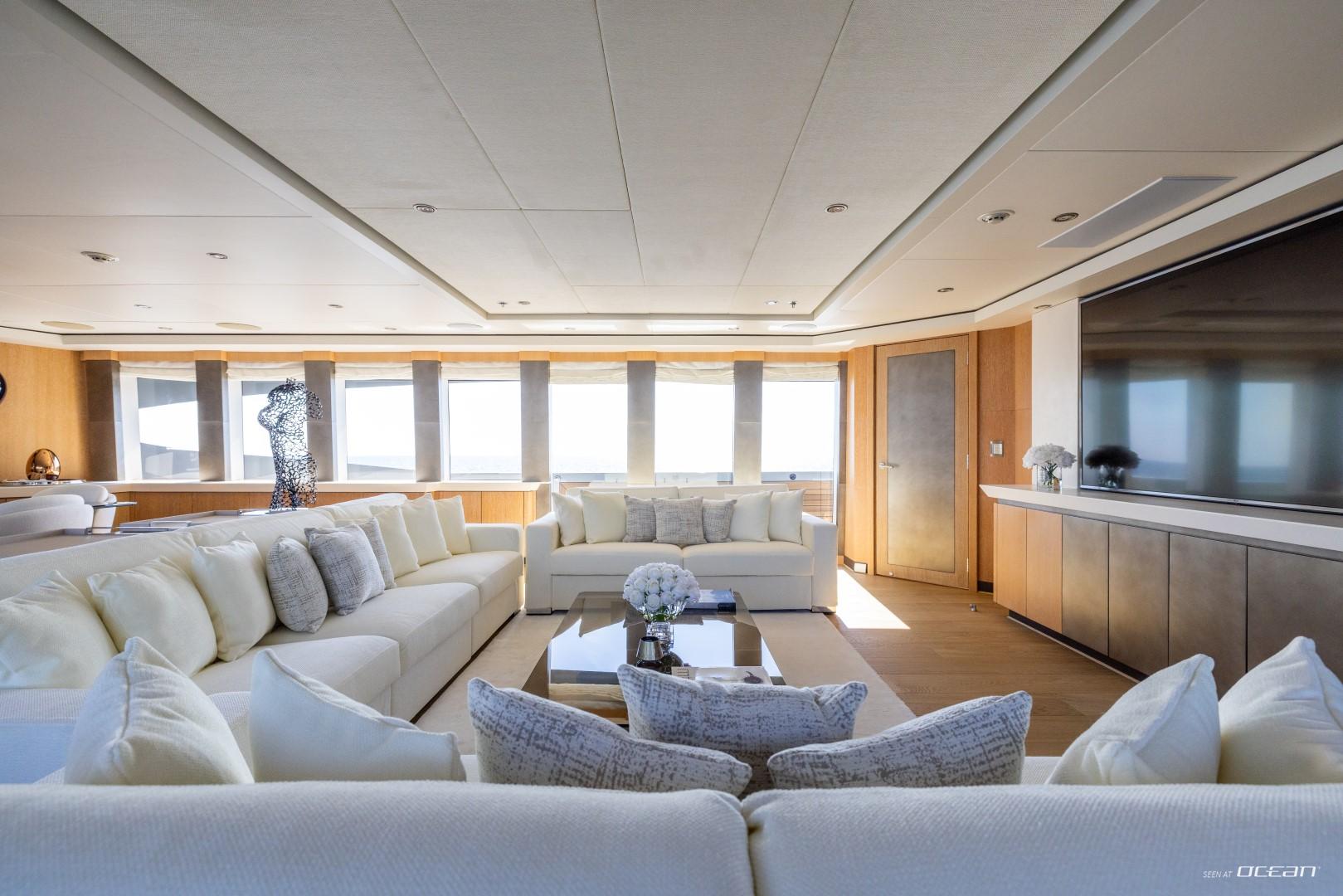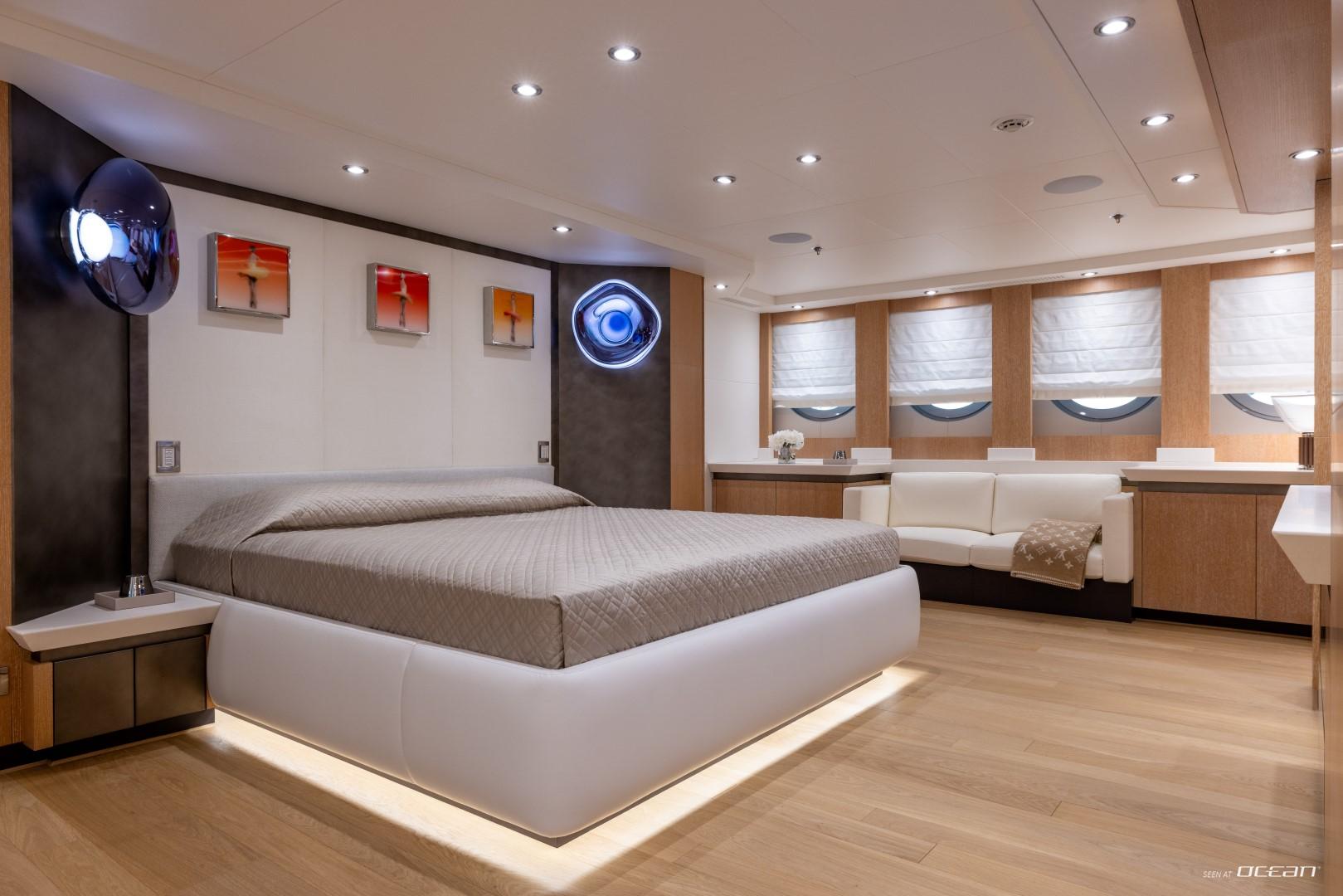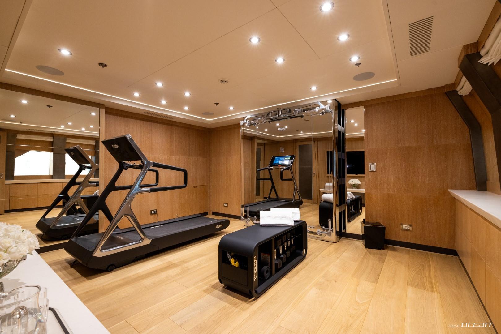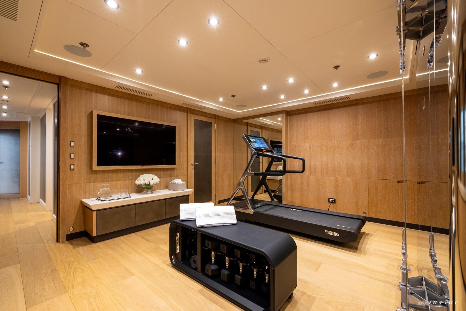 The bright, contemporary interior accommodates 10 guests in 5 cabins, including a full-beam master suite, 2 doubles, and 2 twins, supported by 8 crew. Expansive windows, luxurious finishes, and a fully equipped onboard gym create a comfortable and modern living environment.