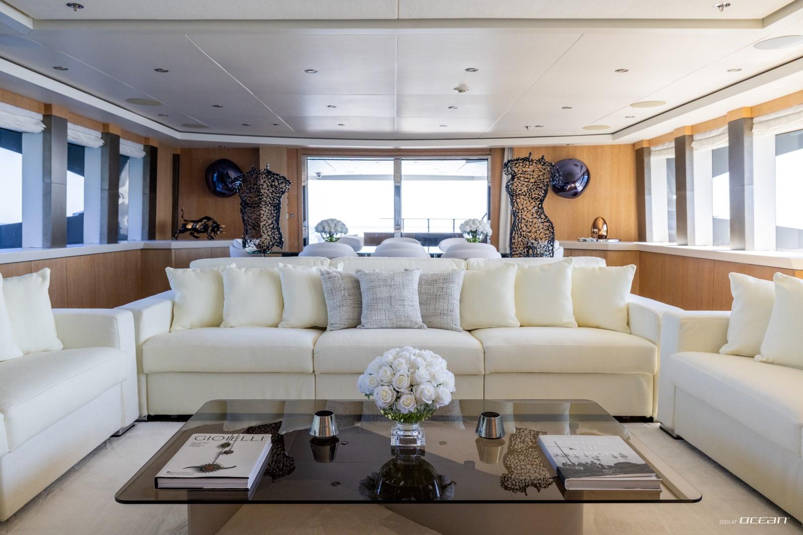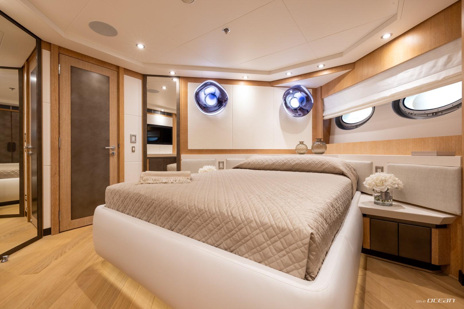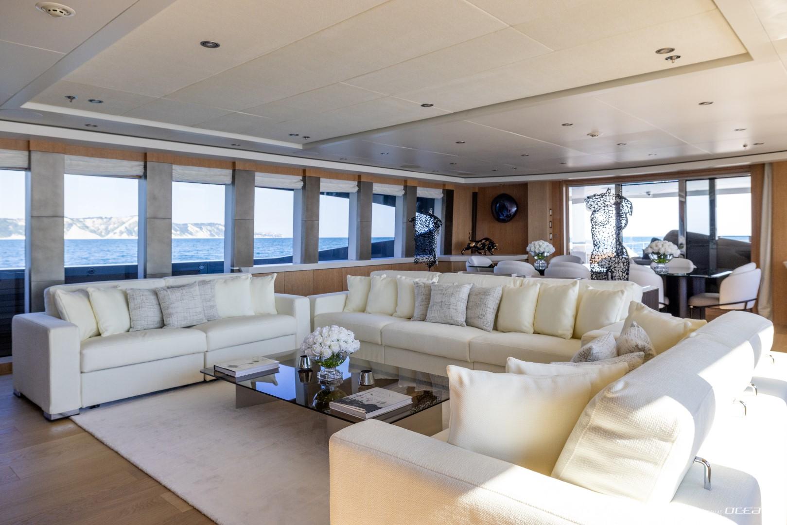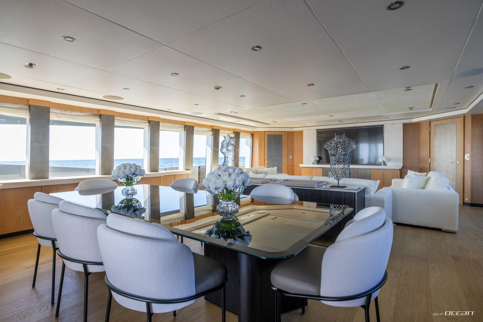 The bright, contemporary interior accommodates 10 guests in 5 cabins, including a full-beam master suite, 2 doubles, and 2 twins, supported by 8 crew. Expansive windows, luxurious finishes, and a fully equipped onboard gym create a comfortable and modern living environment.
