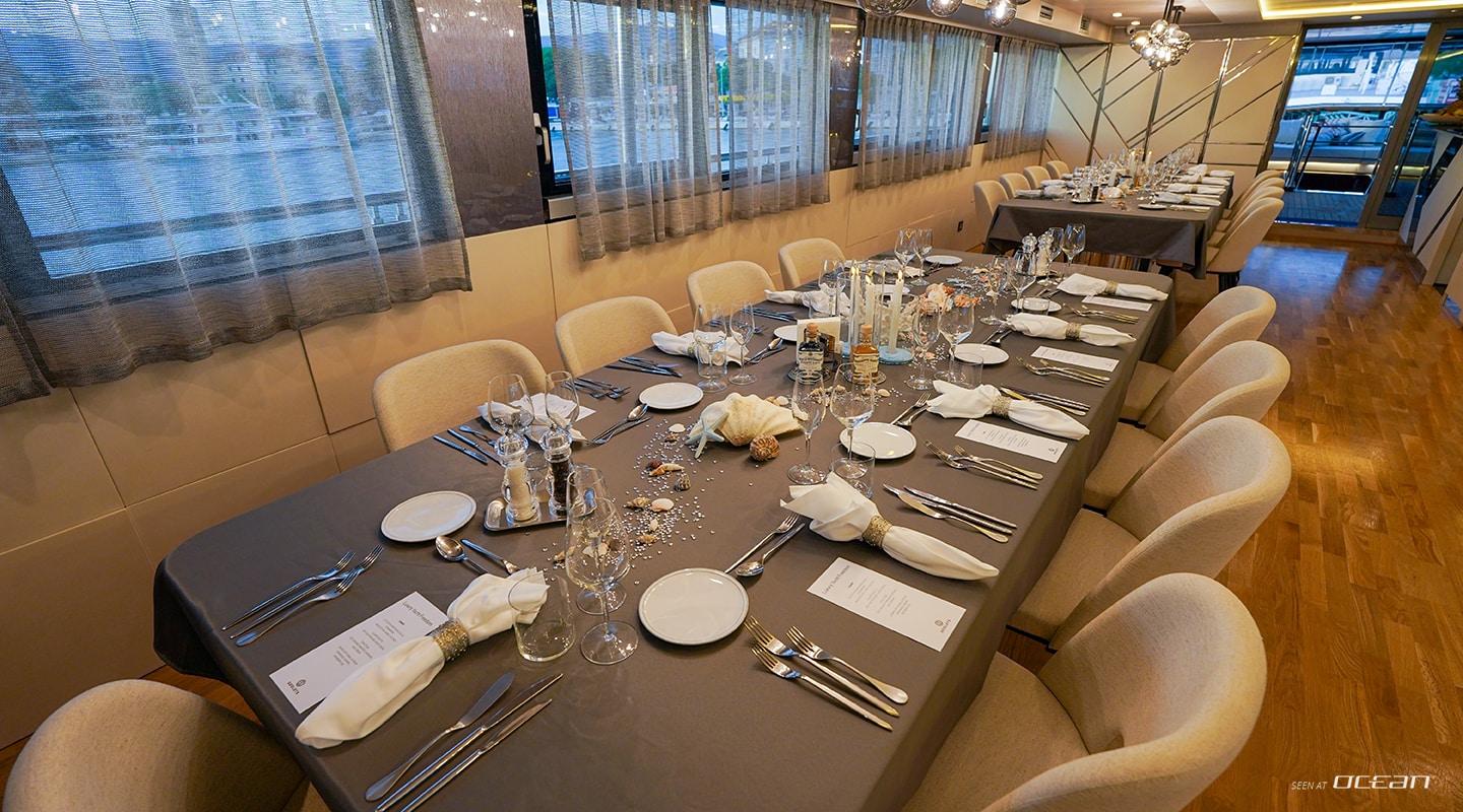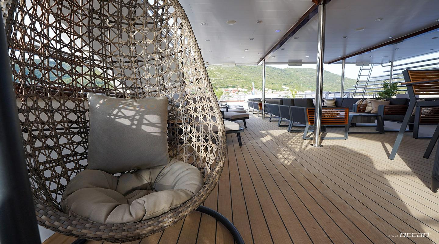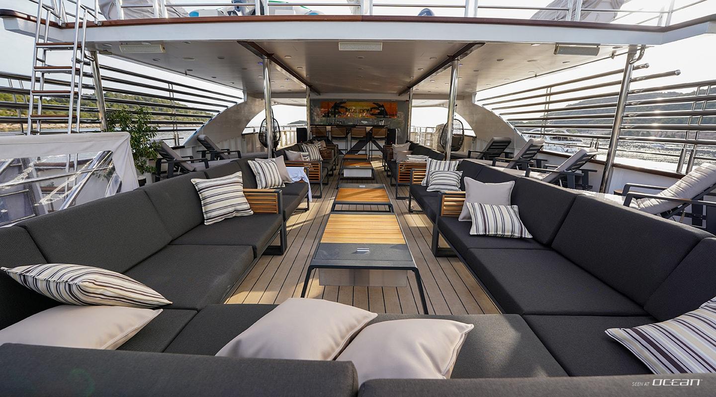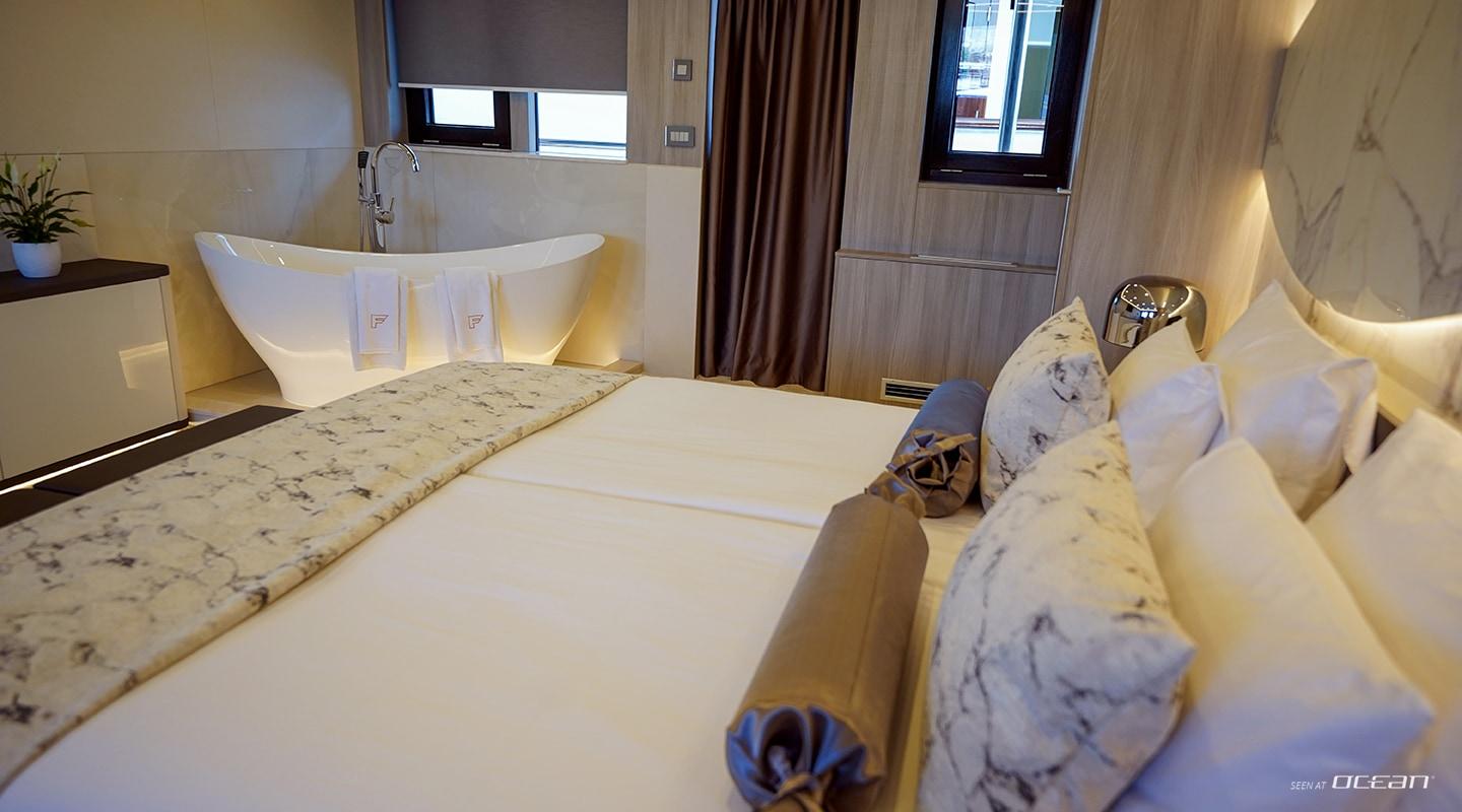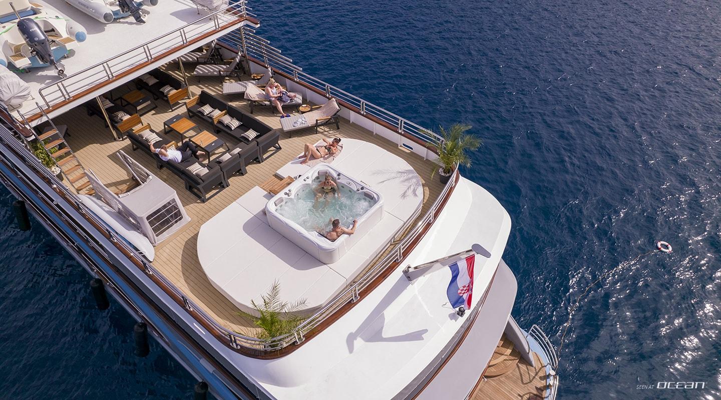 FREEDOM’s sun deck is a signature highlight, complete with a swimming pool, large jacuzzi, private bar, outdoor gym area, and generous lounge seating. Whether you prefer relaxed yoga mornings or lively sunset gatherings, the space adapts easily to your mood. Across her decks, guests enjoy shaded dining, quiet lounge corners, and panoramic views of Croatia’s islands.