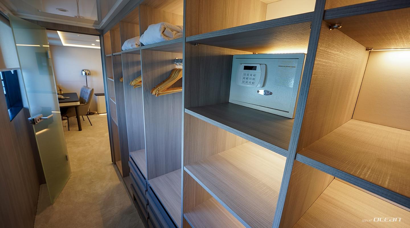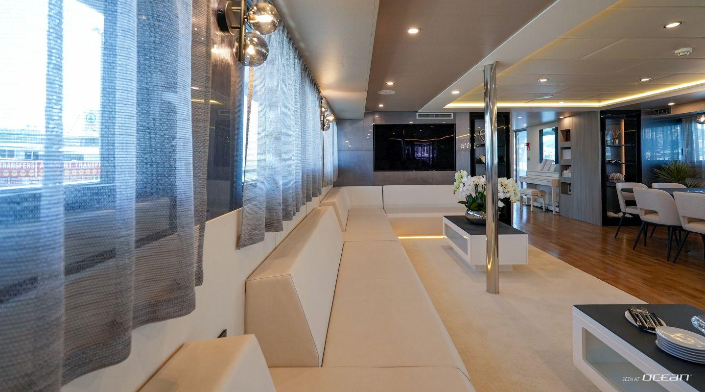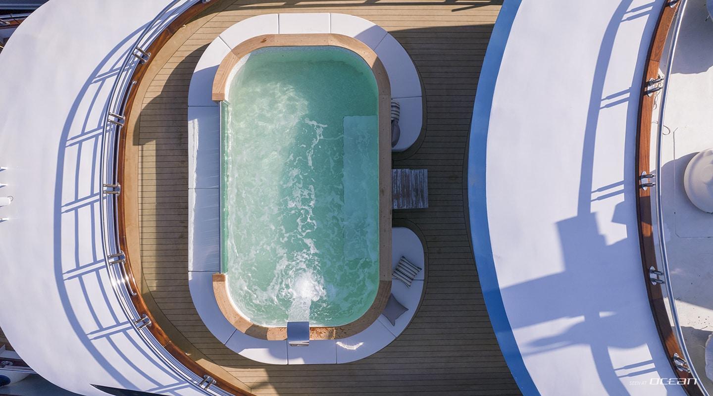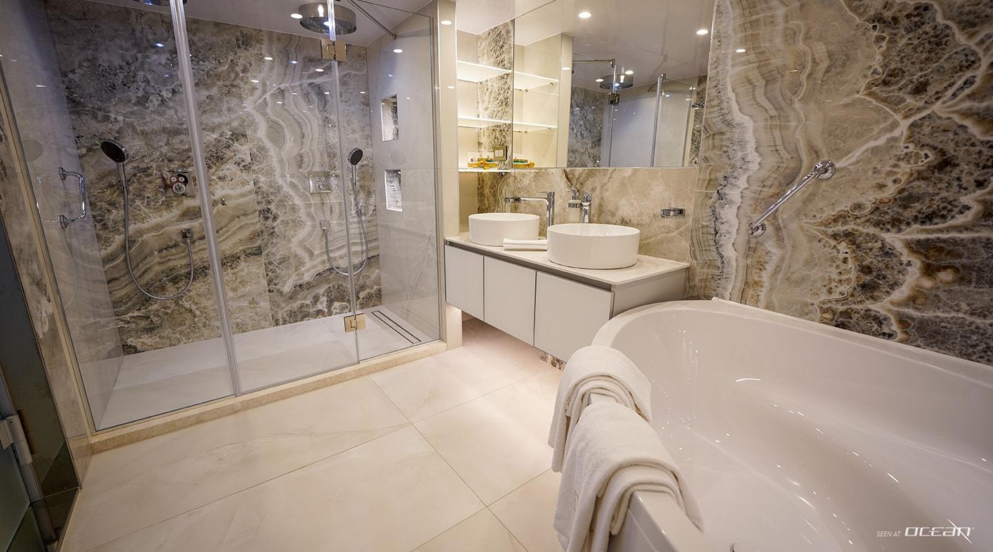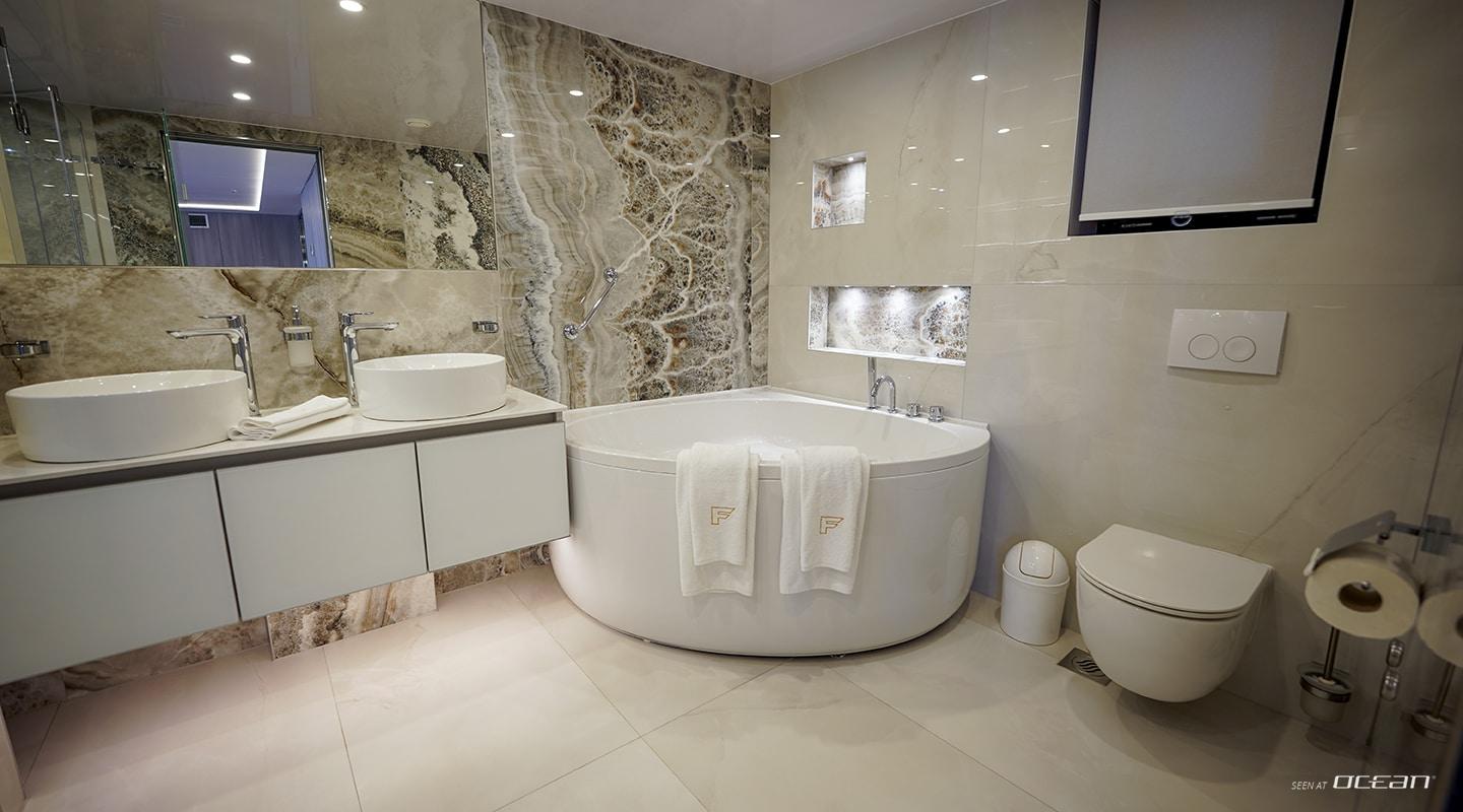 En-suite bathrooms in all cabins, air condition throughout, generator, Wi-Fi internet, cinema and video gaming room, jacuzzi, pool, 2 open bars, fitness studio, sauna with large shower, beauty spa/massage room, lounge area with TV, swimming platform, all outside cushions and sun pads for generous sunbathing areas, stern/cockpit shower and a variety of water toys.