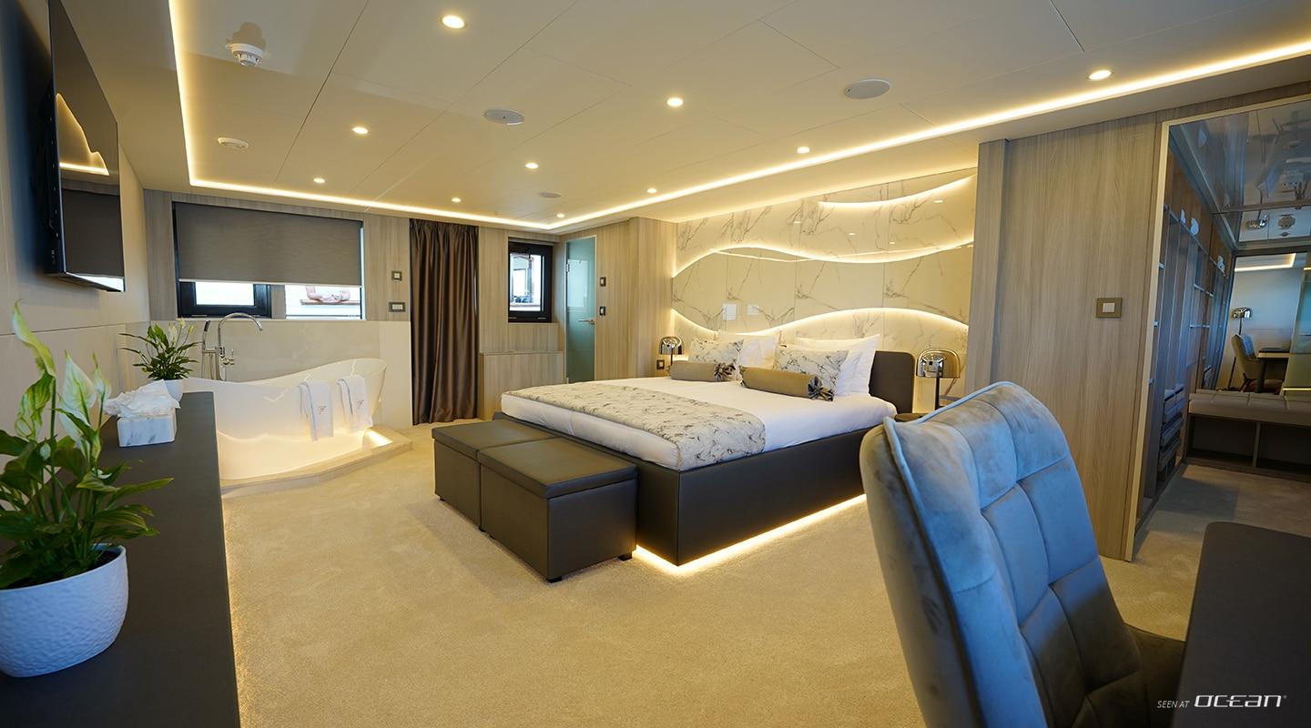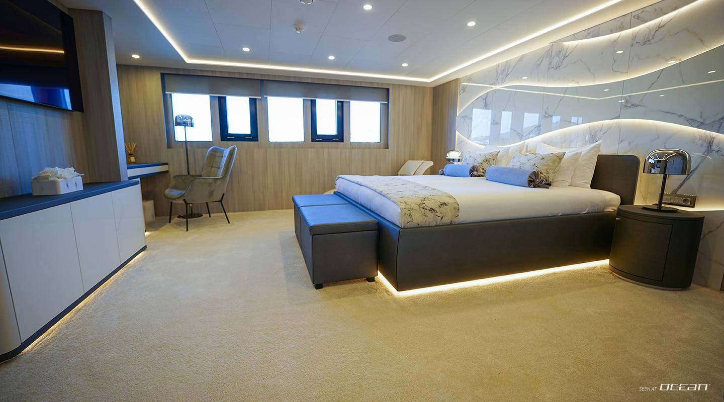 FREEDOM 48m luxury yacht welcomes 22 guests in 11 beautifully designed staterooms, including 2 expansive master suites. Every cabin features ensuite facilities, premium bedding, and a refined palette that creates a serene ambiance for restful nights. Her layout makes her ideal for larger families, milestone celebrations, or groups seeking a private yacht with exceptional space.