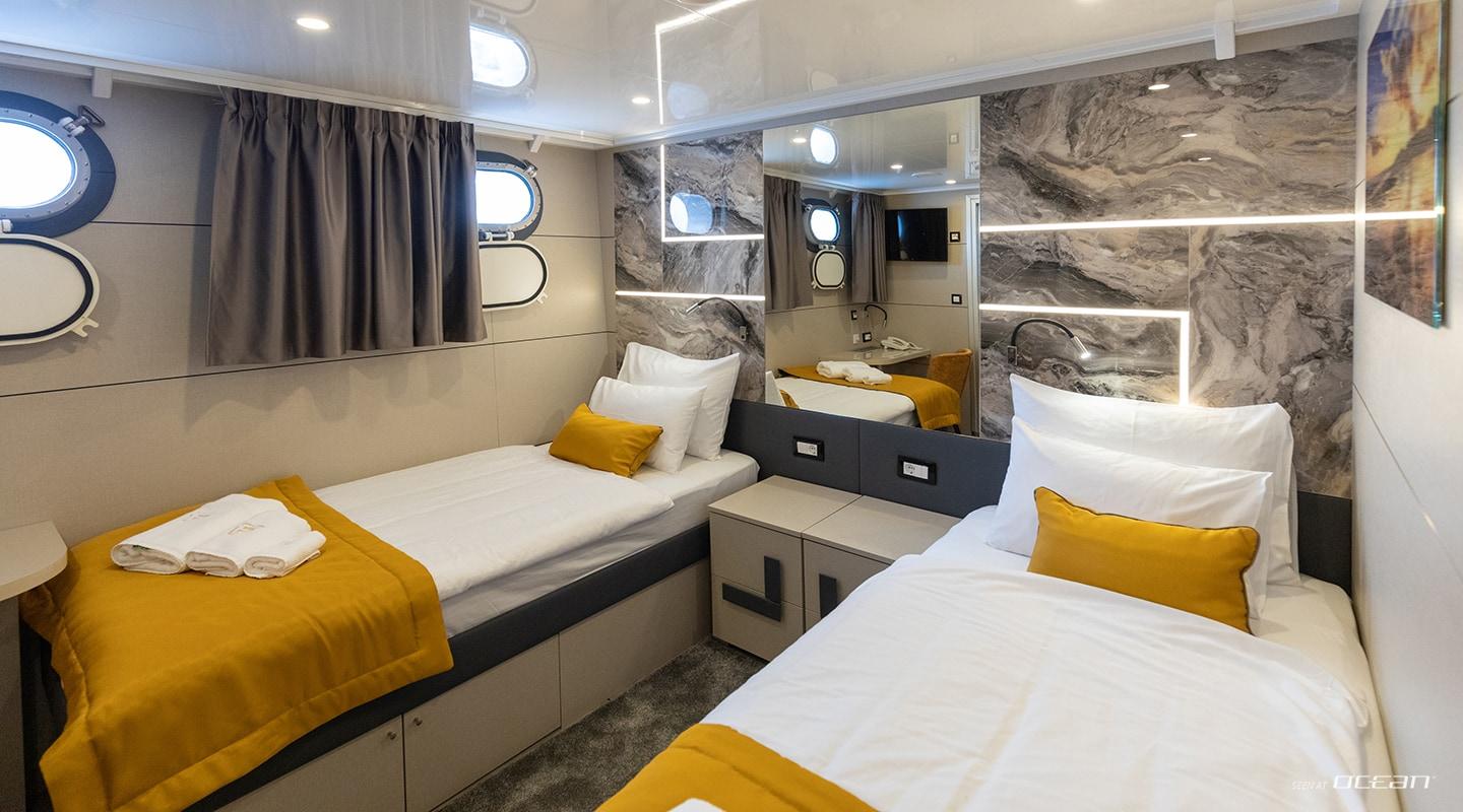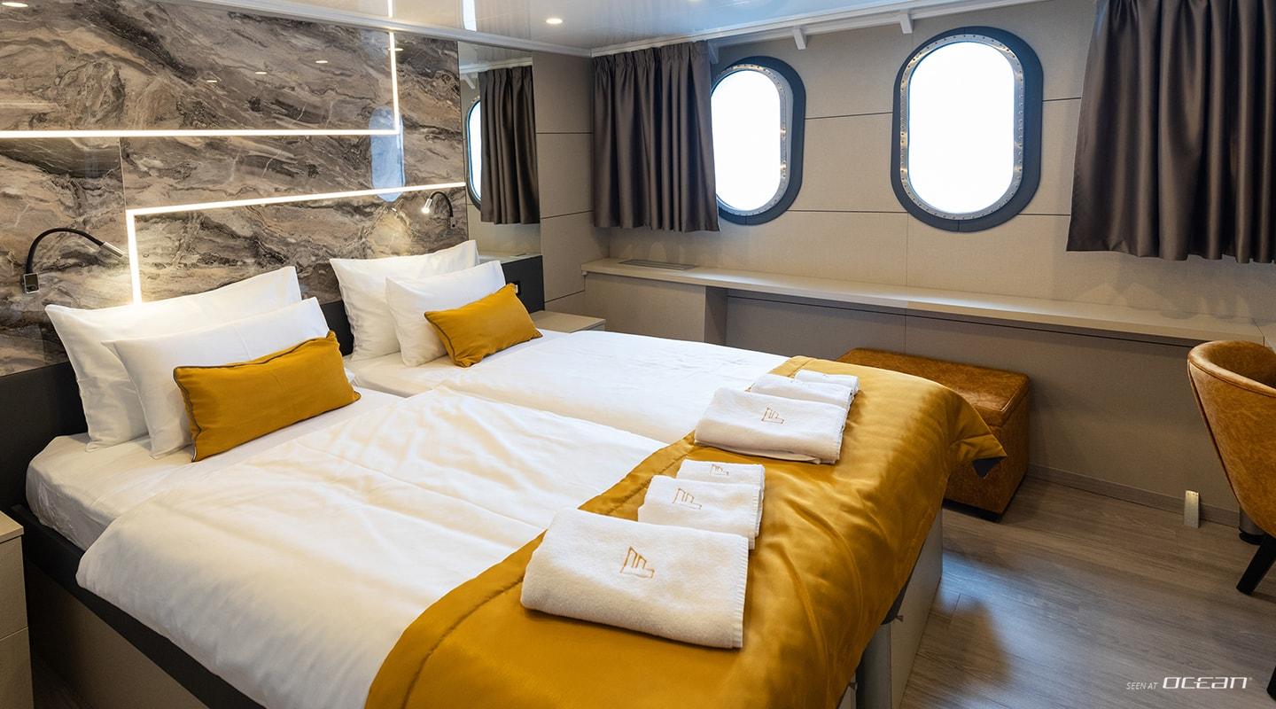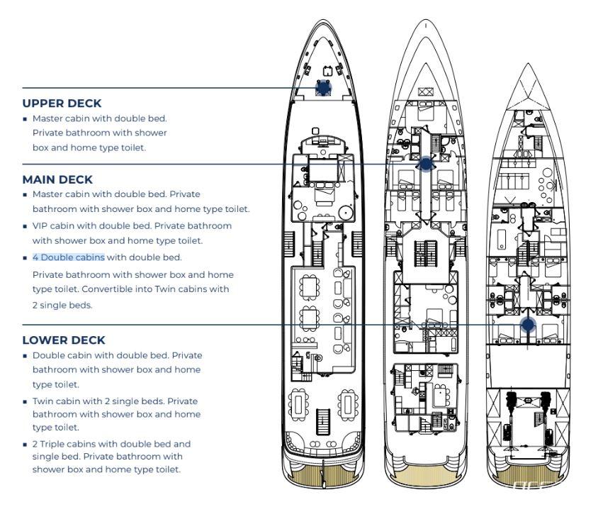 Cabin configuration: 2 master, 1 VIP, 2 triple, 5 double, and 1 twin cabin (some double are convertible to twin)
