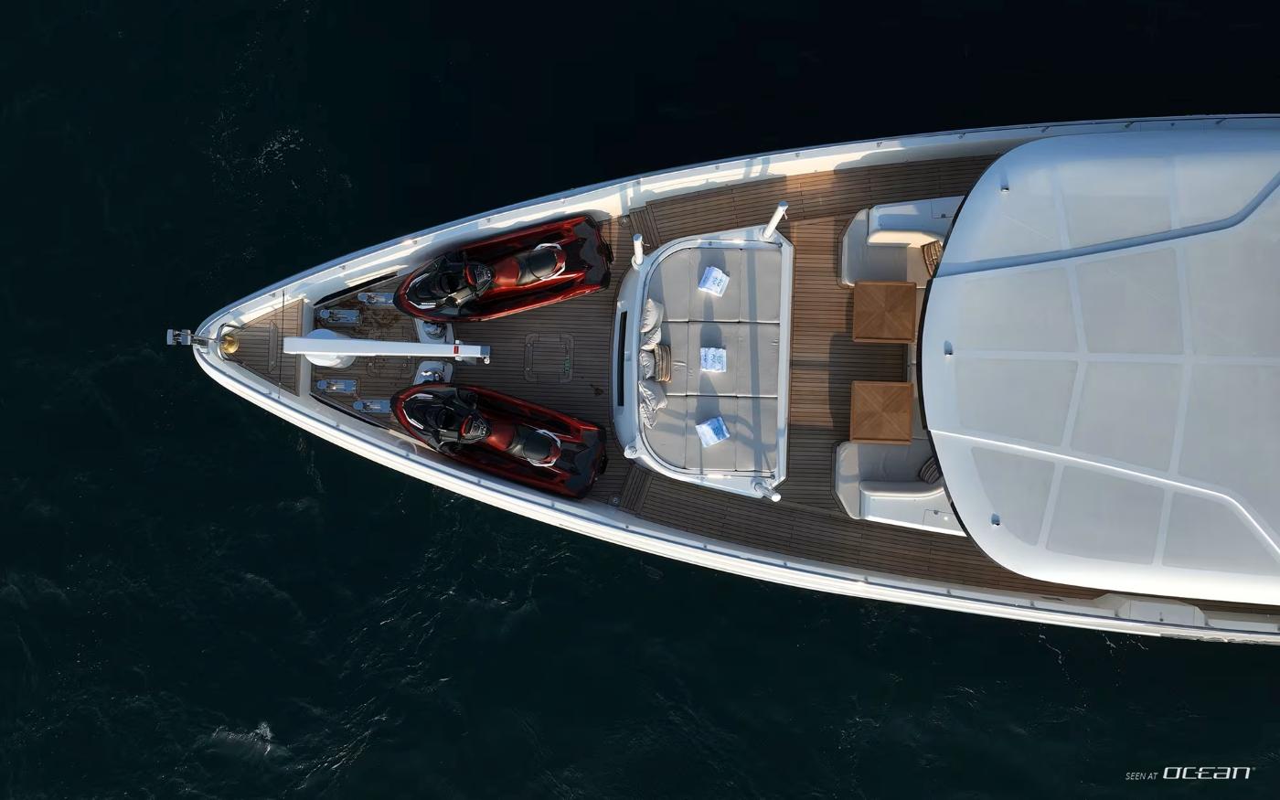 Williams 505 tender, 2 Seadoo 325 RXT jet skis, 2 Seabobs F5S, 2 eFoils, 2 stand-up paddleboards, and snorkeling gear