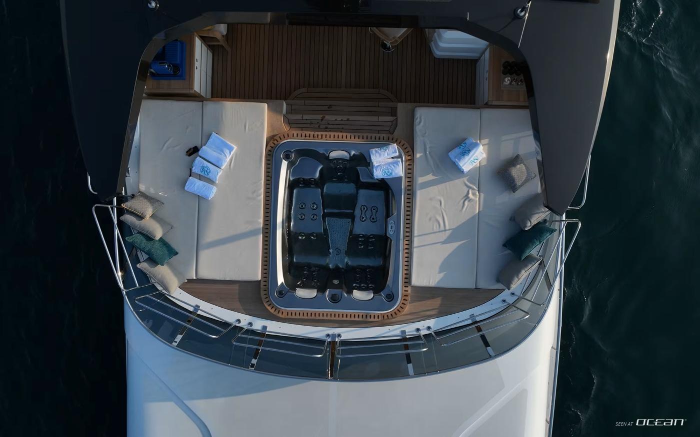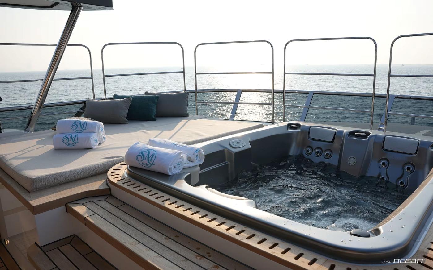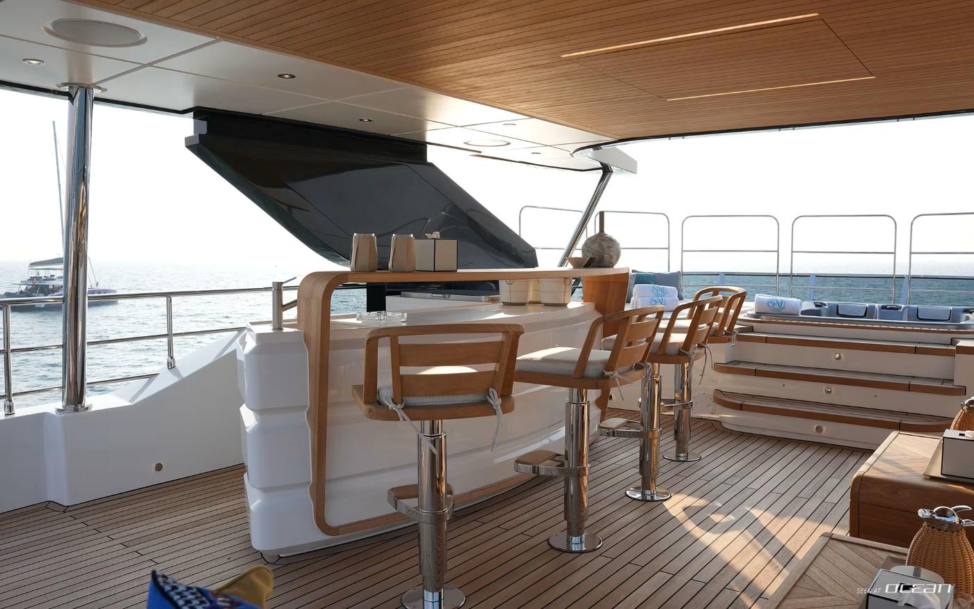 Designed to maximize exterior enjoyment, GEULUNEL offers up to 30 percent more outdoor living space than comparable yachts in her class. The sundeck features a jacuzzi with open sea views, complemented by generous lounging and dining areas across multiple levels. Low bulwarks and glass railings enhance the connection to the surroundings, while stabilizer systems both underway and at anchor ensure smooth, relaxed cruising throughout the day.
