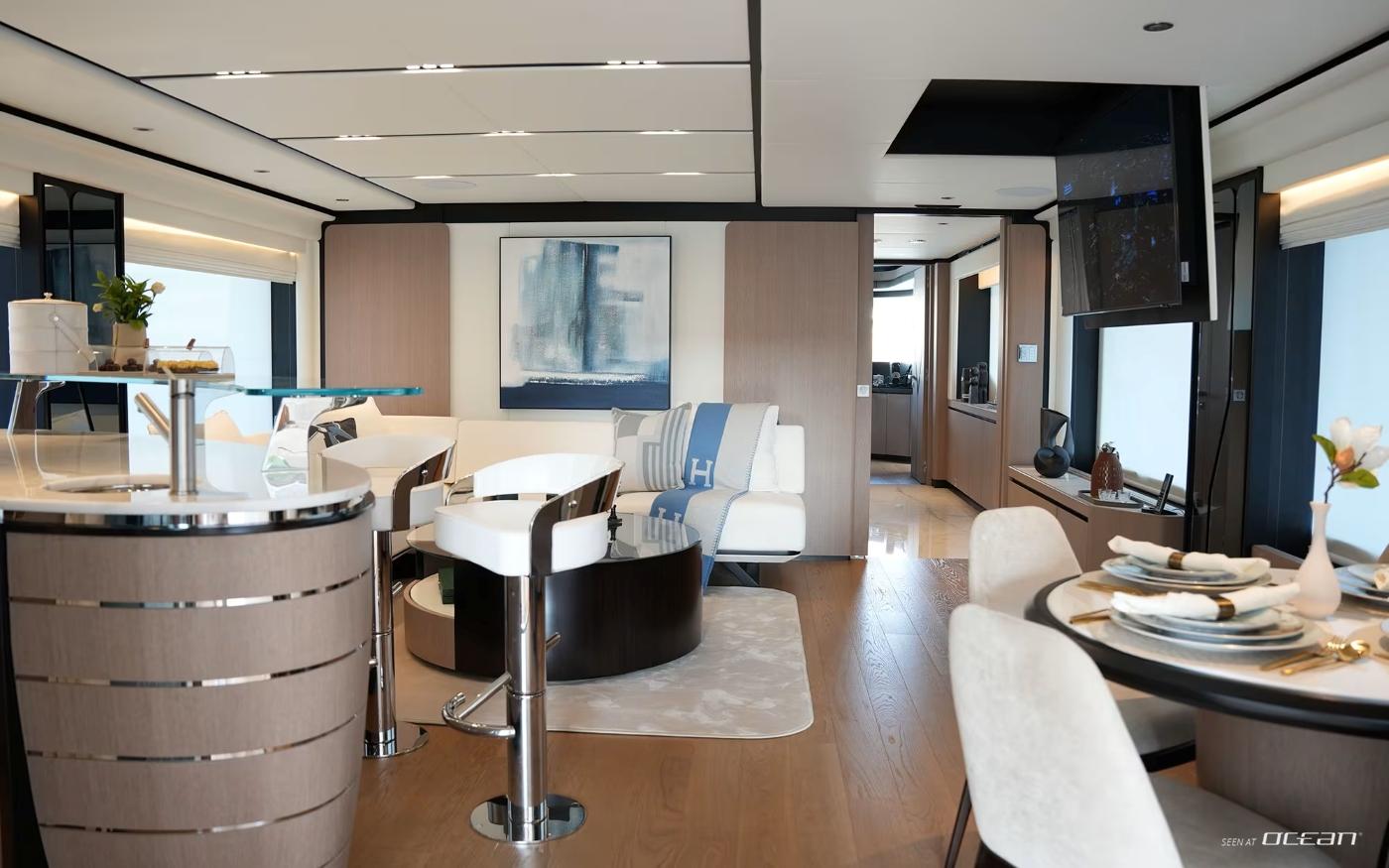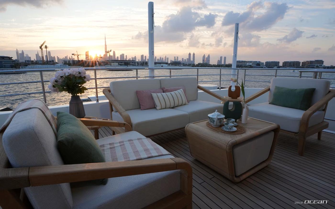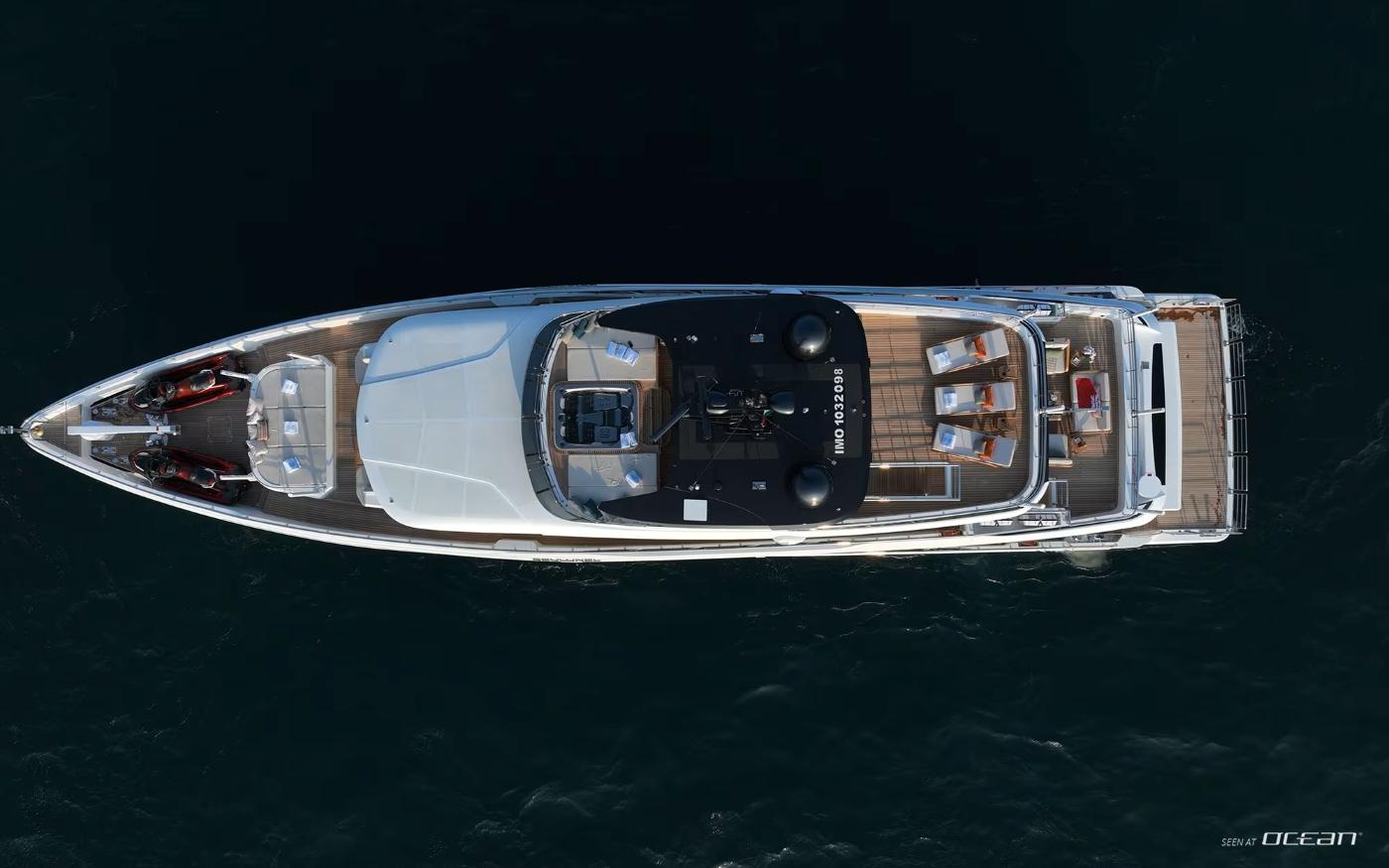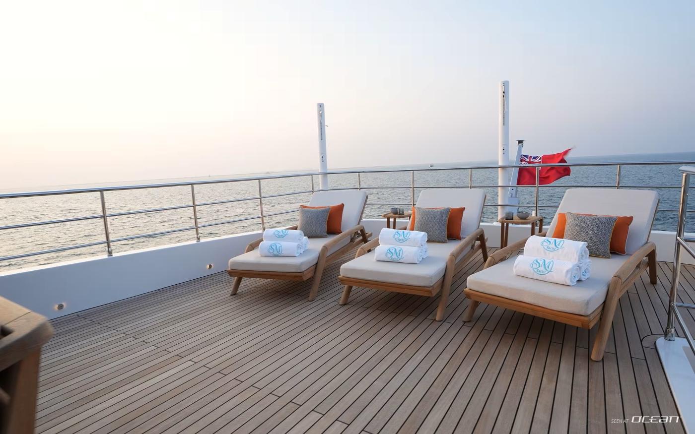 Designed to maximize exterior enjoyment, GEULUNEL offers up to 30 percent more outdoor living space than comparable yachts in her class. The sundeck features a jacuzzi with open sea views, complemented by generous lounging and dining areas across multiple levels. Low bulwarks and glass railings enhance the connection to the surroundings, while stabilizer systems both underway and at anchor ensure smooth, relaxed cruising throughout the day.