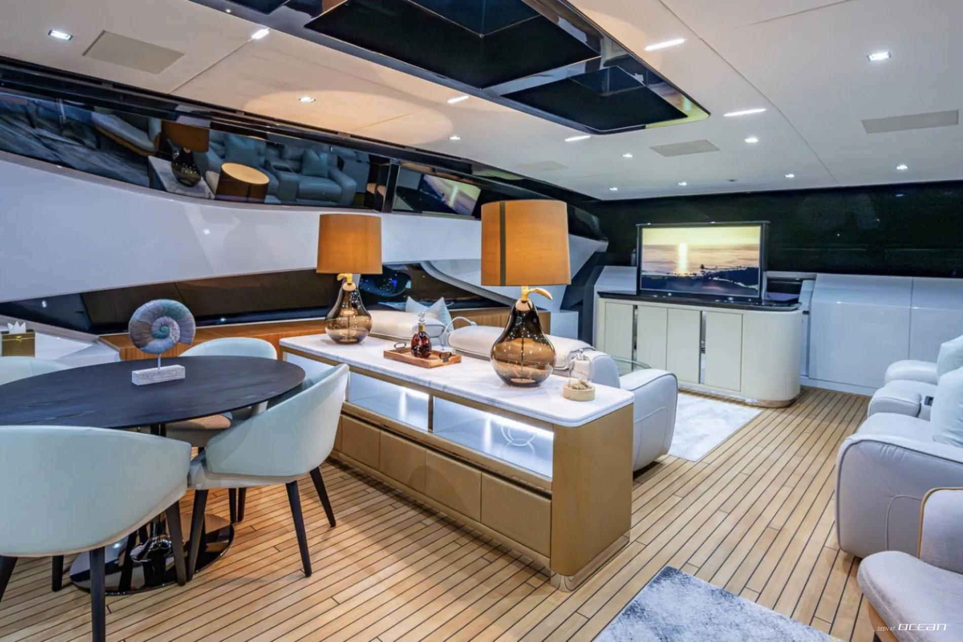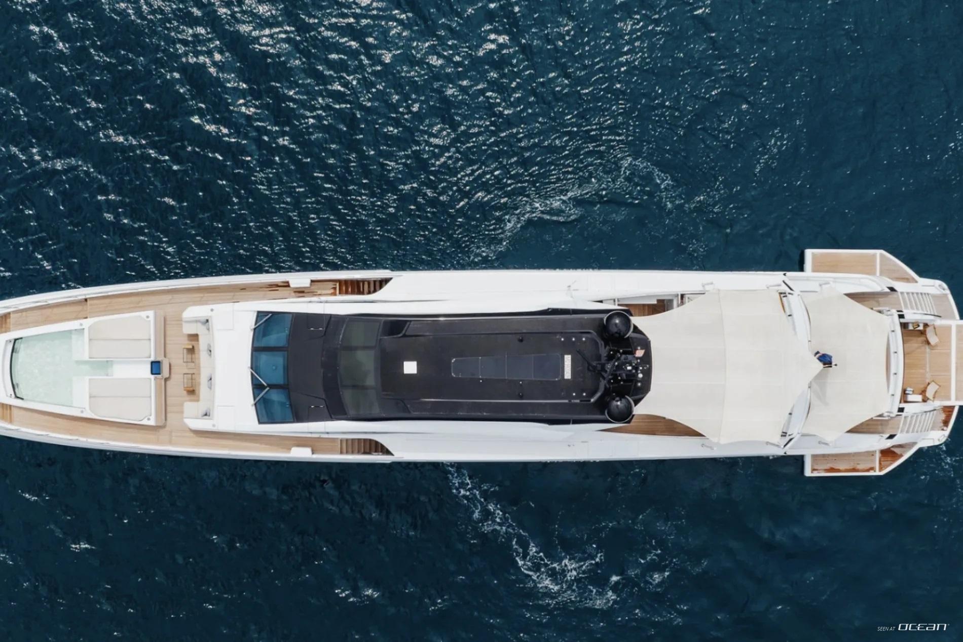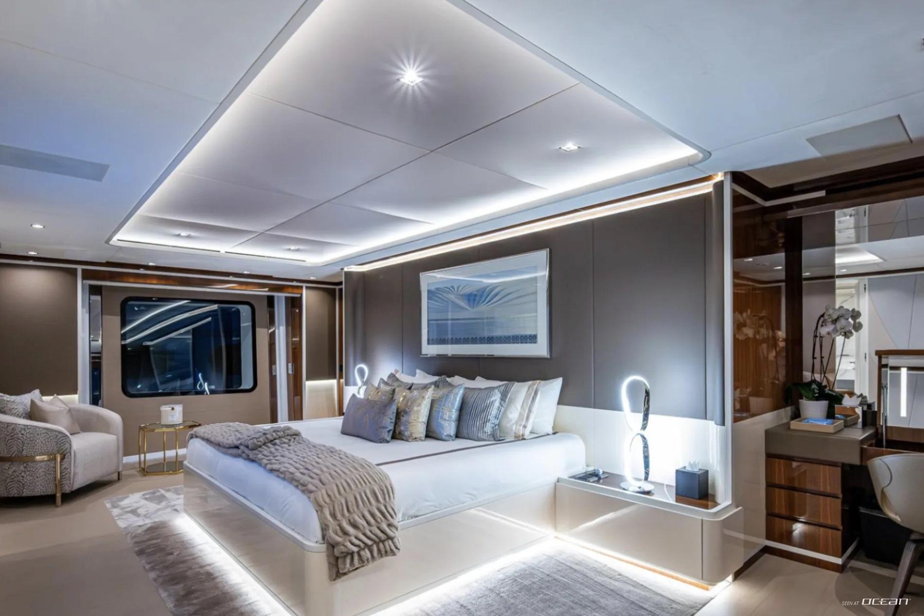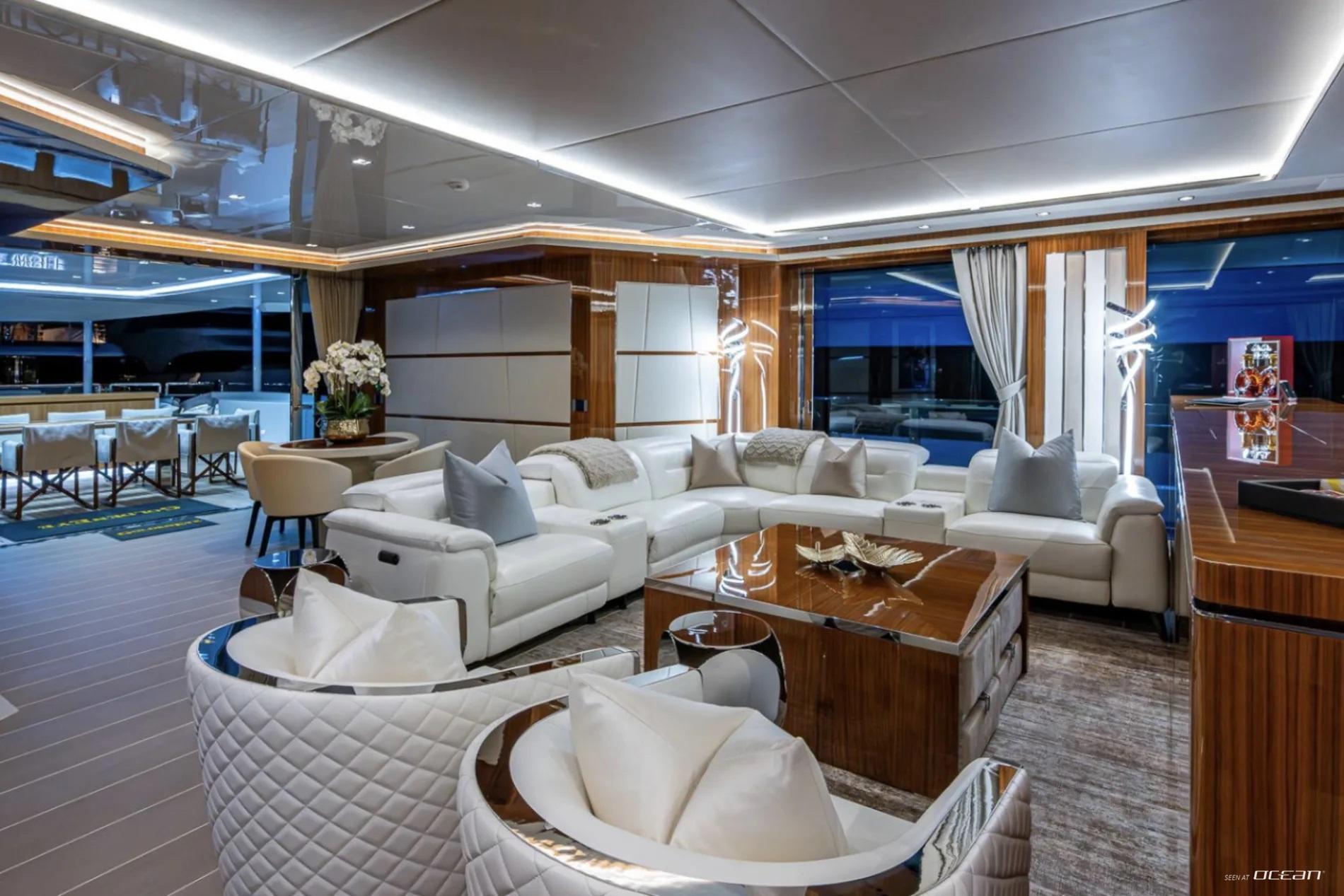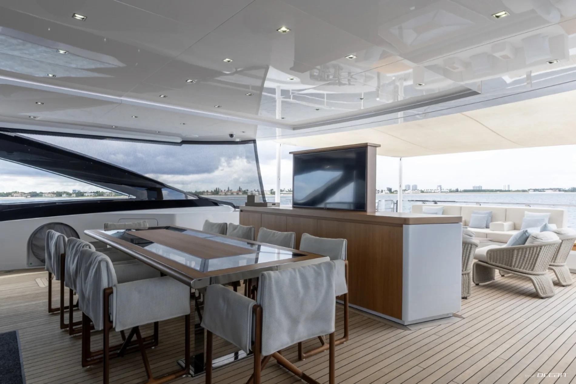 All cabins with en-suite bathrooms, automatic fold-down balcony in master cabin, air condition throughout, 2 generators, fully integrated state-of-the-art audio-visual systems, satellite television, Apple TV, Airplay iPad controllers, Starlink Wi-Fi internet, Samsung TV in salon, sky lounge, beach club, and in all cabins; glass pool/jacuzzi, gym equipment; large air-conditioned beach club with side platforms, dual TVs, and a fold-down transom adding a large swimming platform; BBQ grill, and a variety of water toys