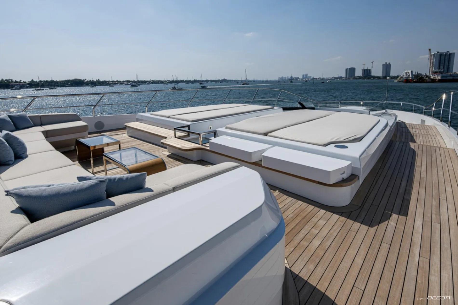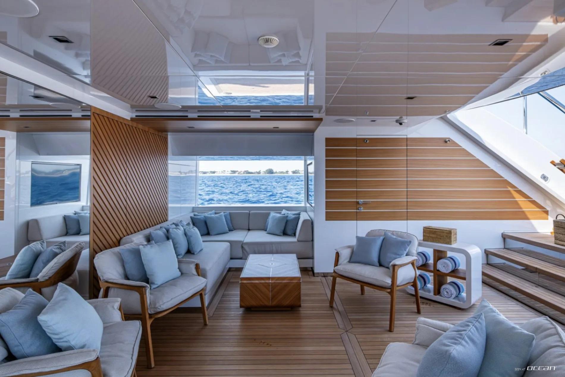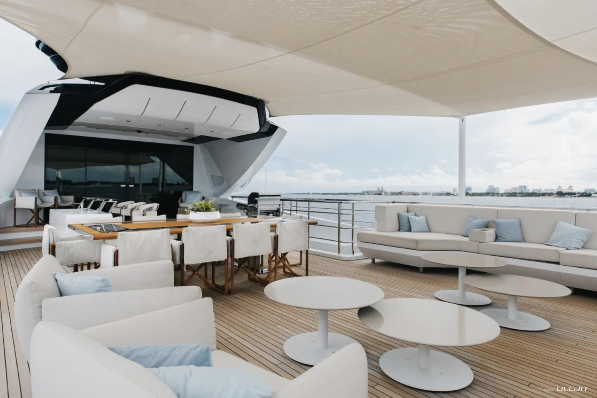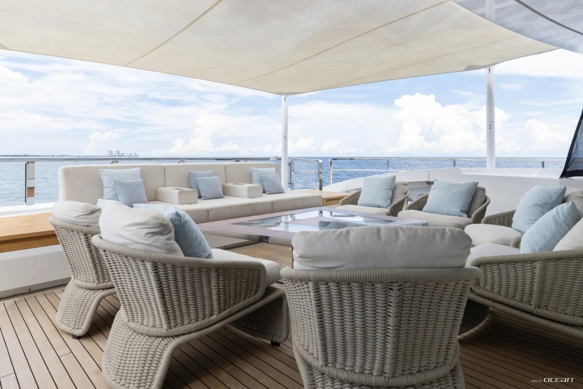 All cabins with en-suite bathrooms, automatic fold-down balcony in master cabin, air condition throughout, 2 generators, fully integrated state-of-the-art audio-visual systems, satellite television, Apple TV, Airplay iPad controllers, Starlink Wi-Fi internet, Samsung TV in salon, sky lounge, beach club, and in all cabins; glass pool/jacuzzi, gym equipment; large air-conditioned beach club with side platforms, dual TVs, and a fold-down transom adding a large swimming platform; BBQ grill, and a variety of water toys