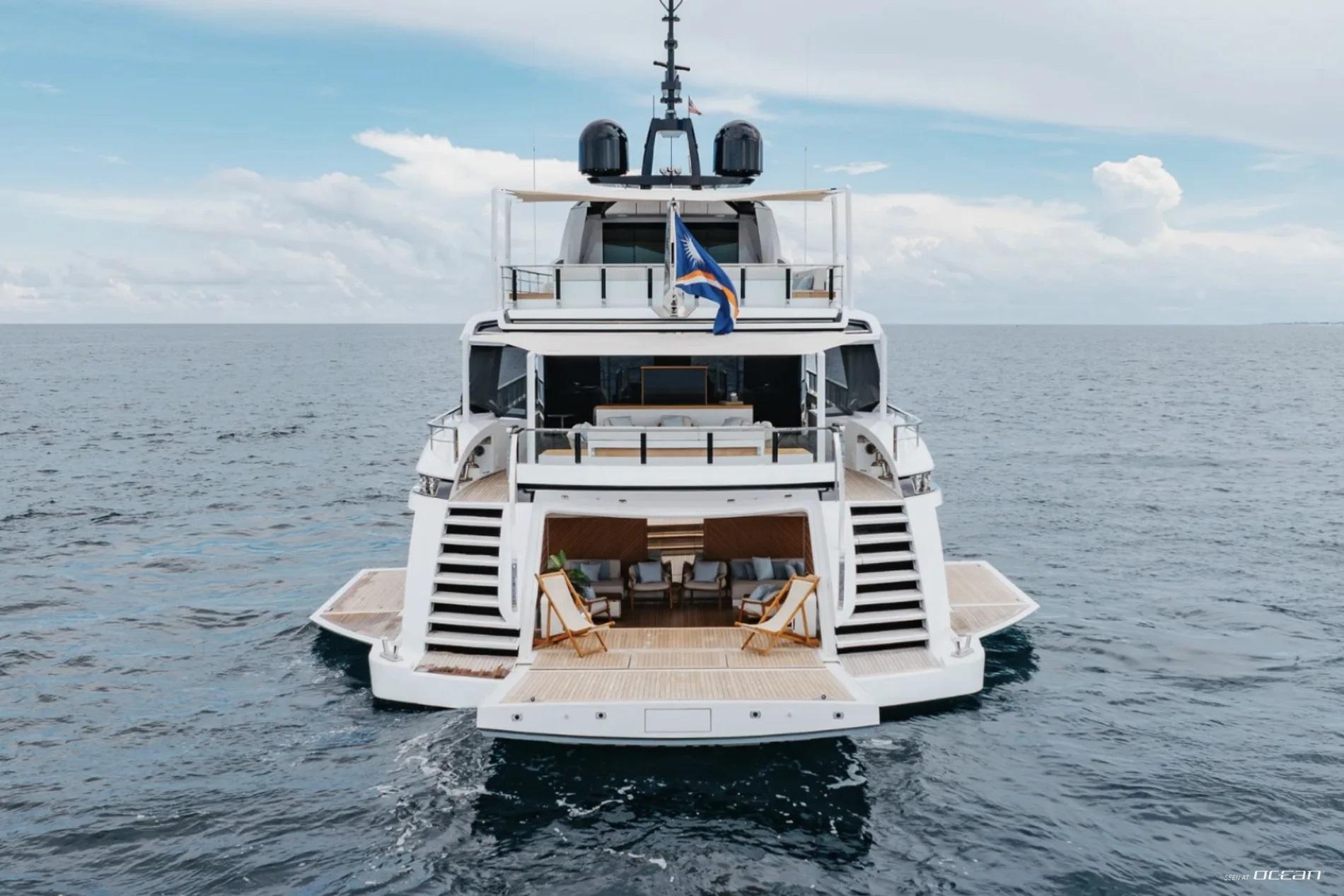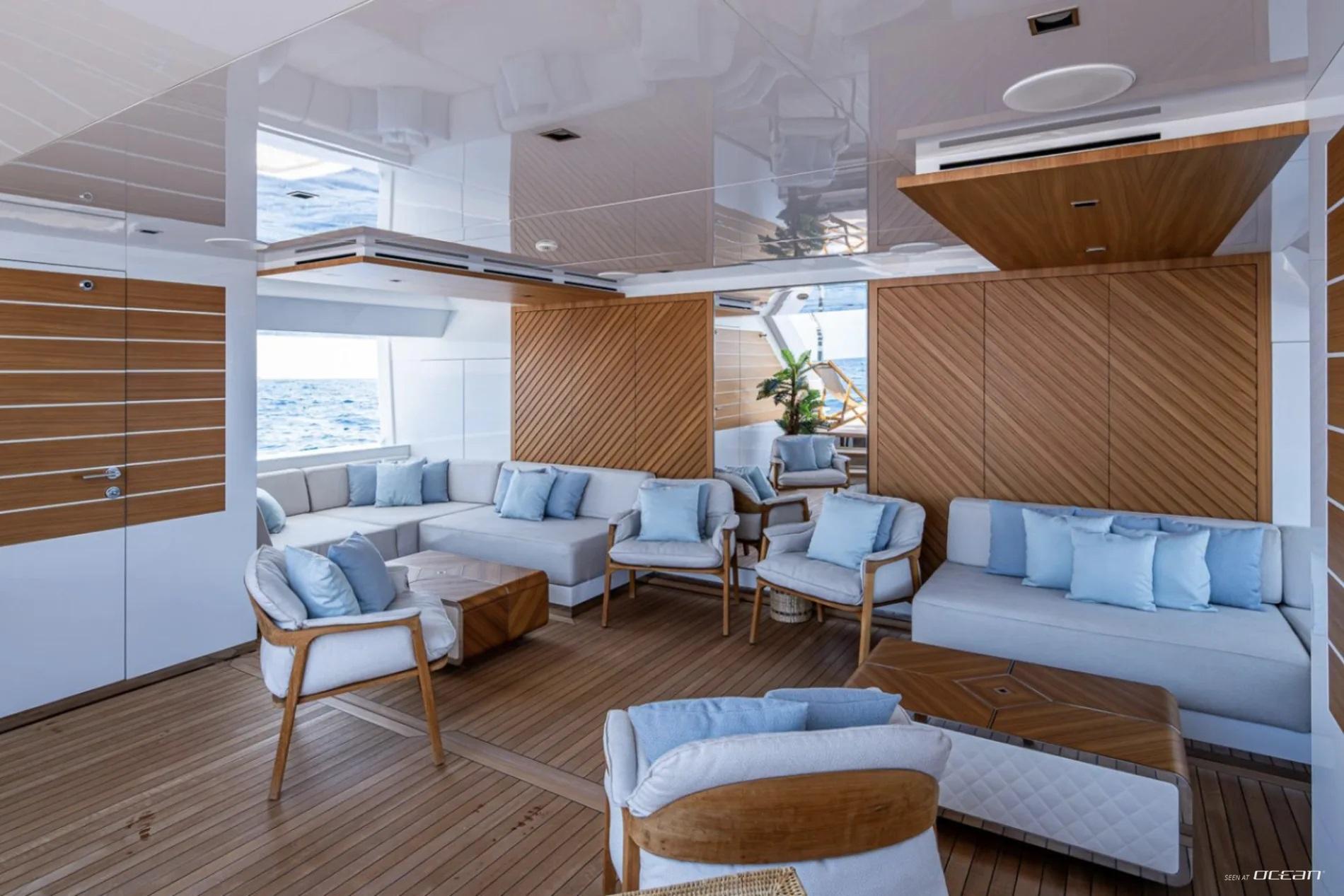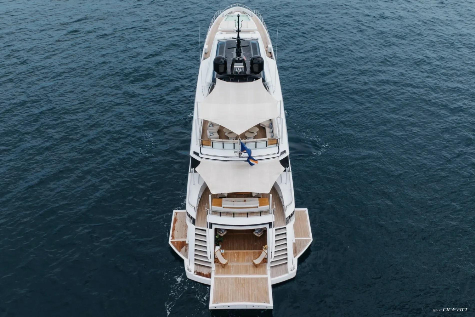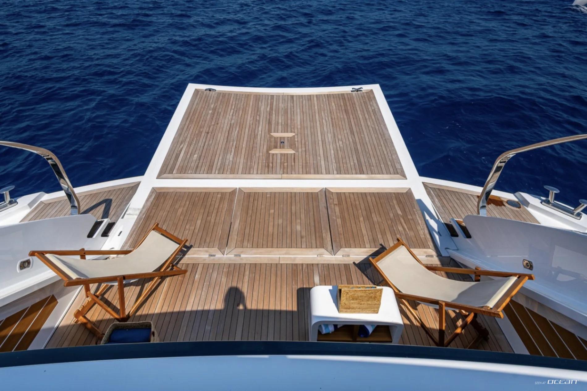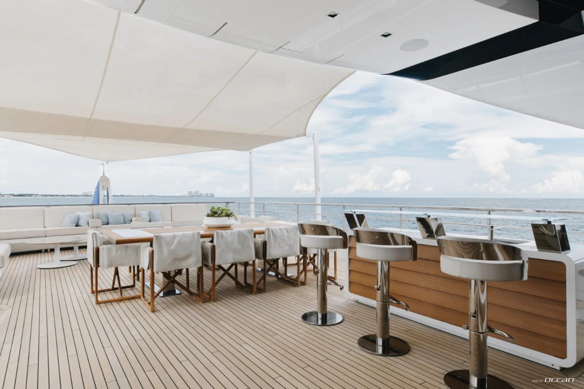 All cabins with en-suite bathrooms, automatic fold-down balcony in master cabin, air condition throughout, 2 generators, fully integrated state-of-the-art audio-visual systems, satellite television, Apple TV, Airplay iPad controllers, Starlink Wi-Fi internet, Samsung TV in salon, sky lounge, beach club, and in all cabins; glass pool/jacuzzi, gym equipment; large air-conditioned beach club with side platforms, dual TVs, and a fold-down transom adding a large swimming platform; BBQ grill, and a variety of water toys