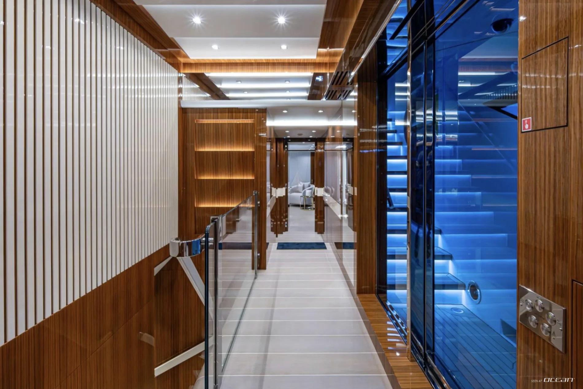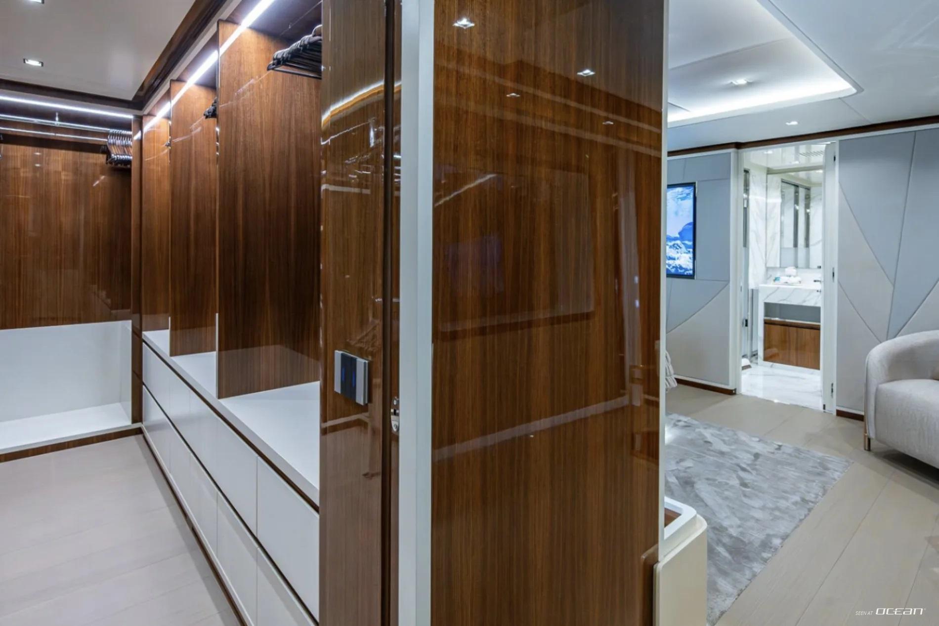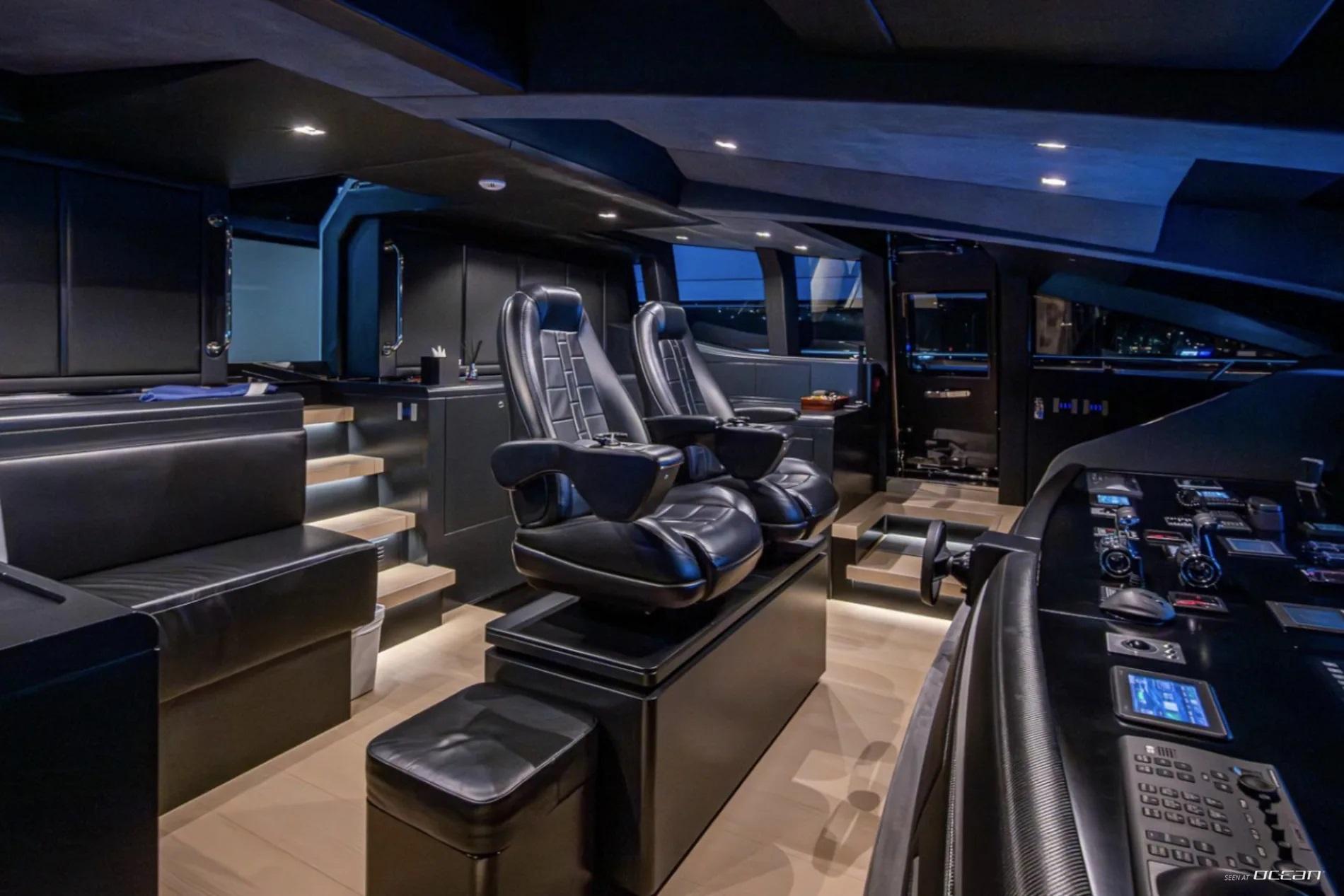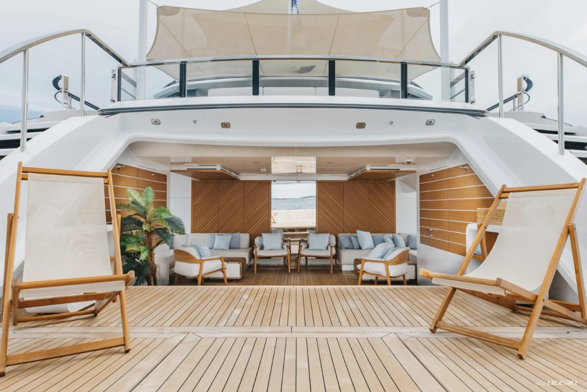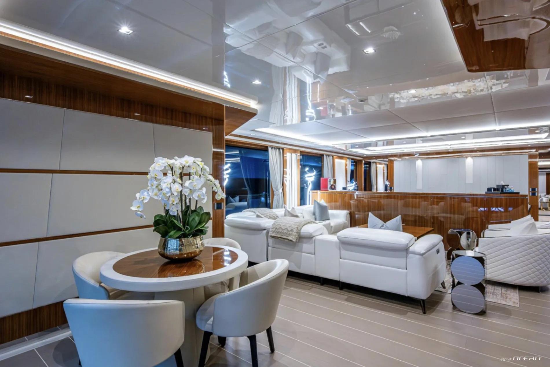 All cabins with en-suite bathrooms, automatic fold-down balcony in master cabin, air condition throughout, 2 generators, fully integrated state-of-the-art audio-visual systems, satellite television, Apple TV, Airplay iPad controllers, Starlink Wi-Fi internet, Samsung TV in salon, sky lounge, beach club, and in all cabins; glass pool/jacuzzi, gym equipment; large air-conditioned beach club with side platforms, dual TVs, and a fold-down transom adding a large swimming platform; BBQ grill, and a variety of water toys