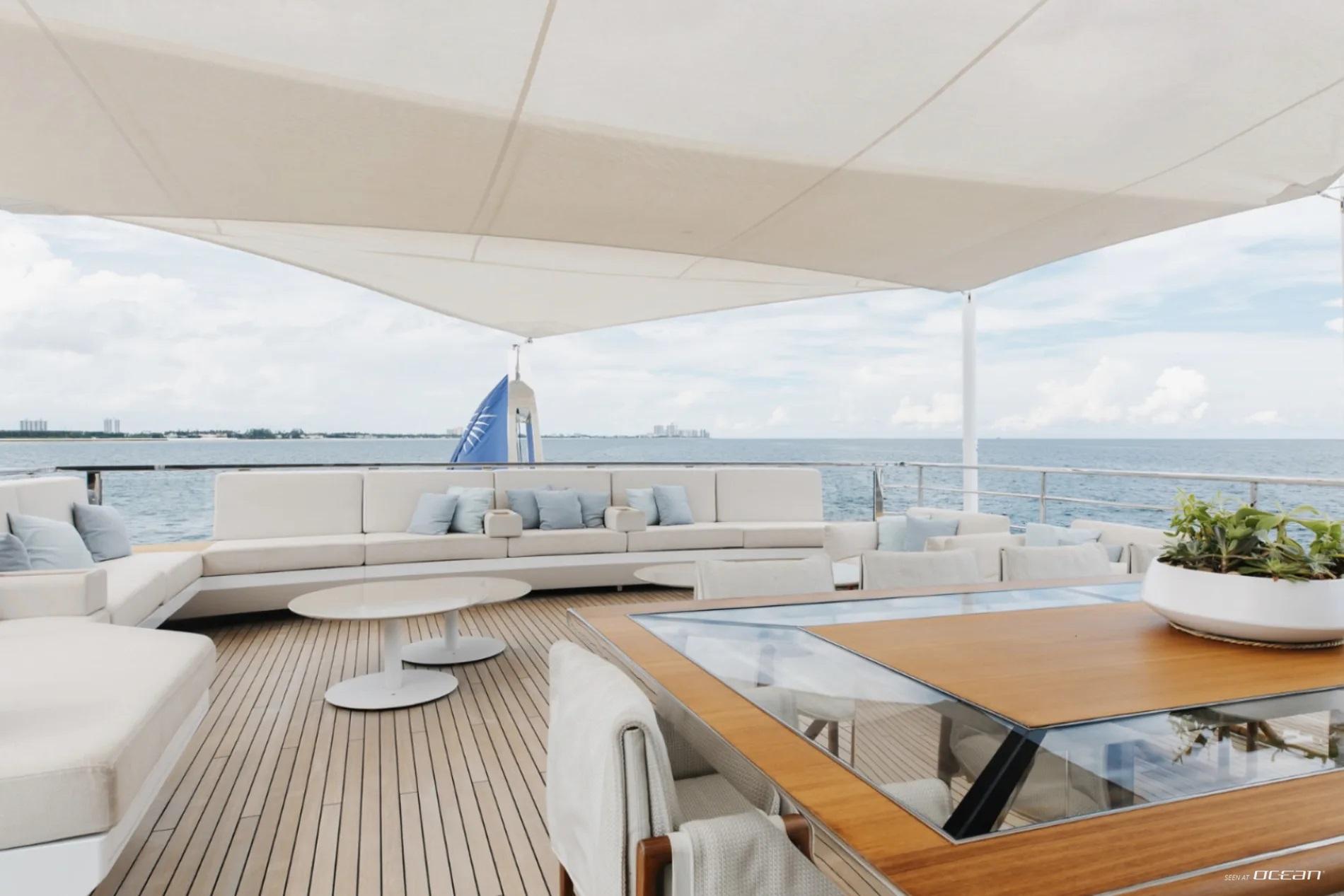 GOLDENEYE for charter is centered around exceptional outdoor spaces, anchored by an expansive, air-conditioned beach club that opens directly to the water via side platforms and a fold-down transom. This versatile zone doubles as a waterside lounge with integrated entertainment, while the main deck aft offers relaxed dining and lounging areas subtly separated by bespoke cabinetry with pop-up screens. Forward, generous sunpads flow naturally toward a glass-enclosed pool, forming a striking panoramic retreat.