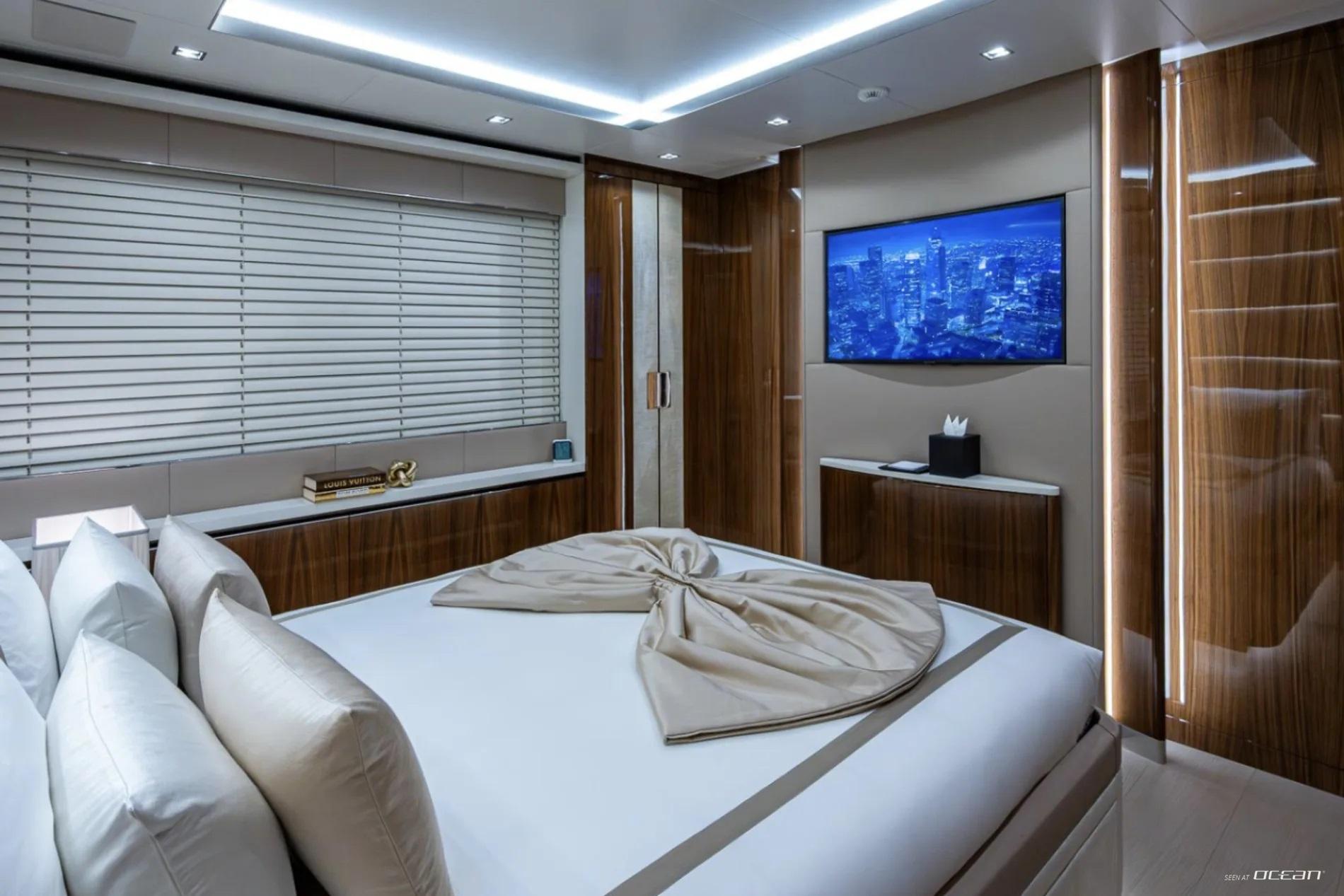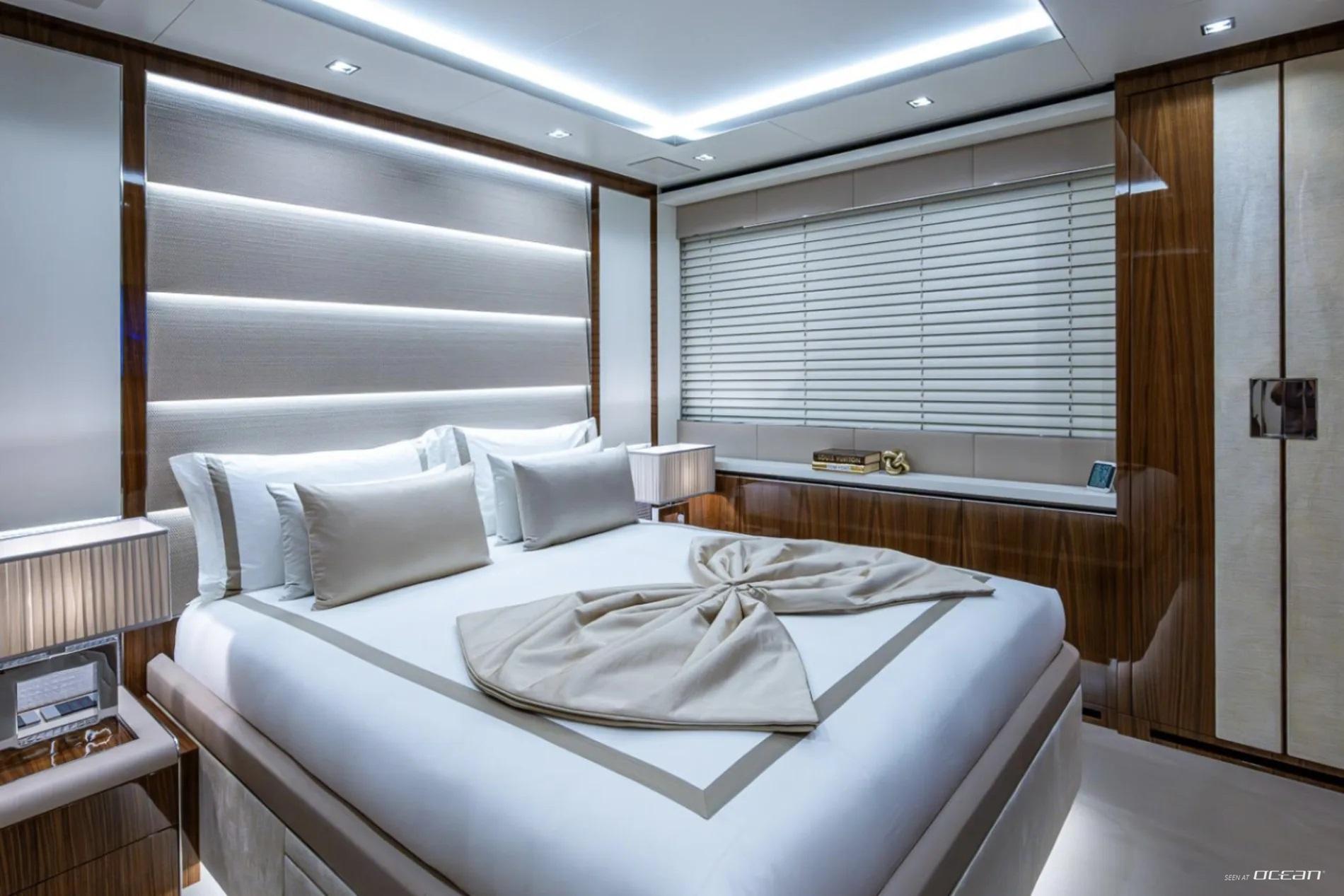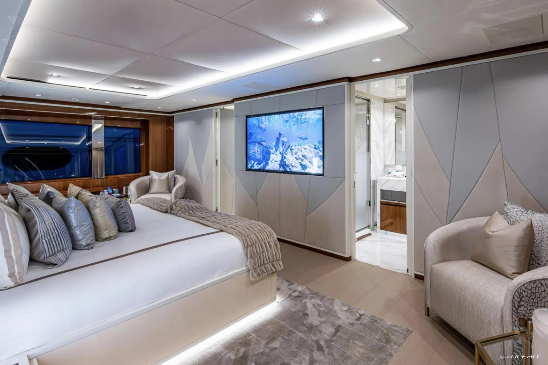 Accommodation aboard Charter Yacht GOLDENEYE is arranged across 6 deluxe cabins, welcoming up to 12 guests in comfort and privacy. The main deck master suite enjoys a full-beam layout and a private hydraulic sea terrace featuring a glass floor panel for uninterrupted ocean views. Below deck, 2 VIP cabins and 4 twin cabins provide flexibility for families or mixed charter groups. All staterooms are equipped with ensuite bathrooms, smart TVs with Apple TV, Starlink connectivity, and intuitive iPad-controlled systems.