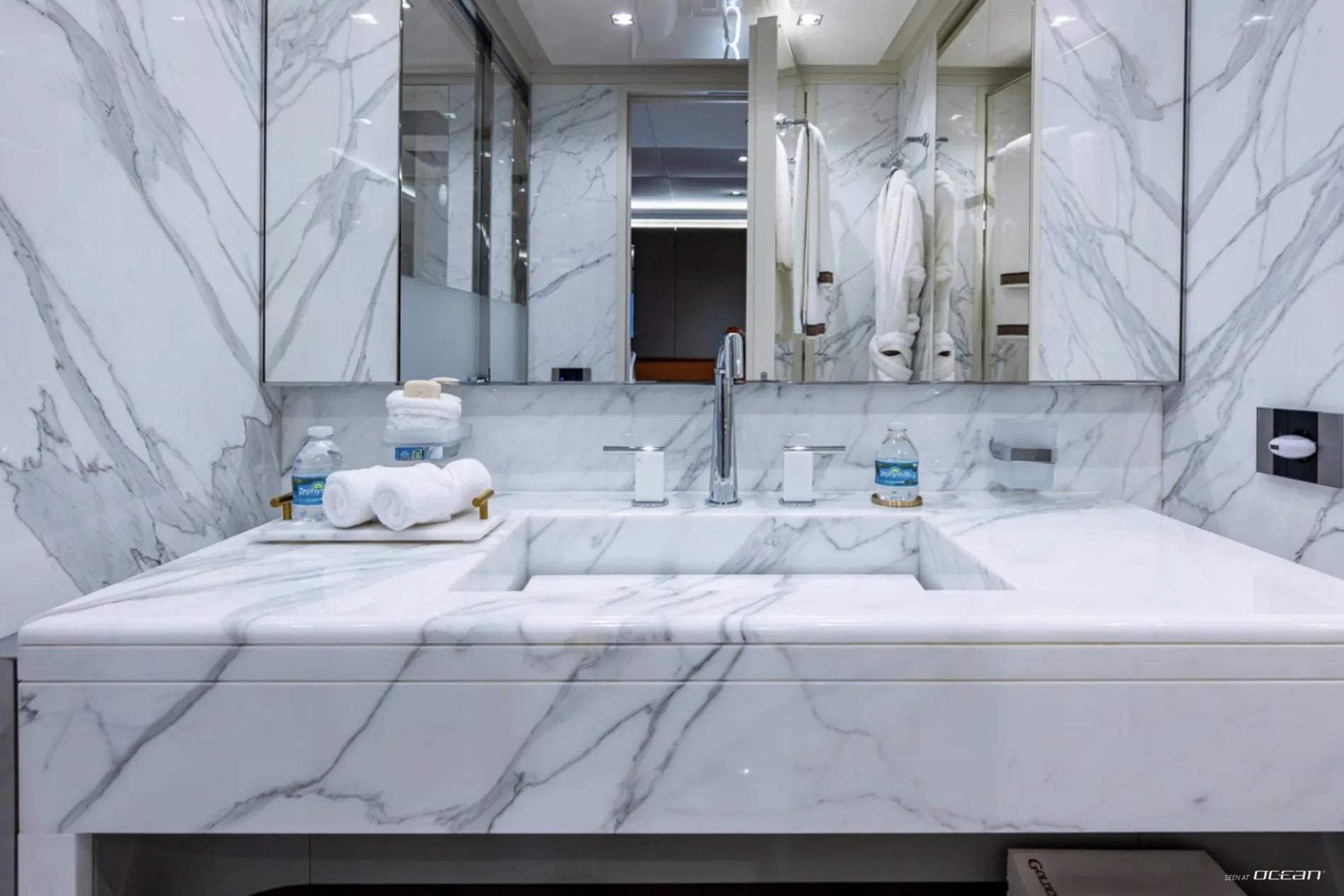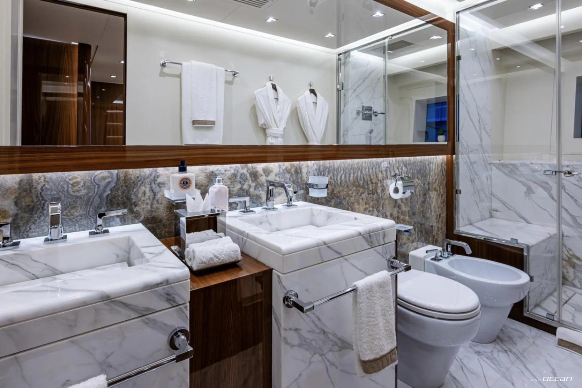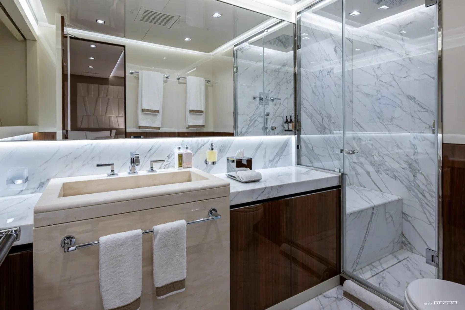 Accommodation aboard Charter Yacht GOLDENEYE is arranged across 6 deluxe cabins, welcoming up to 12 guests in comfort and privacy. The main deck master suite enjoys a full-beam layout and a private hydraulic sea terrace featuring a glass floor panel for uninterrupted ocean views. Below deck, 2 VIP cabins and 4 twin cabins provide flexibility for families or mixed charter groups. All staterooms are equipped with ensuite bathrooms, smart TVs with Apple TV, Starlink connectivity, and intuitive iPad-controlled systems.