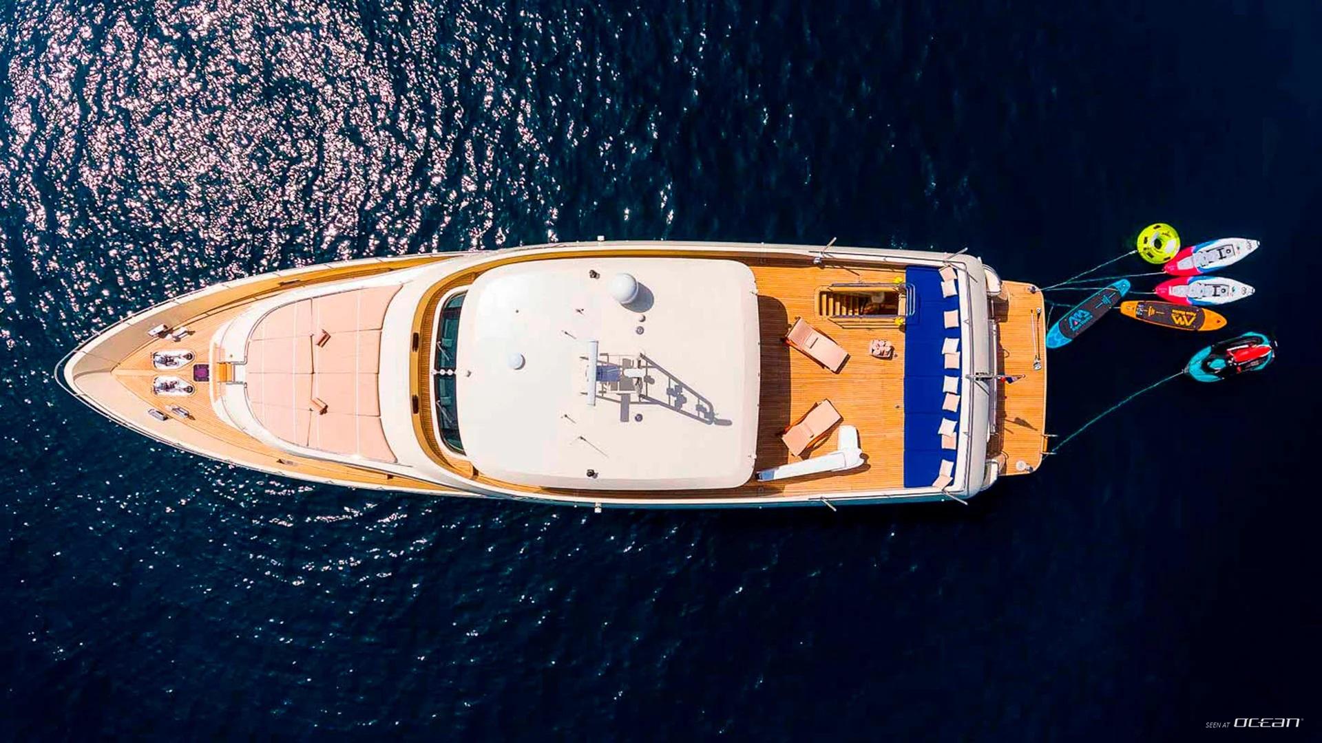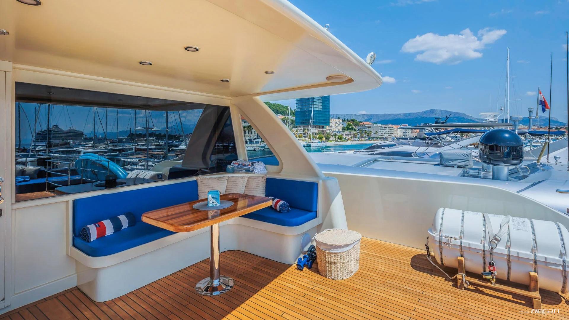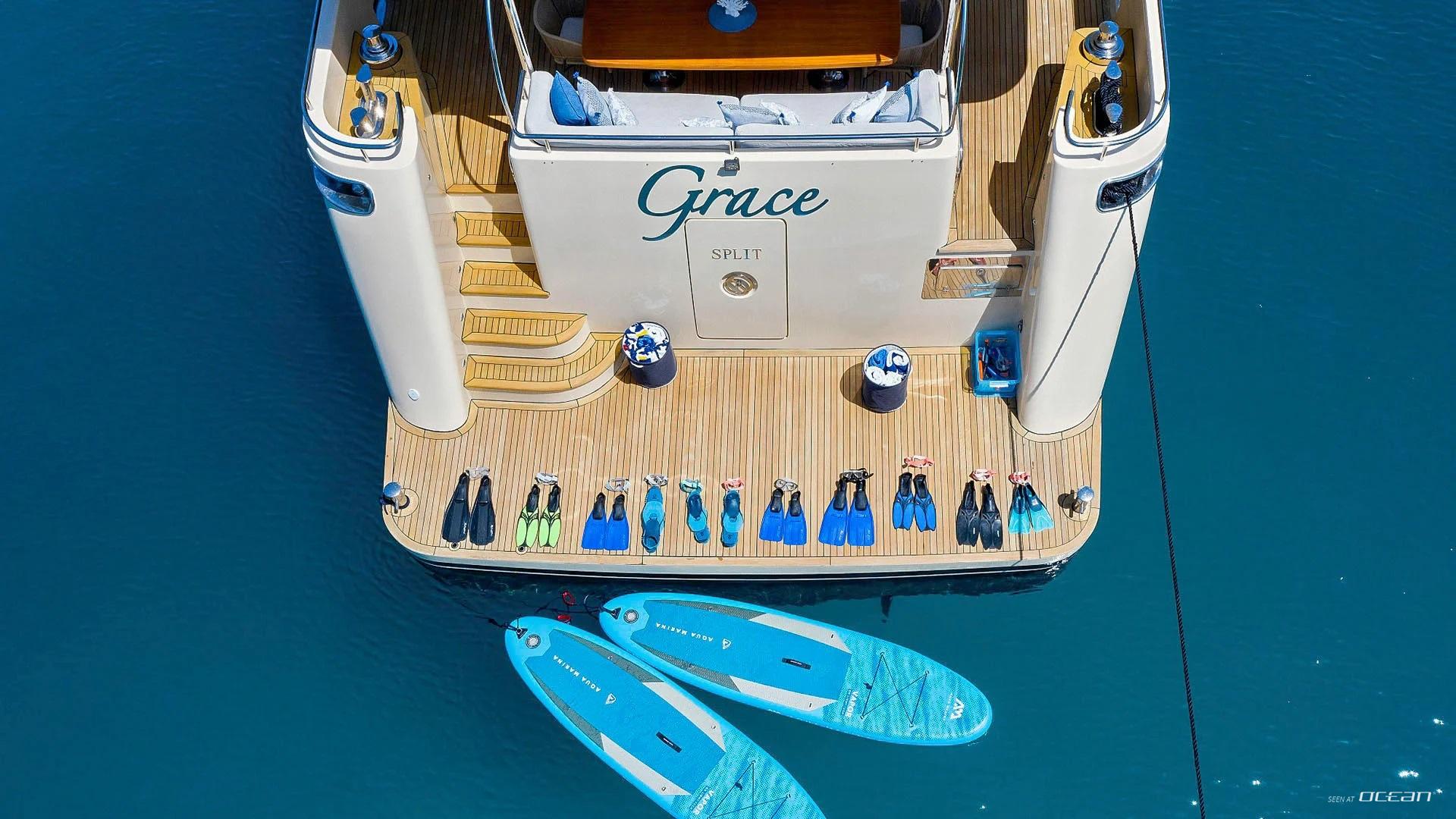 Her spacious flybridge is designed for an effortless outdoor lifestyle, featuring sun loungers, a cozy lounging area, wet bar, and an alfresco table ideal for afternoons in the breeze. This upper deck becomes a favorite retreat while cruising between bays and islands. Luxury motor yacht GRACE carries a fun set of water toys, including a Highfield tender with 150hp engine, jet ski, Seabob, waterskis, 2 SUPs, and more. Combined with the warm service of her crew of 4, she offers a dynamic environment for both relaxation and activity throughout the Adriatic.