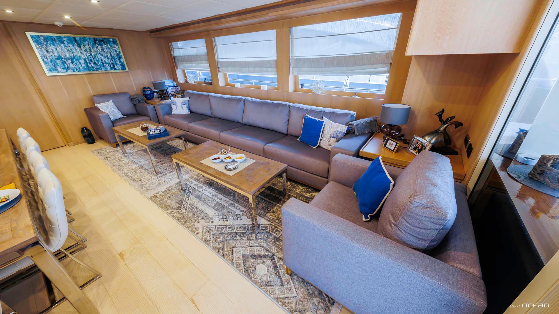 Her salon is bright and modern, benefiting from wide windows that create a light-filled atmosphere throughout the main deck. The lounge flows into a dining space designed for 10 guests, offering a refined setting for meals at anchor or underway. A flat screen TV complements the main seating area, while the upper deck features a quiet media room for relaxed viewing. The interior palette emphasizes soft tones, creating a calm ambiance for unwinding after island exploring.