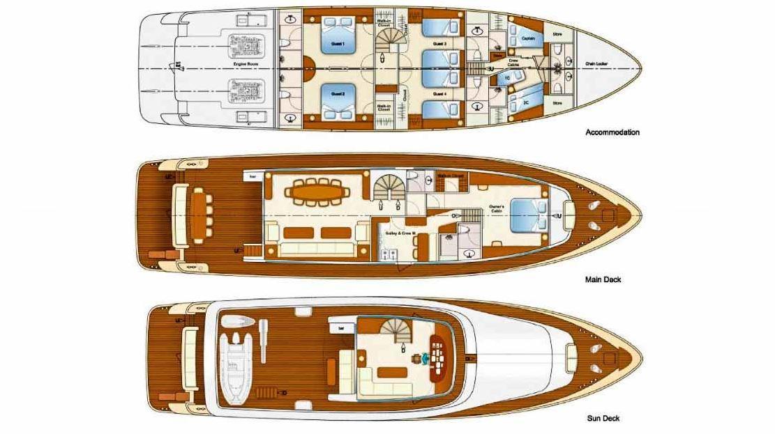 Cabin configuration: 1 master, 2 double and 2 twin cabins