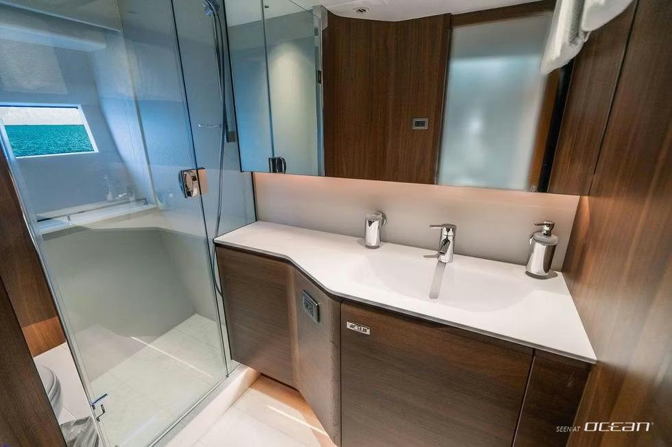 En-suite bathrooms in all cabins, air condition throughout, generator, watermakers, stabilizers underway and at anchor, jacuzzi, TV in salon all cabins, Starlink Wi-Fi internet, Bluetooth sound system with outdoor speakers, music and movie library, gym gear, hydraulic lifting swimming platform, and a variety of water toys.