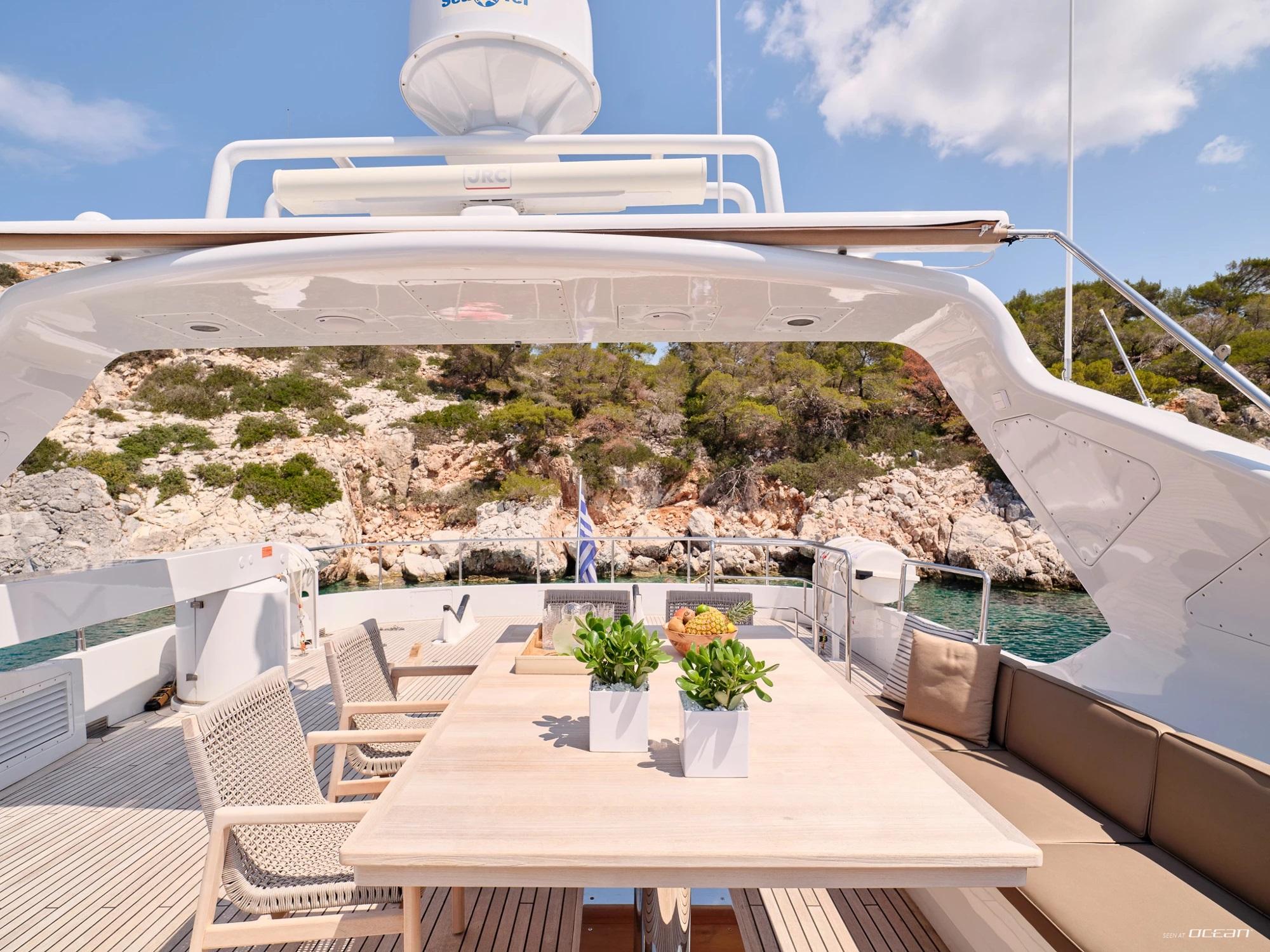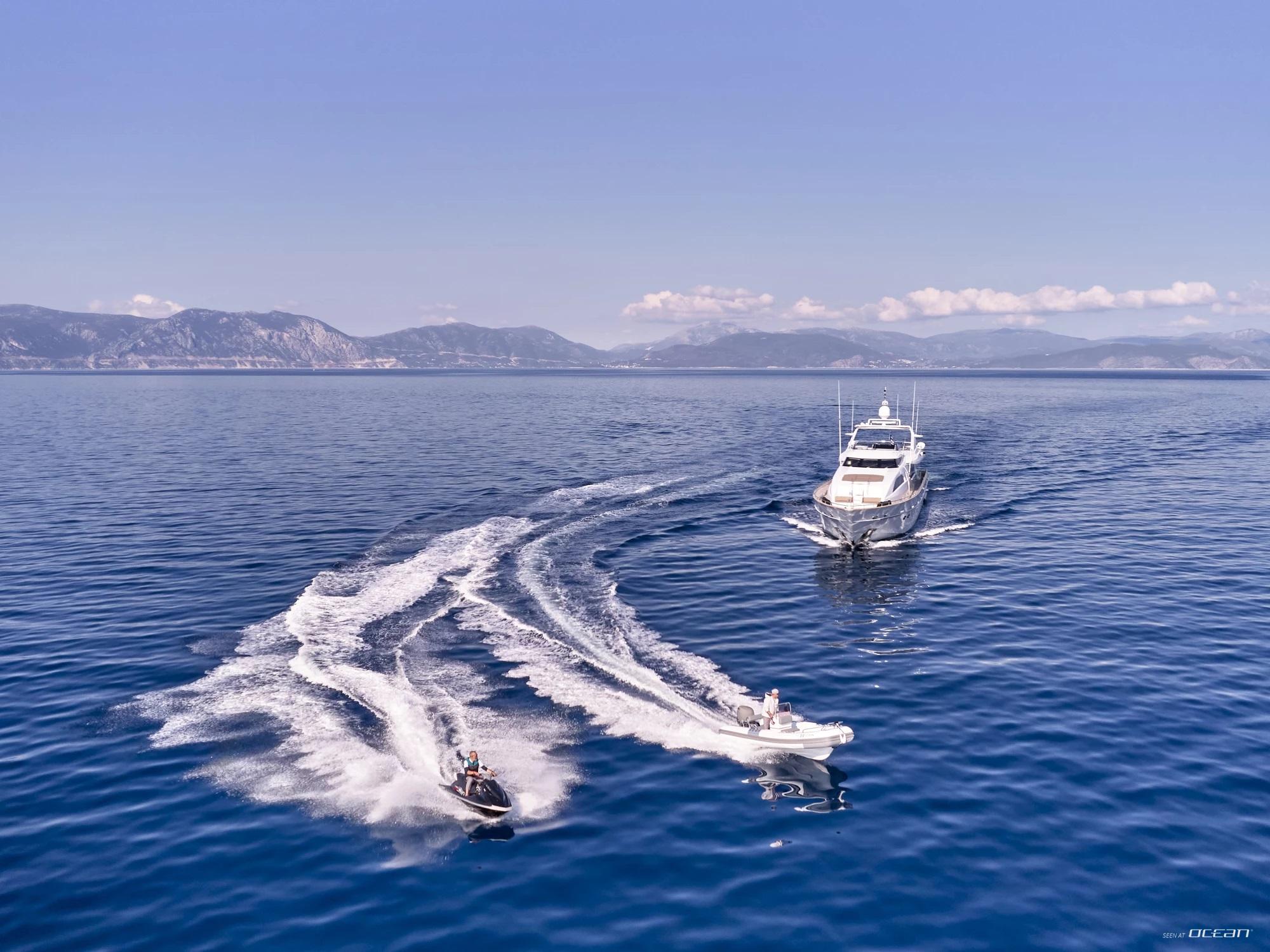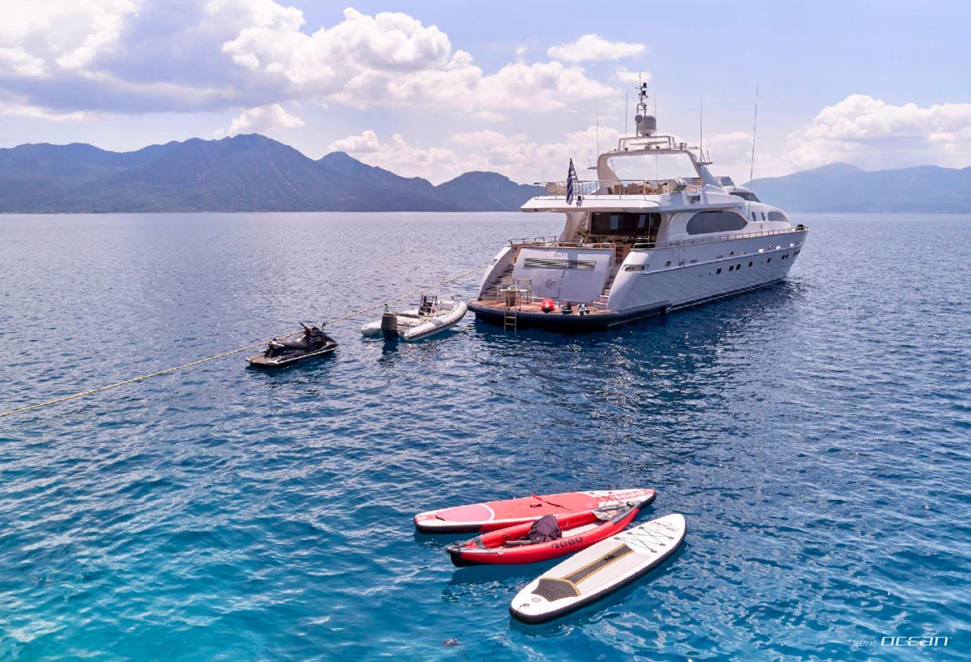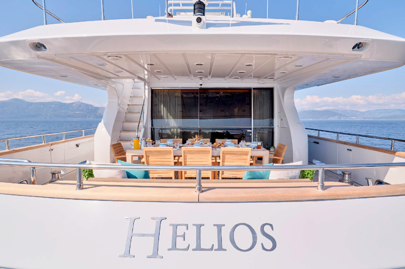 HELIOS luxury motor yacht for charter ensures a seamless combination of adventure and relaxation. Her wide swimming platform provides easy access to the sea and to an array of water toys, including a Seabob F5, Yamaha waverunner, kayaks, and paddleboards. Equipped with stabilizers underway, she guarantees smooth cruising between the Greek islands. A dedicated crew of 6, led by an experienced Captain, delivers exceptional service and local expertise, ensuring every stay aboard HELIOS is truly unforgettable.
