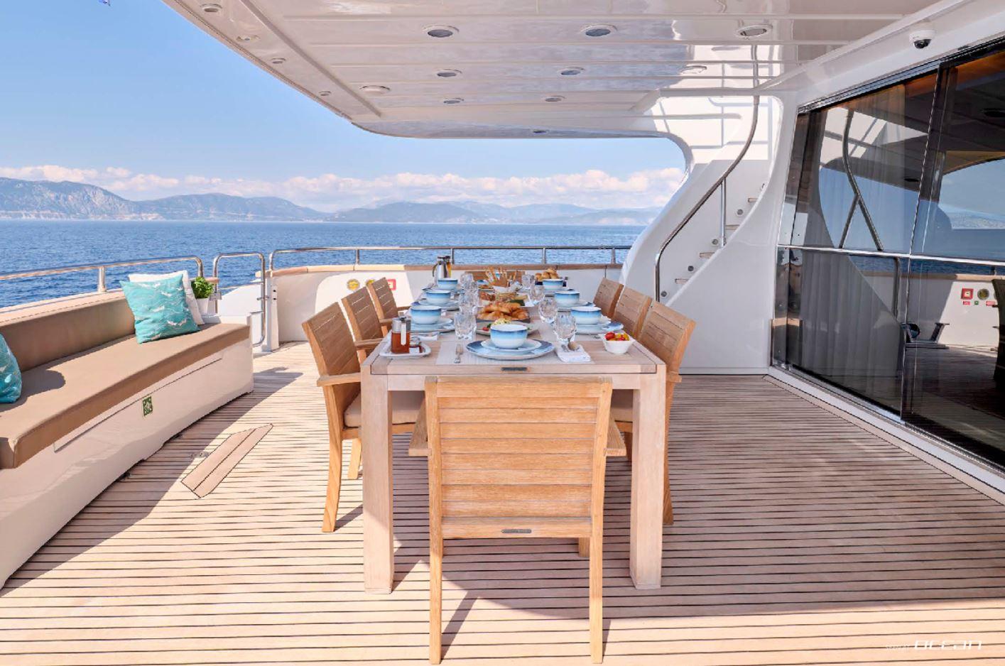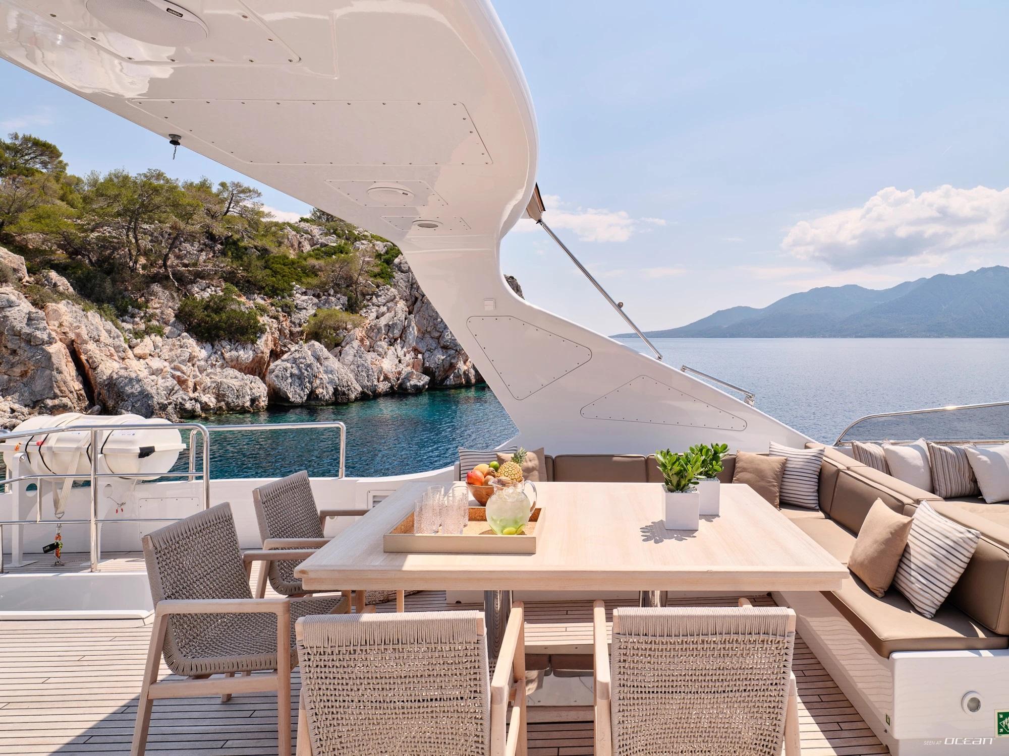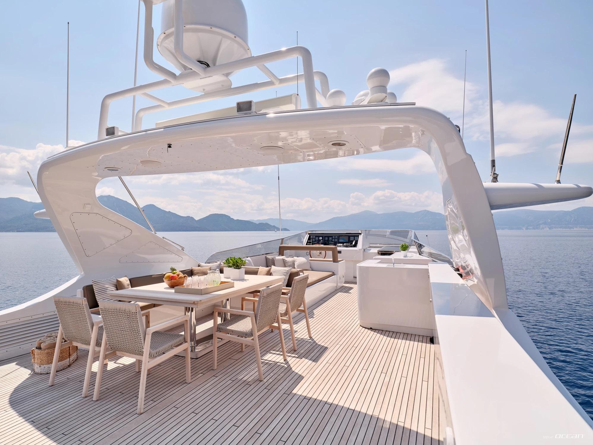 Life aboard HELIOS celebrates outdoor enjoyment. The spacious sundeck features an electric Bimini that can provide full shade throughout the day, while the aft deck easily adapts for sun or wind protection. Perfect for al fresco dining, lounging, or evening gatherings, each deck space has been carefully crafted for both comfort and elegance.