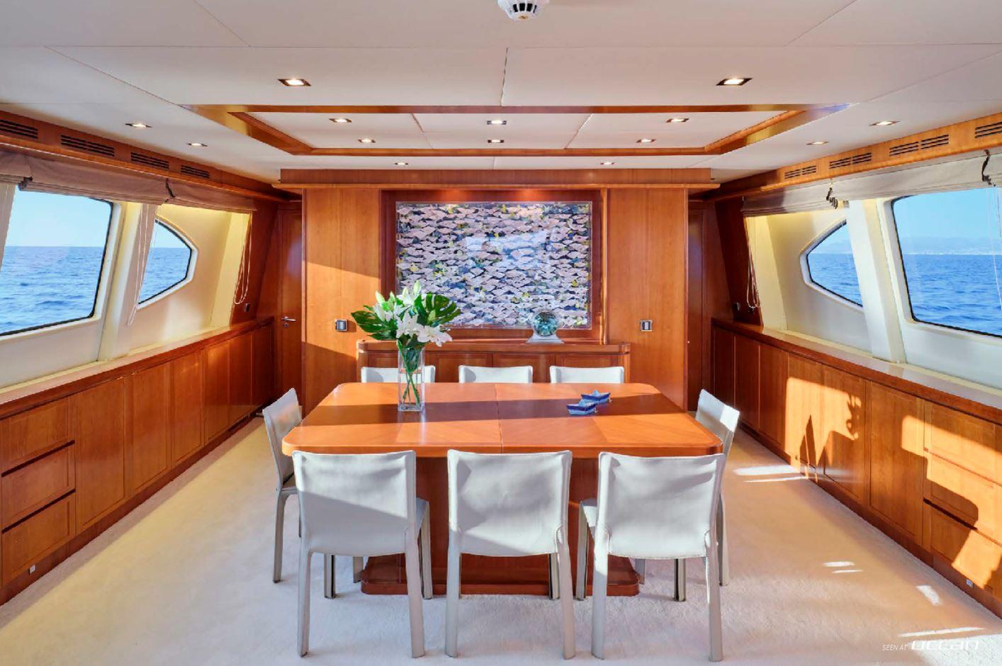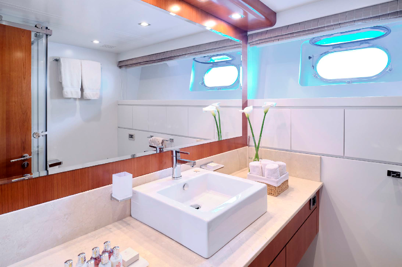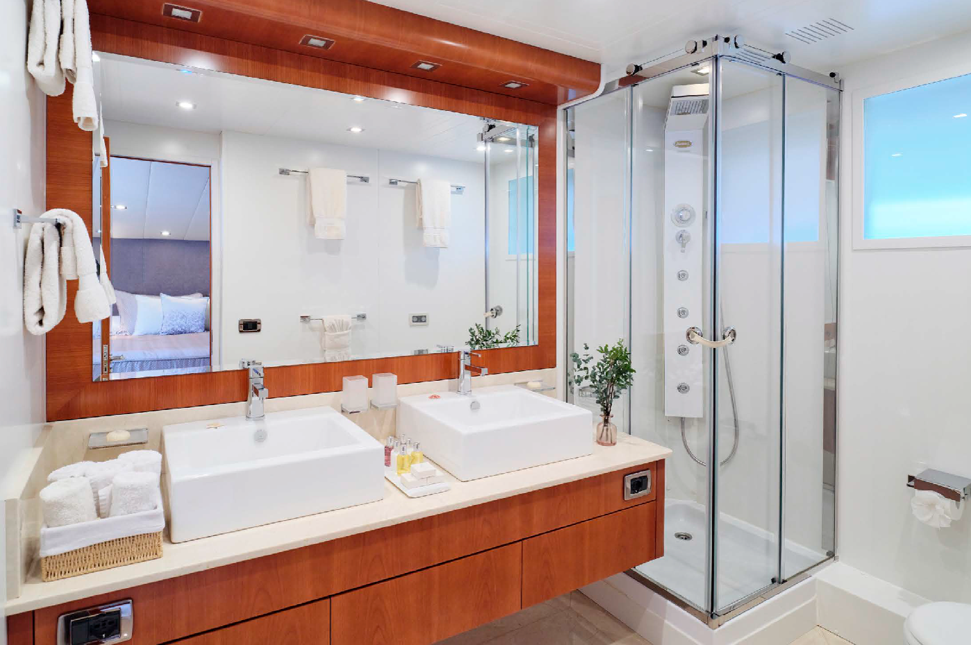 En-suite bathrooms in all cabins, air condition throughout, 2 generators, stabilizers underway, bow thruster, watermakers, ice makers, Starlink Wi-Fi internet, mini bar in master cabin, VIP cabin, on upper deck and in saloon, safety boxes in all cabins, smart TVs in all cabins, AV home cinema and music system with integrated Heos App, Wi-Fi and Bluetooth, Apple TV, PlayStation 4, music and movies library, swimming platform, stern/cockpit shower and a variety of water toys.