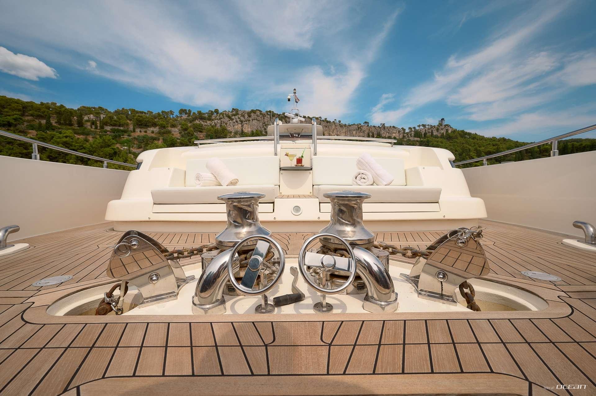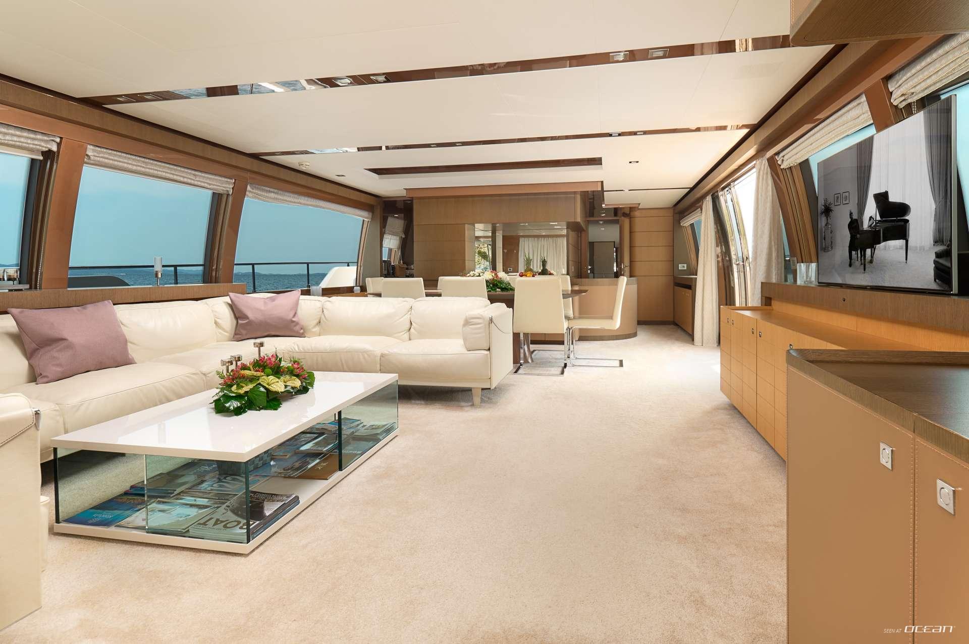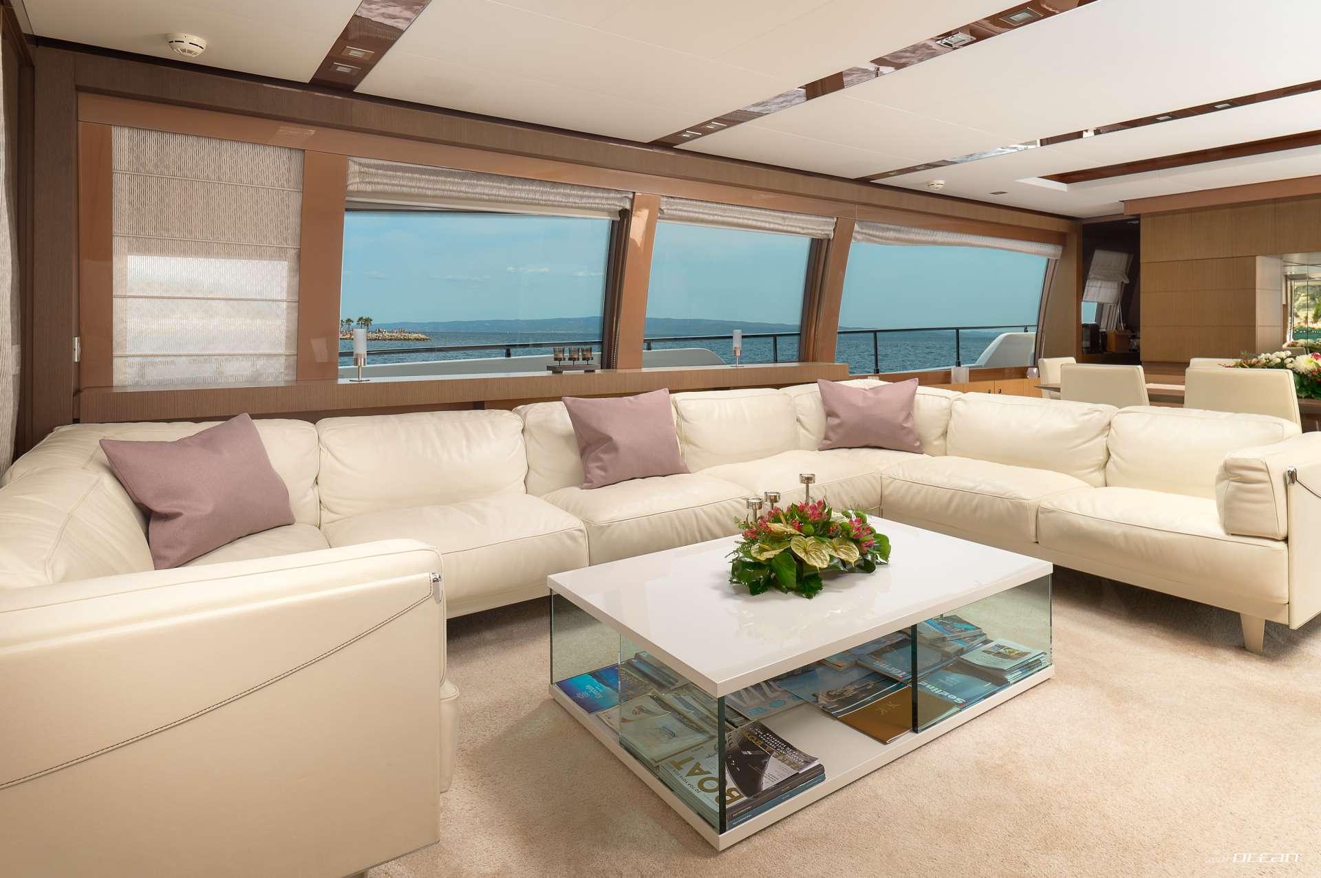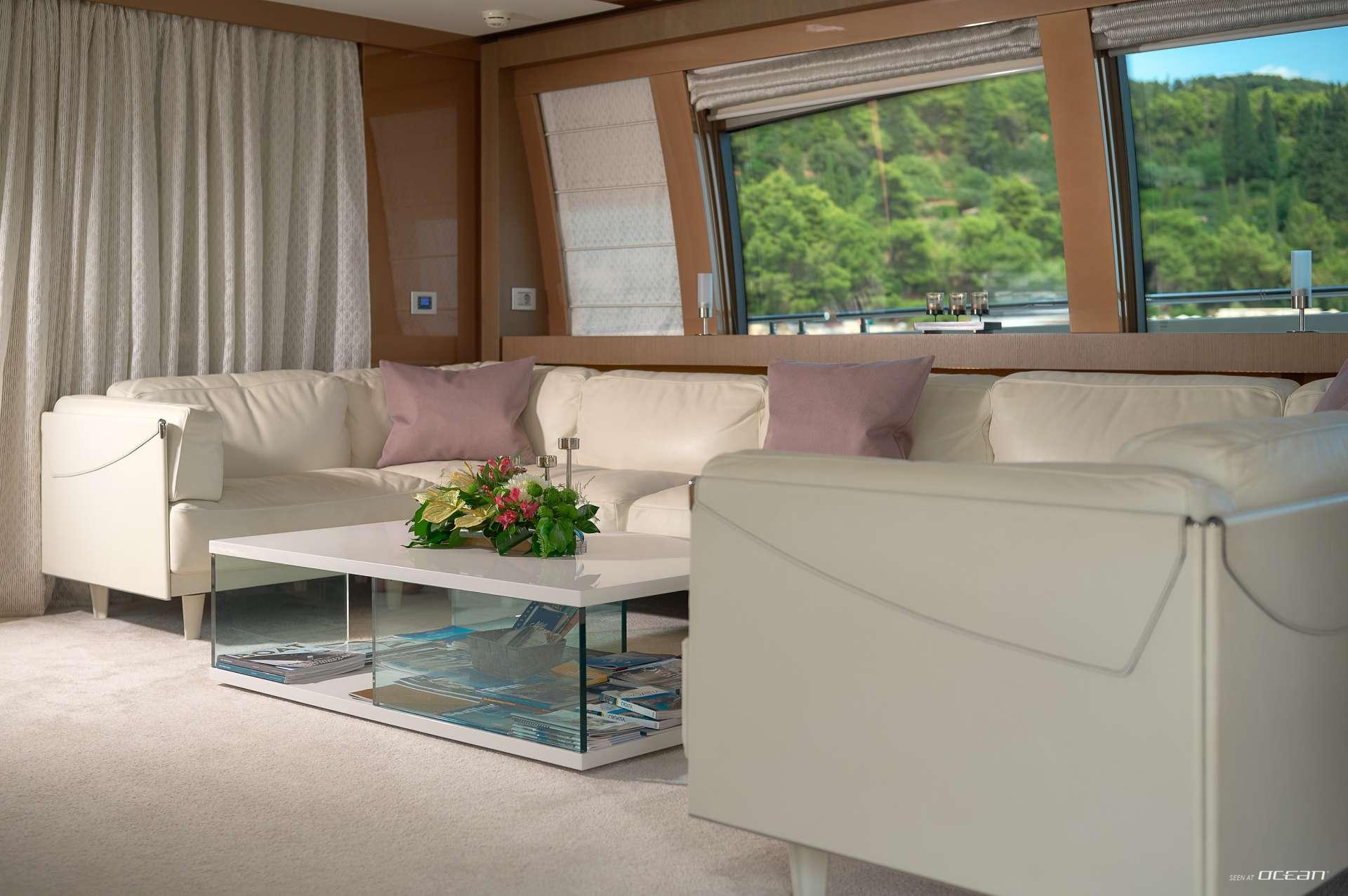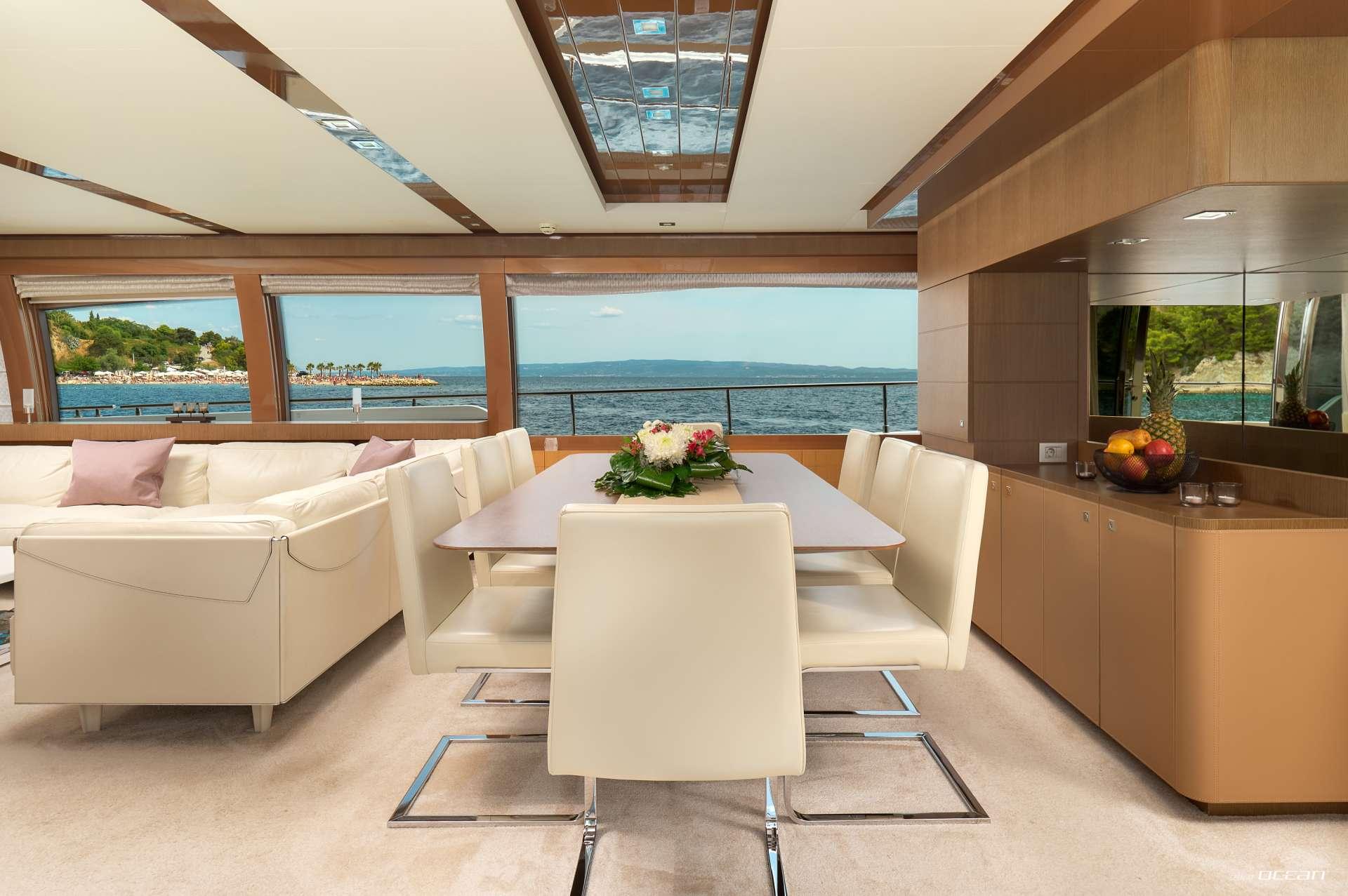 IVA welcomes up to 10 guests in beautifully appointed interiors featuring modern materials, warm tones, and a harmonious open flow. Her main deck salon offers panoramic windows and plush seating, creating a bright and inviting social hub. Outdoor living is equally impressive, with a sea-level aft deck, spacious flybridge, and forward sunpads perfect for sunset cruising. Every space has been designed to maximize relaxation, enhancing the overall charter experience.