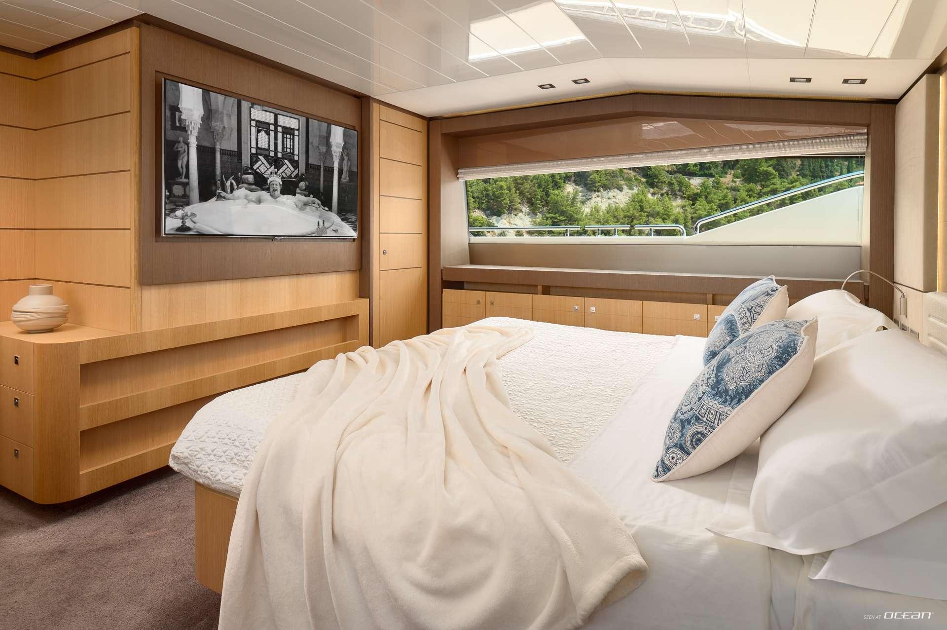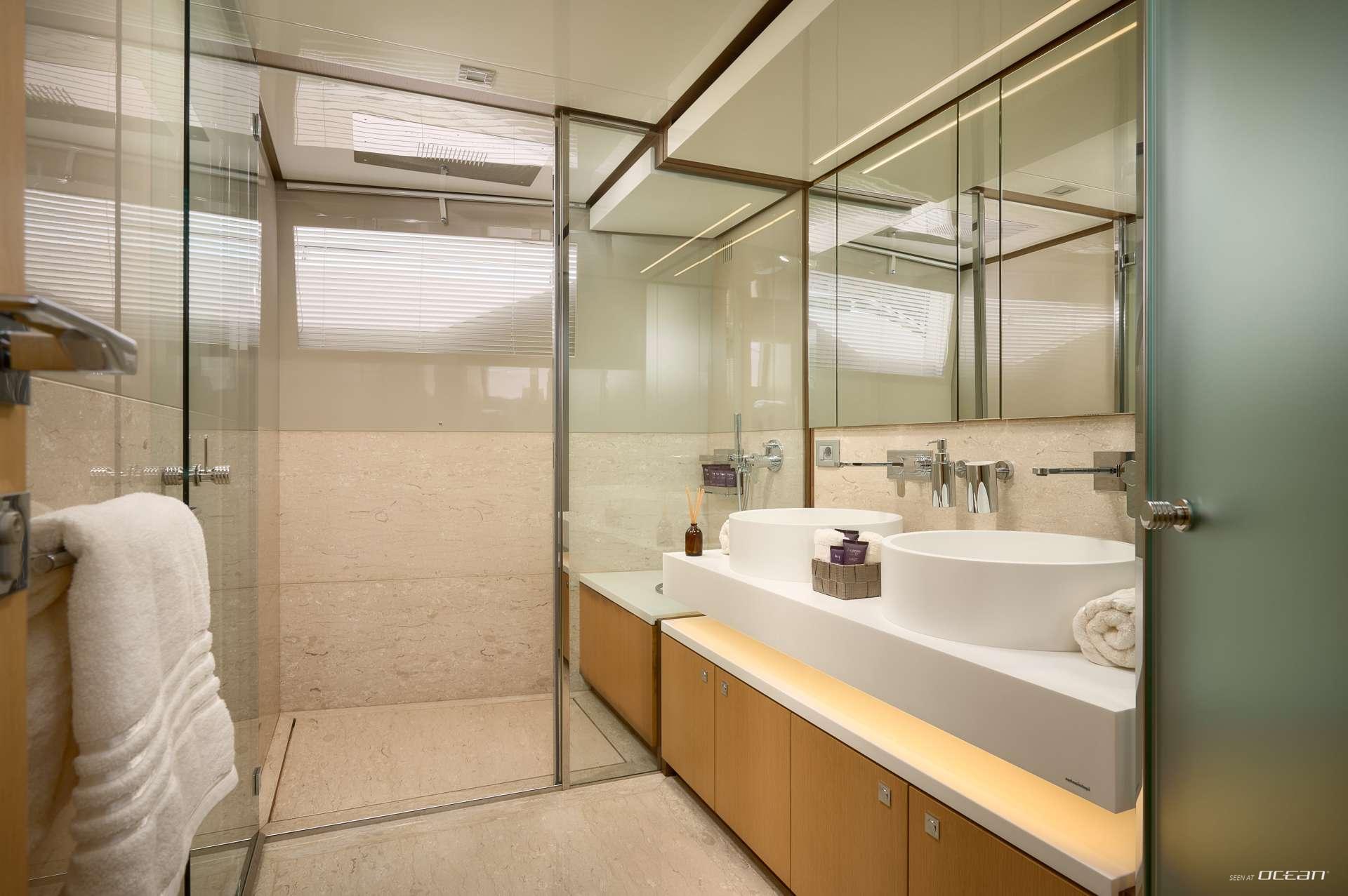 IVA luxury motor yacht for charter accommodates guests in 5 ensuite cabins, including a full-beam master suite conveniently positioned on the main deck. The lower deck hosts two VIP cabins and two twin cabins that convert to doubles, offering complete flexibility for groups. Each cabin features modern amenities, ample storage, and elegant finishes. This thoughtful configuration makes IVA Ferretti 960 for charter appealing for both families and mixed groups.