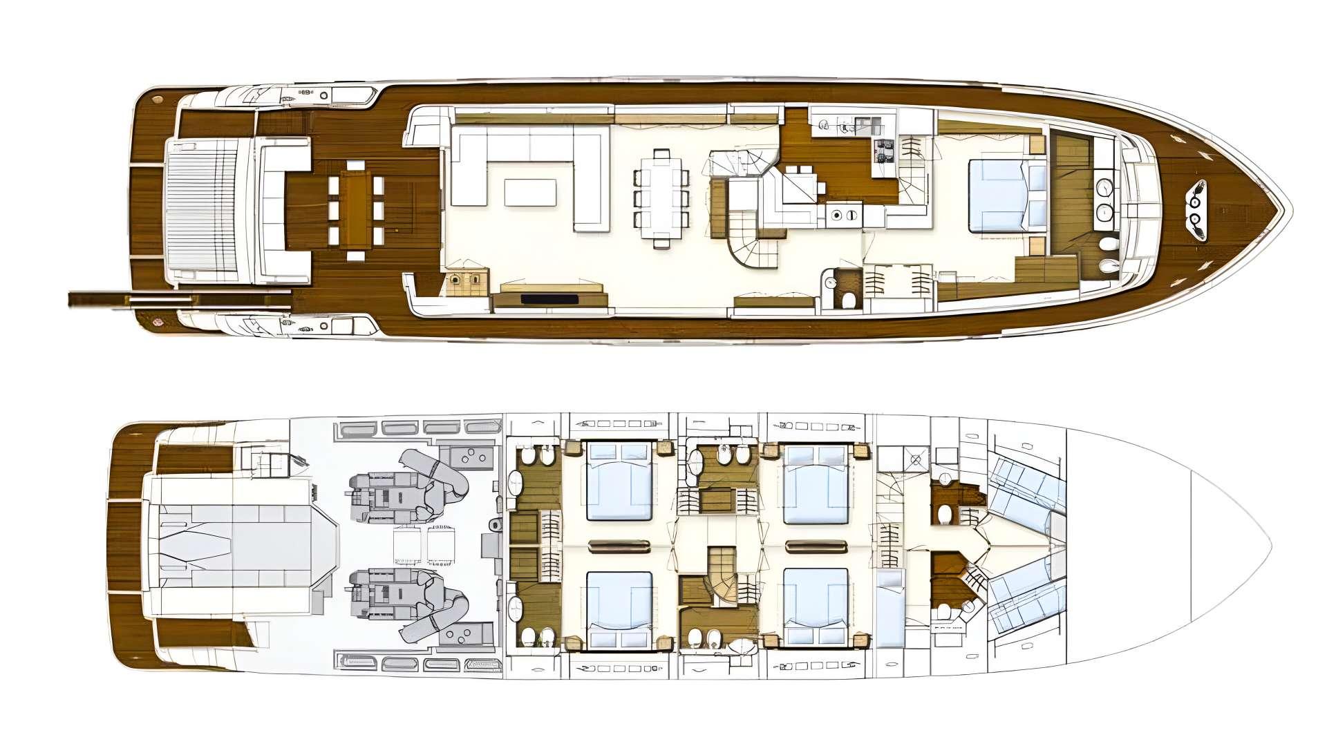 Cabin configuration: 1 master, 2 double and 2 twin cabins (the layout image shows 4 double cabins, but there are 2 double and 2 twin cabins)