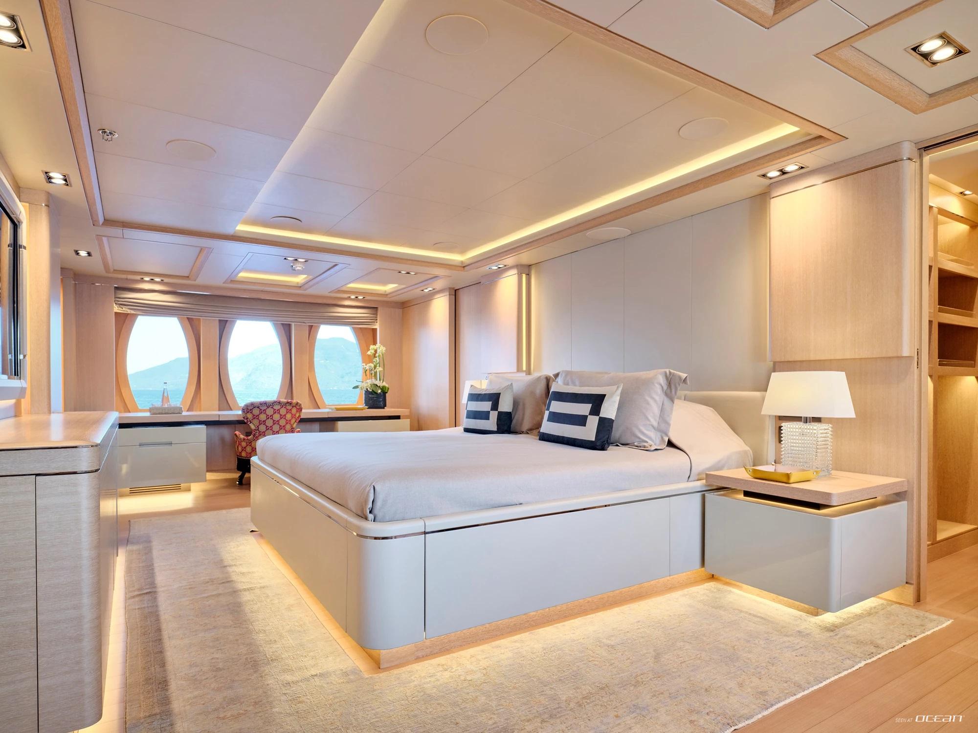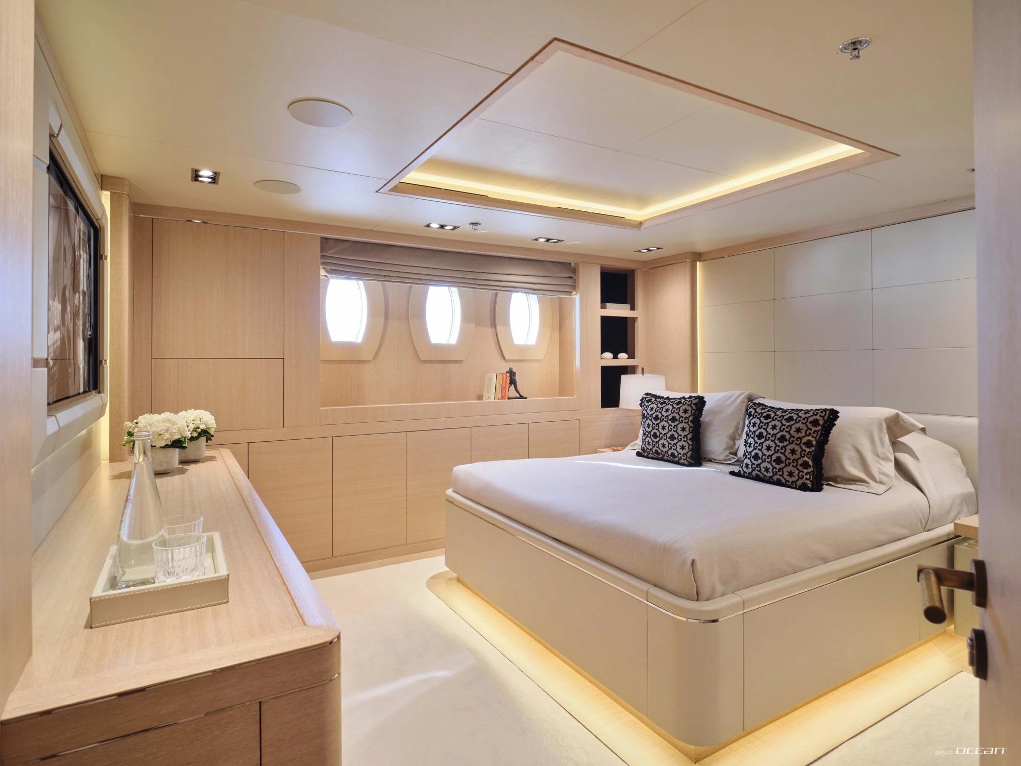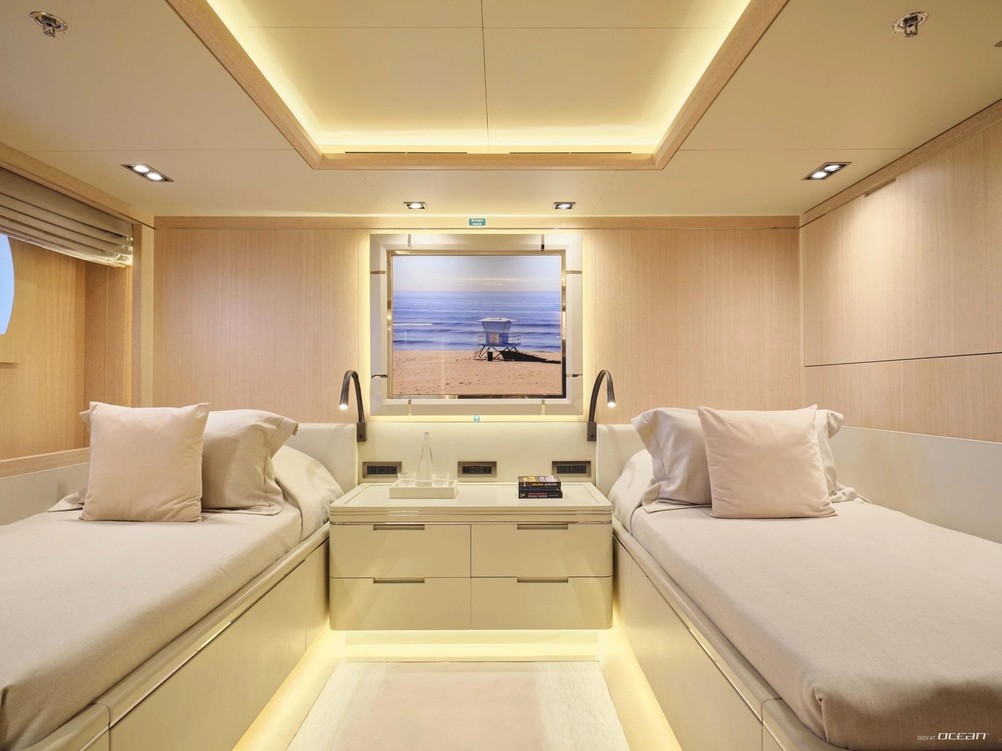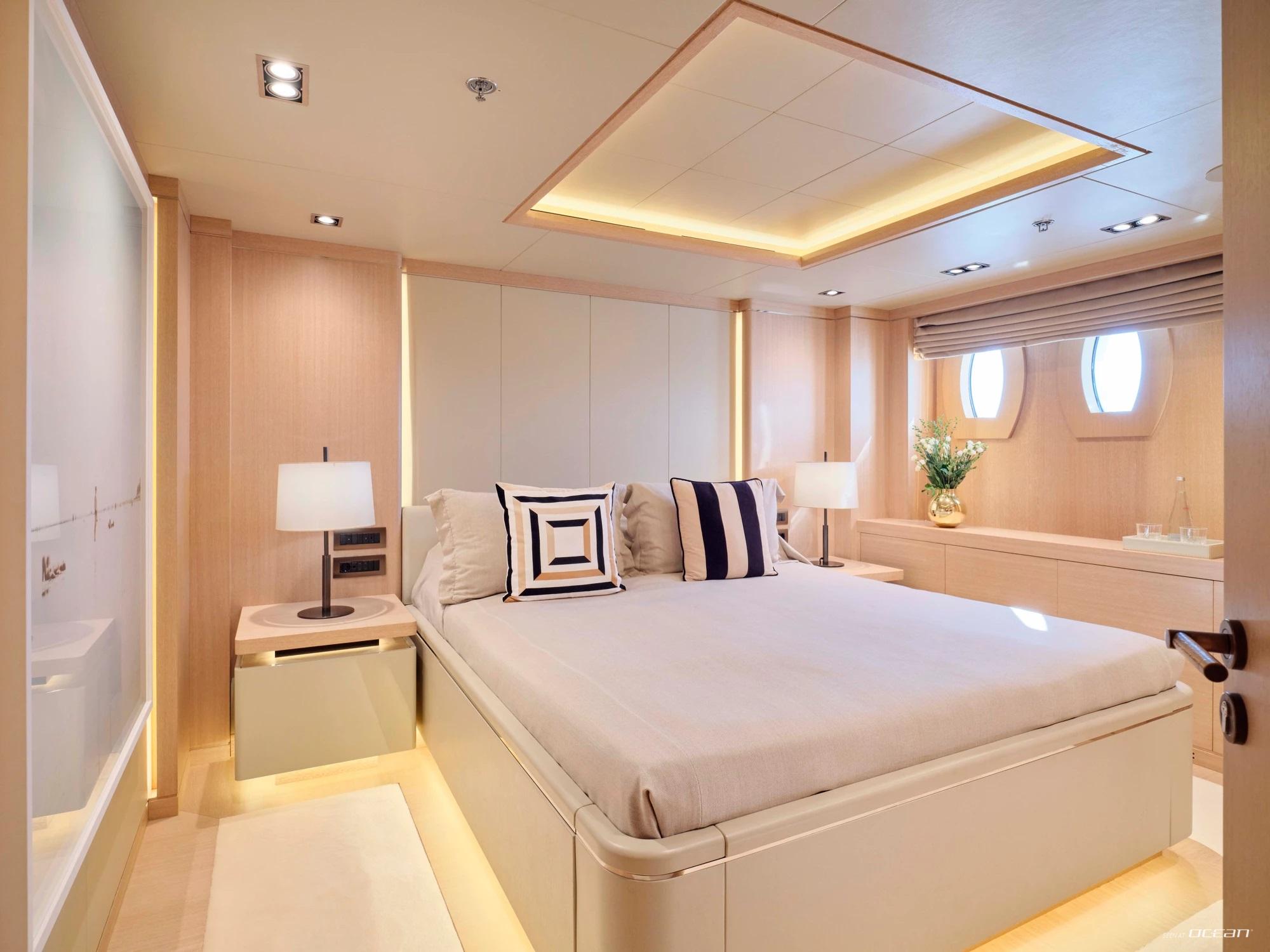 JAZ accommodates 12 guests in six sumptuous staterooms. The Owner's Suite boasts a king-size bed and a walk-in wardrobe, while below deck are double staterooms with queen beds and a twin stateroom with an additional Pullman berth. All cabins feature en-suite facilities and are designed for restful privacy. With a dedicated crew of 11, JAZ provides attentive, professional service, ensuring a seamless luxury motor yacht charter in Greece.