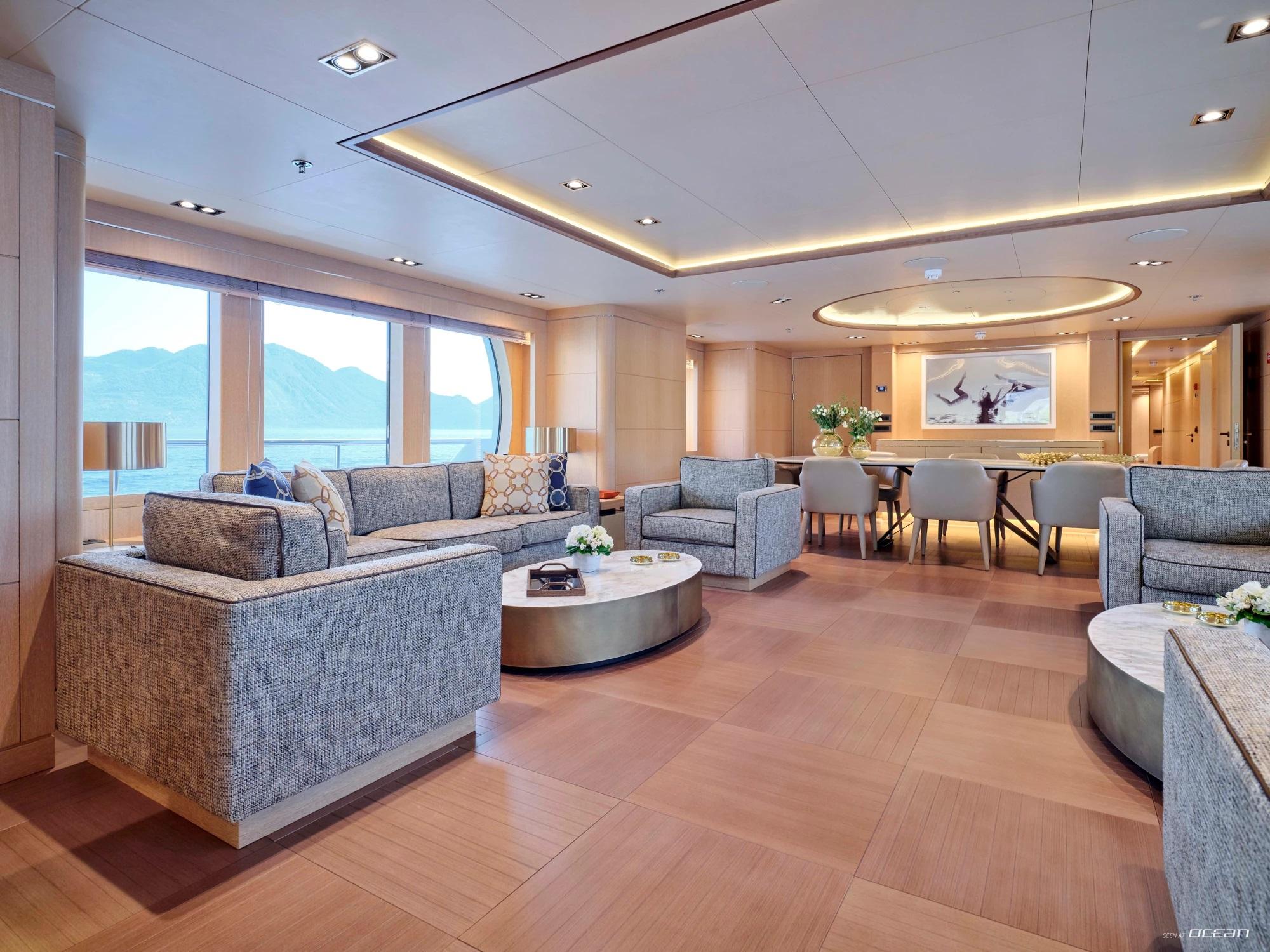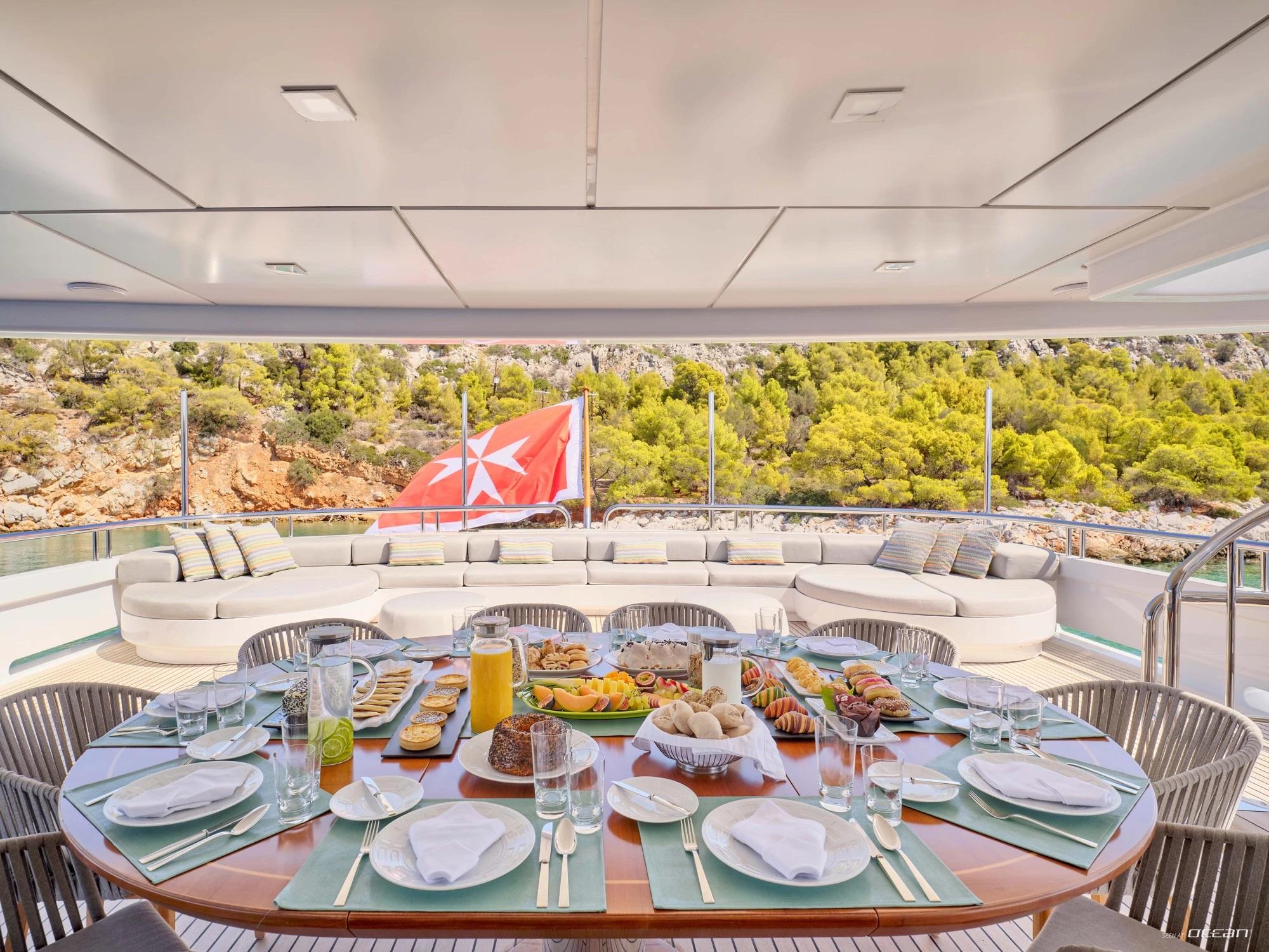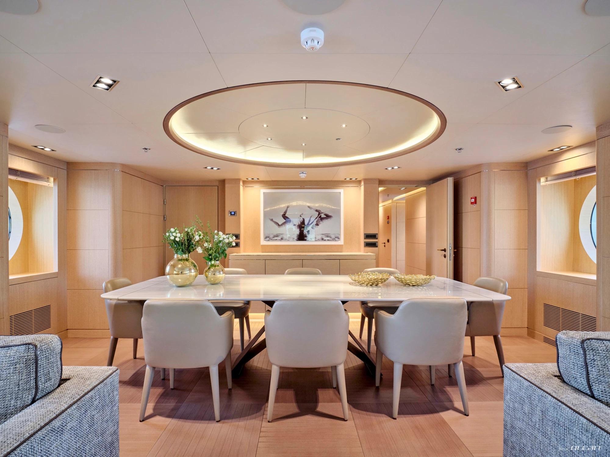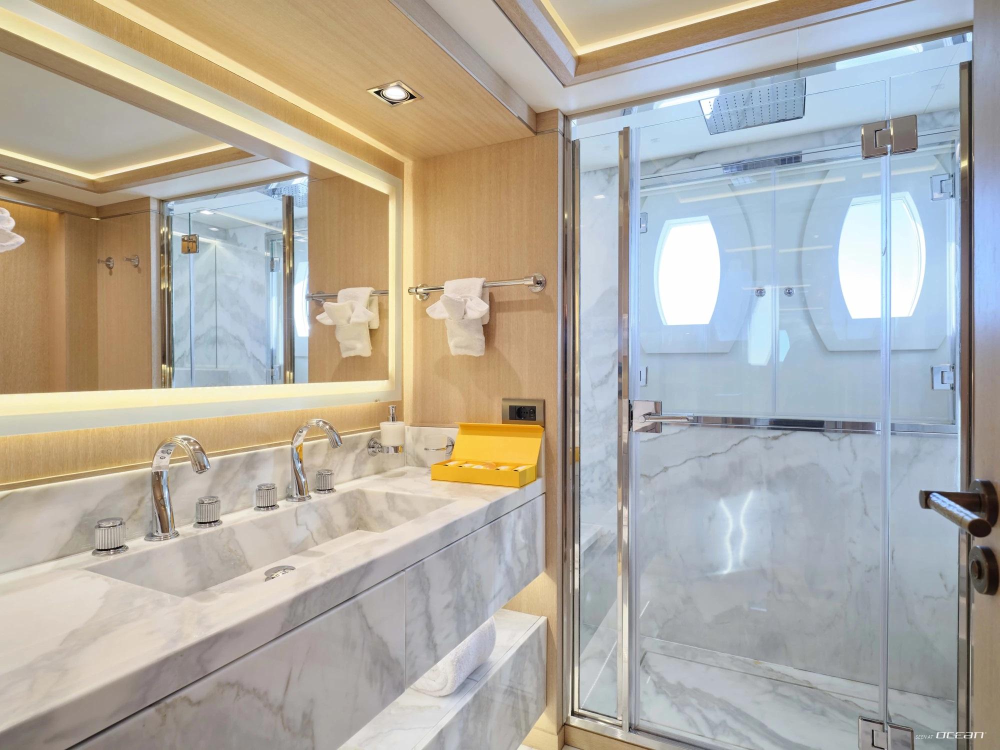 JAZ accommodates 12 guests in six sumptuous staterooms. The Owner's Suite boasts a king-size bed and a walk-in wardrobe, while below deck are double staterooms with queen beds and a twin stateroom with an additional Pullman berth. All cabins feature en-suite facilities and are designed for restful privacy. With a dedicated crew of 11, JAZ provides attentive, professional service, ensuring a seamless luxury motor yacht charter in Greece.