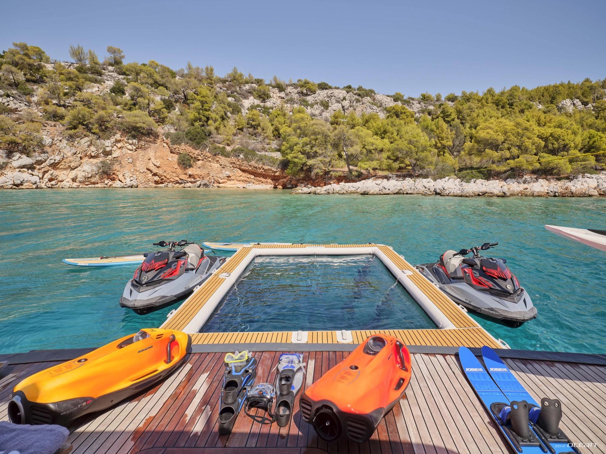 Wally 48 chase boat, 6.20m Pascoe tender with Yanmar 140hp engine, Castoldi 6m jet tender, jet ski Spark 42, 2-person Seadoo Spark, eFoil, waterskis for adults and children, 2 stand-up paddleboards, 2 SeaBobs F5S, kayak, wakeboard, tube, 2-person sofa, 4-person sofa, 3-person banana, inflatable pool with protective jellyfish net, snorkeling gear and beach equipment