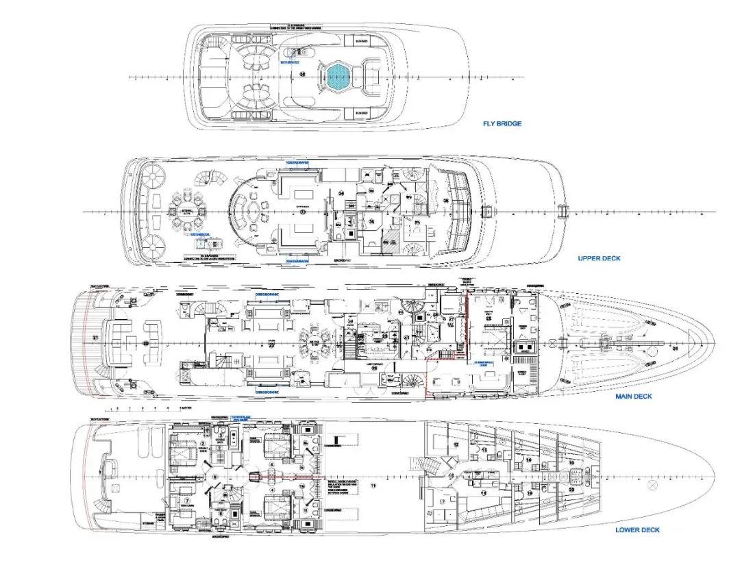 All cabins with en-suite bathrooms, air condition throughout, 2 generators, walk-in closet in master cabin, elevator, safe in each cabin, stabilizers at anchor, stabilizers underway, TV in main and upper saloon, and each cabin, AirPlay, Bluetooth, Spotify, Pandora, Sirus XM, Deezer, Napster, indoor and outdoor speakers, movie library with 450 movies updated each year, media players, BluRay players, satellite receivers, Apple TV connected with each TV, Starlink Wi-Fi internet, deck jacuzzi, gym gear, swimming platform, and a variety of water toys.
