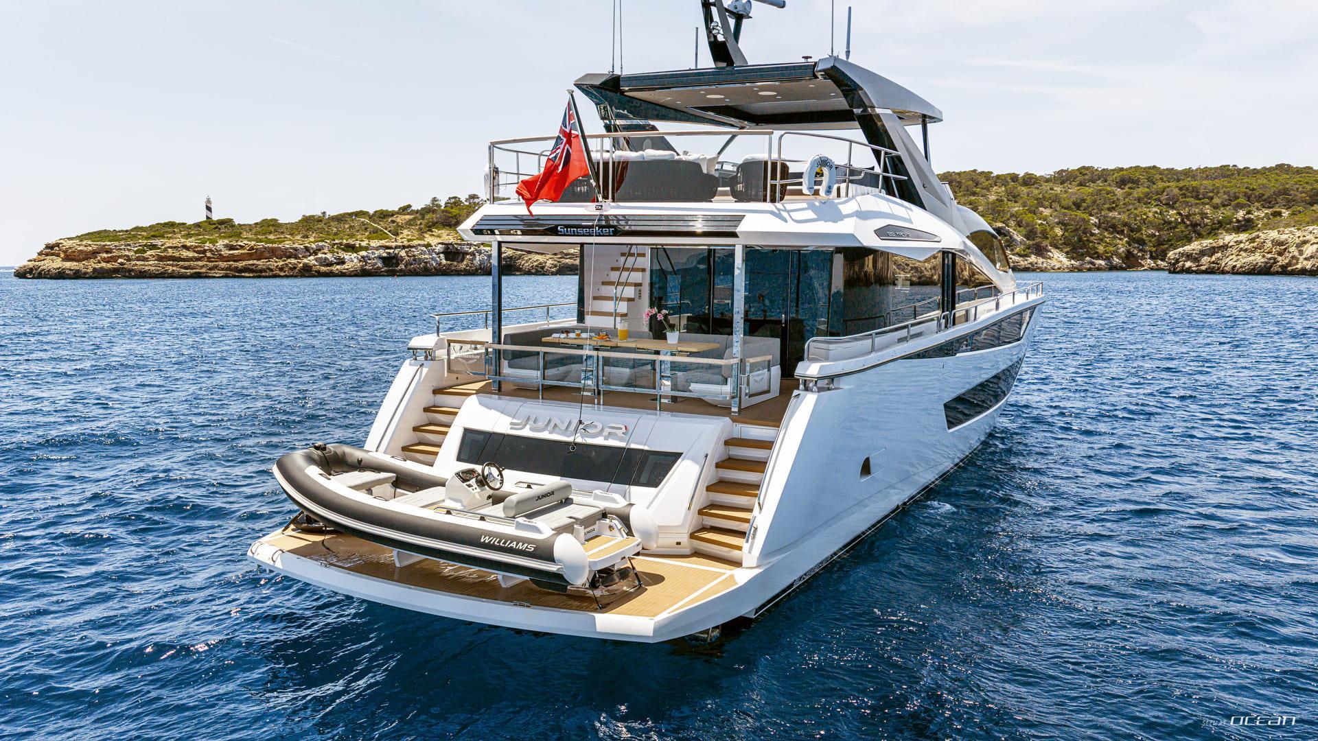 Delivered in 2024, JUNIOR arrives in Puerto Portals as a modern Sunseeker 88 Yacht crafted for elegant cruising around Mallorca and the Balearic Islands. Her sleek profile, bold glazing, and confident proportions reflect Sunseeker’s contemporary design language, while onboard spaces are shaped for relaxed Mediterranean living. Designed for effortless island hopping, Charter Yacht JUNIOR presents a refined yet approachable luxury motor yacht experience.