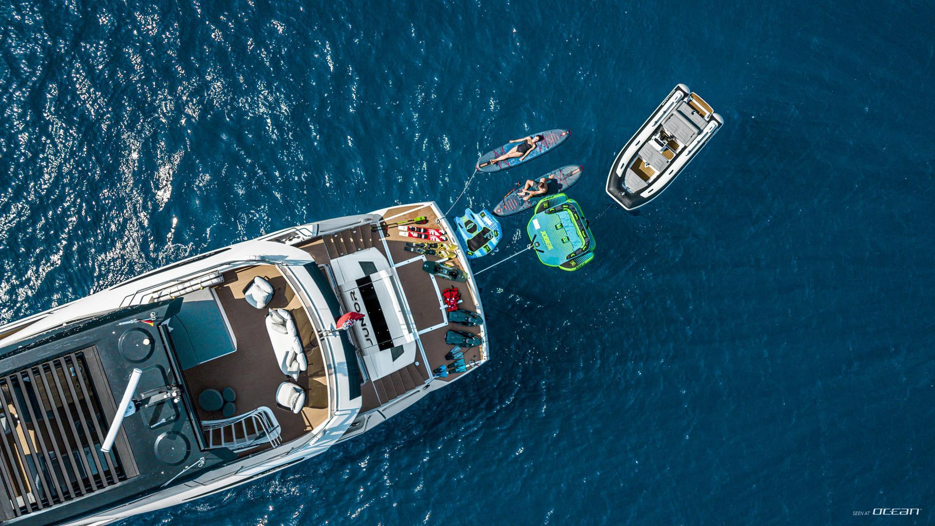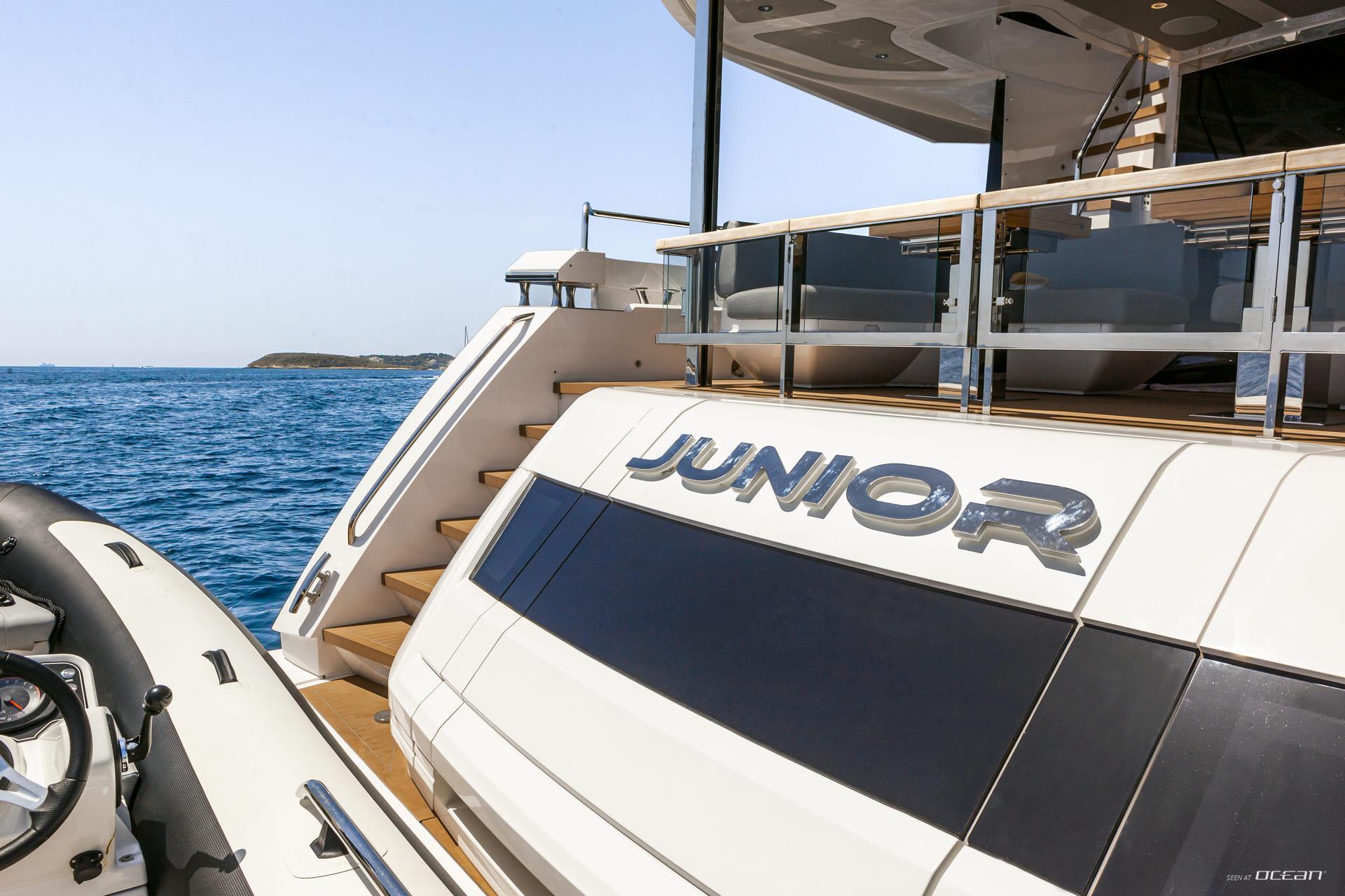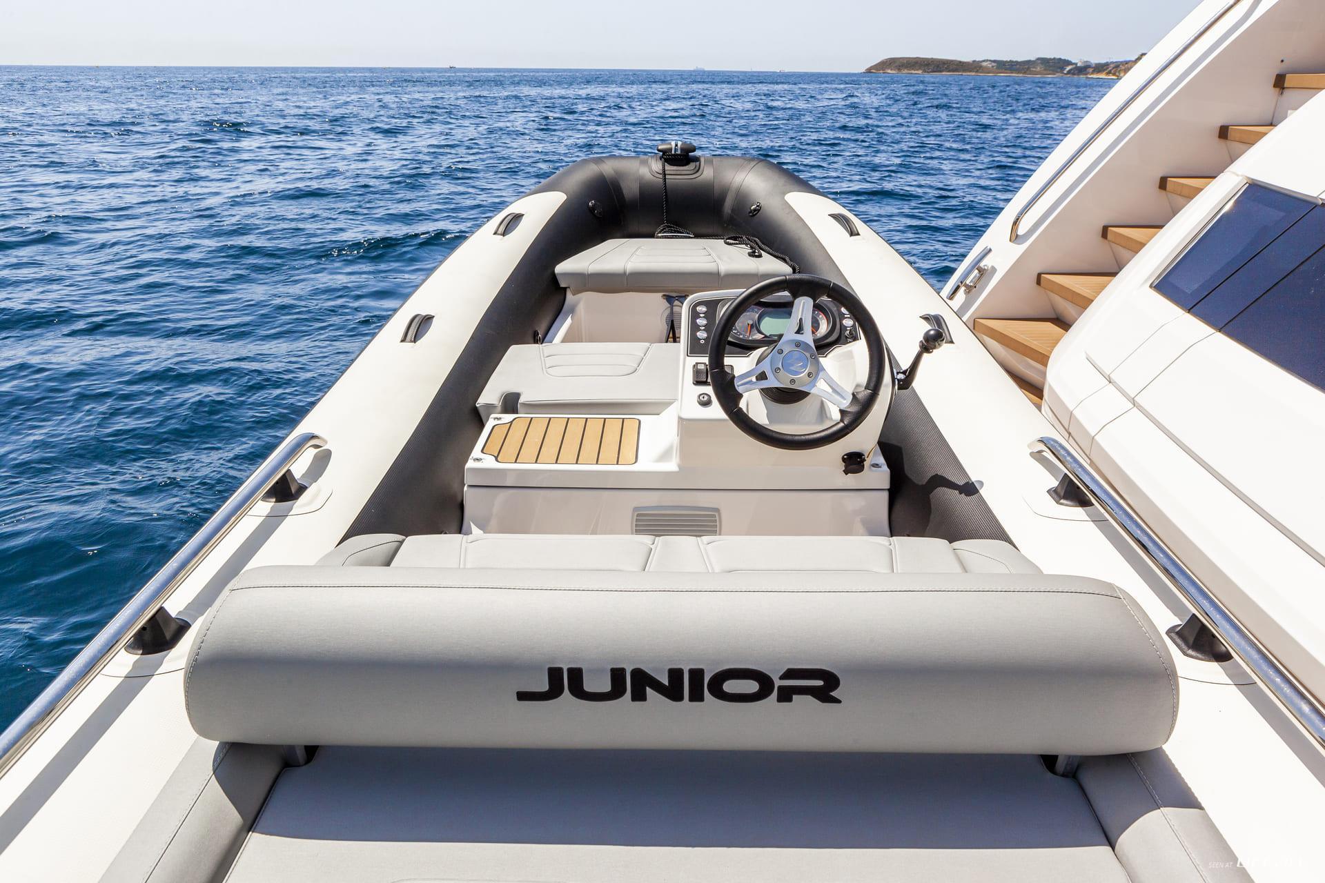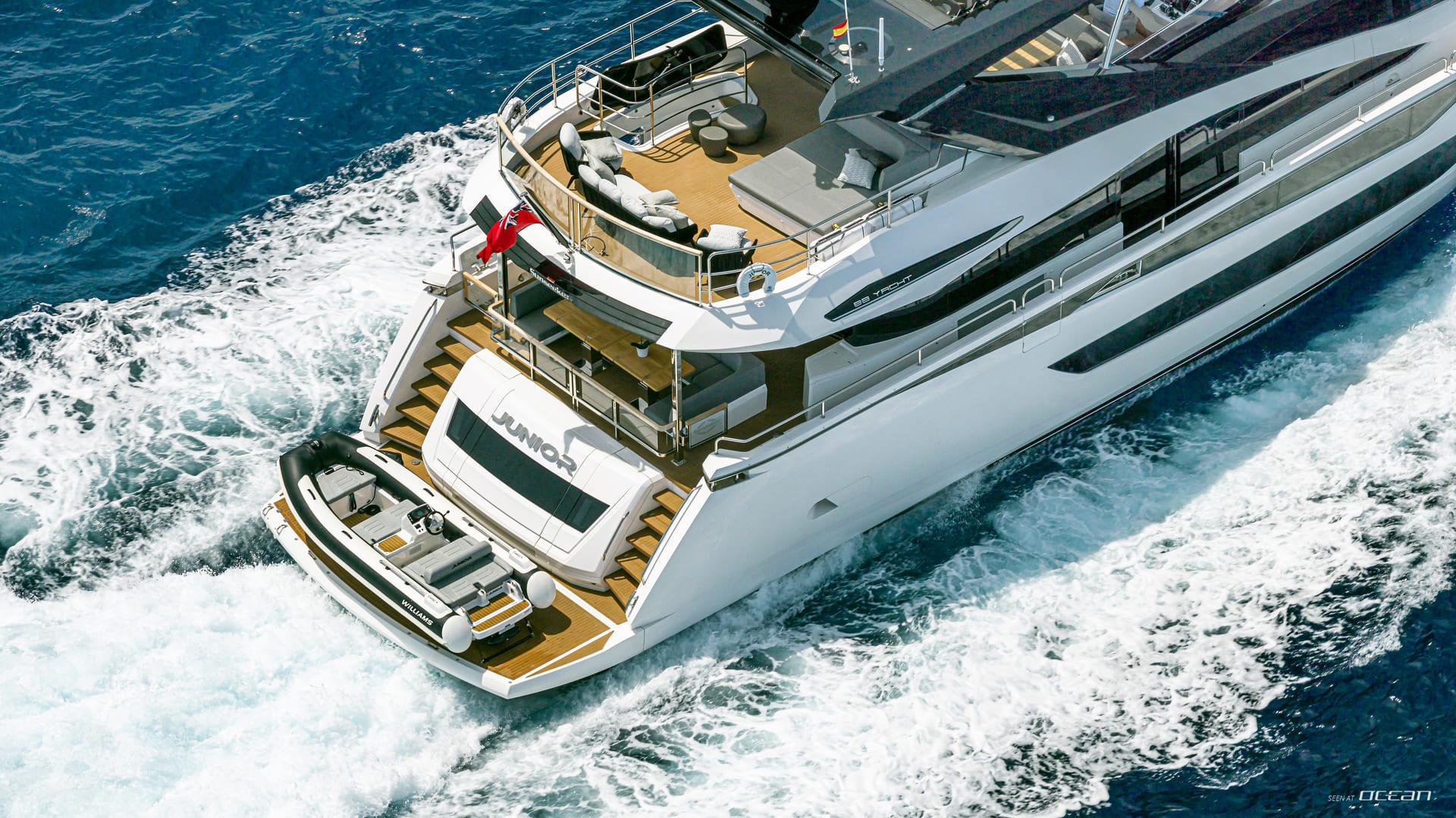 Supported by a professional crew of 4, M/Y JUNIOR for charter delivers attentive service with a relaxed onboard rhythm. A fast Williams jet tender, seabobs, boards and skis, and inflatable toys invite guests to enjoy active days at anchor, turning each stop into a playful escape. Cruising Mallorca and the surrounding islands, Sunseeker 88 JUNIOR offers a stylish and sociable Luxury Yacht Charter Balearics experience shaped by design, comfort, and fun.