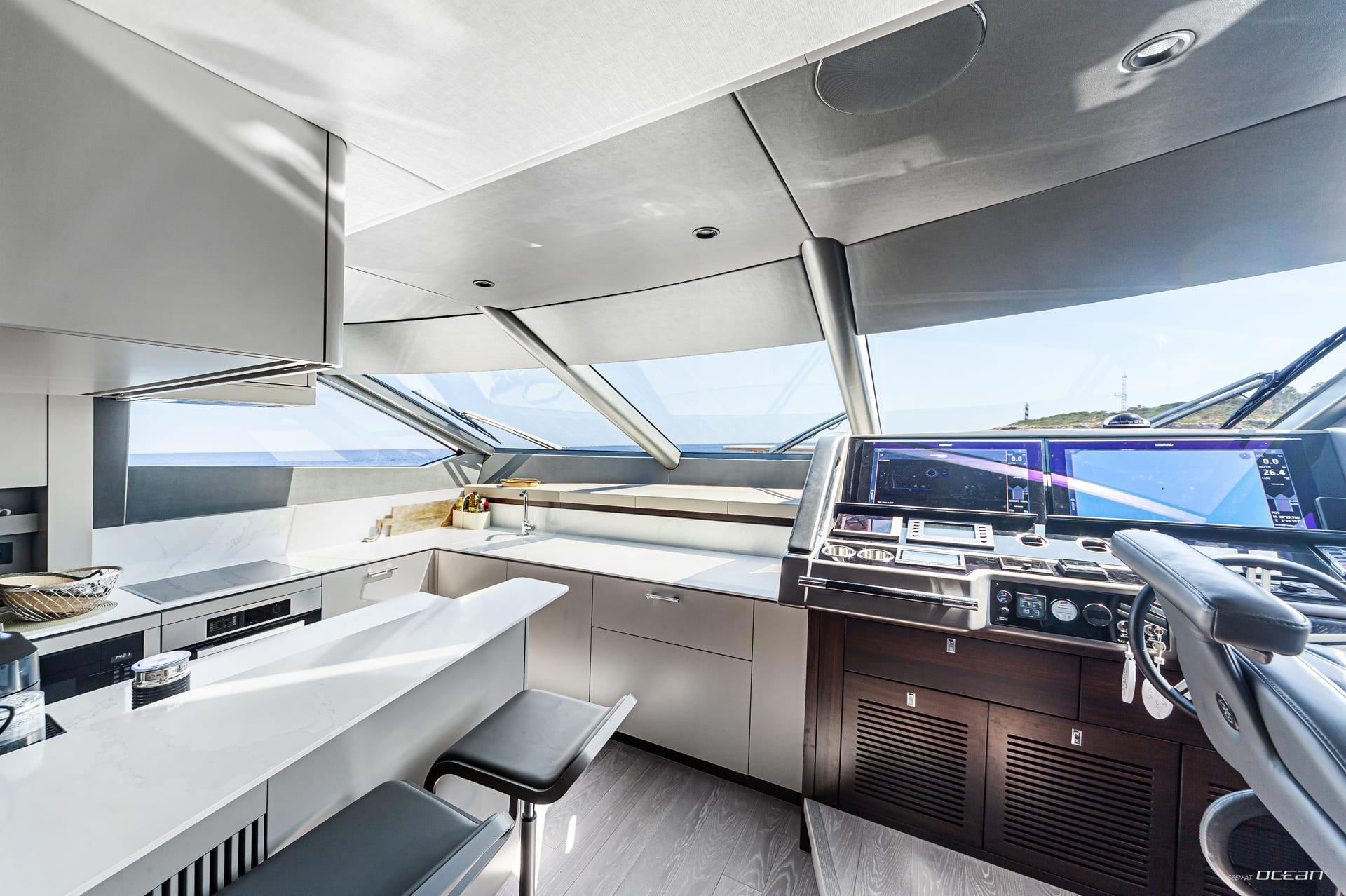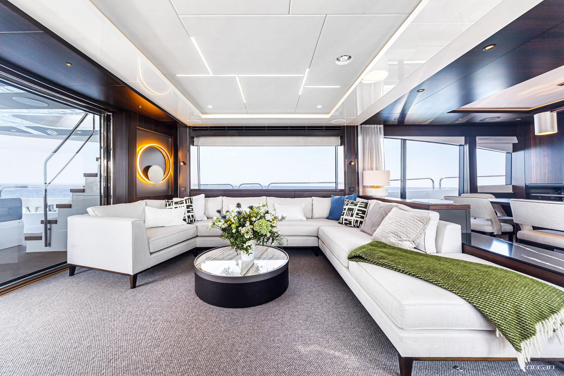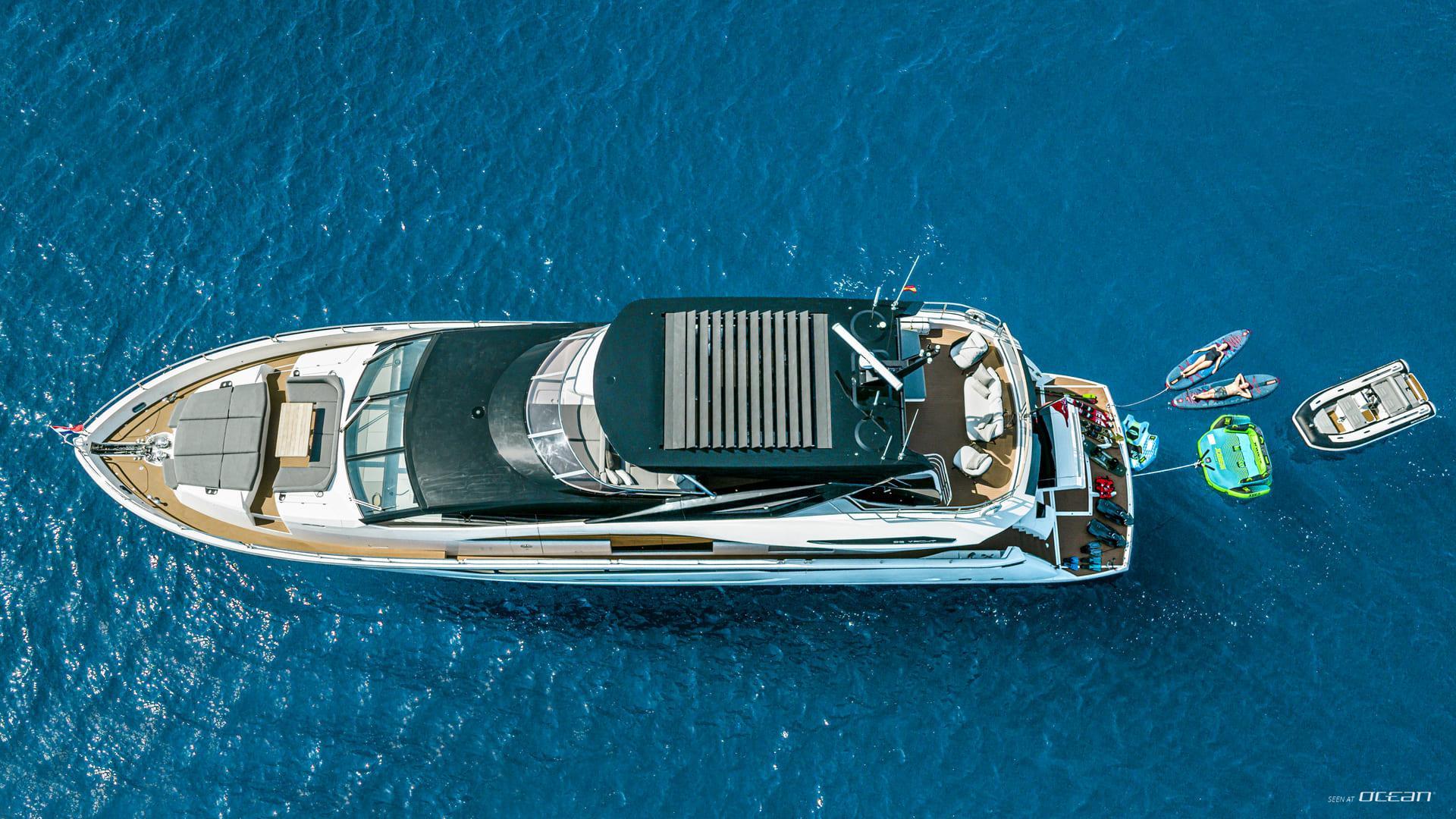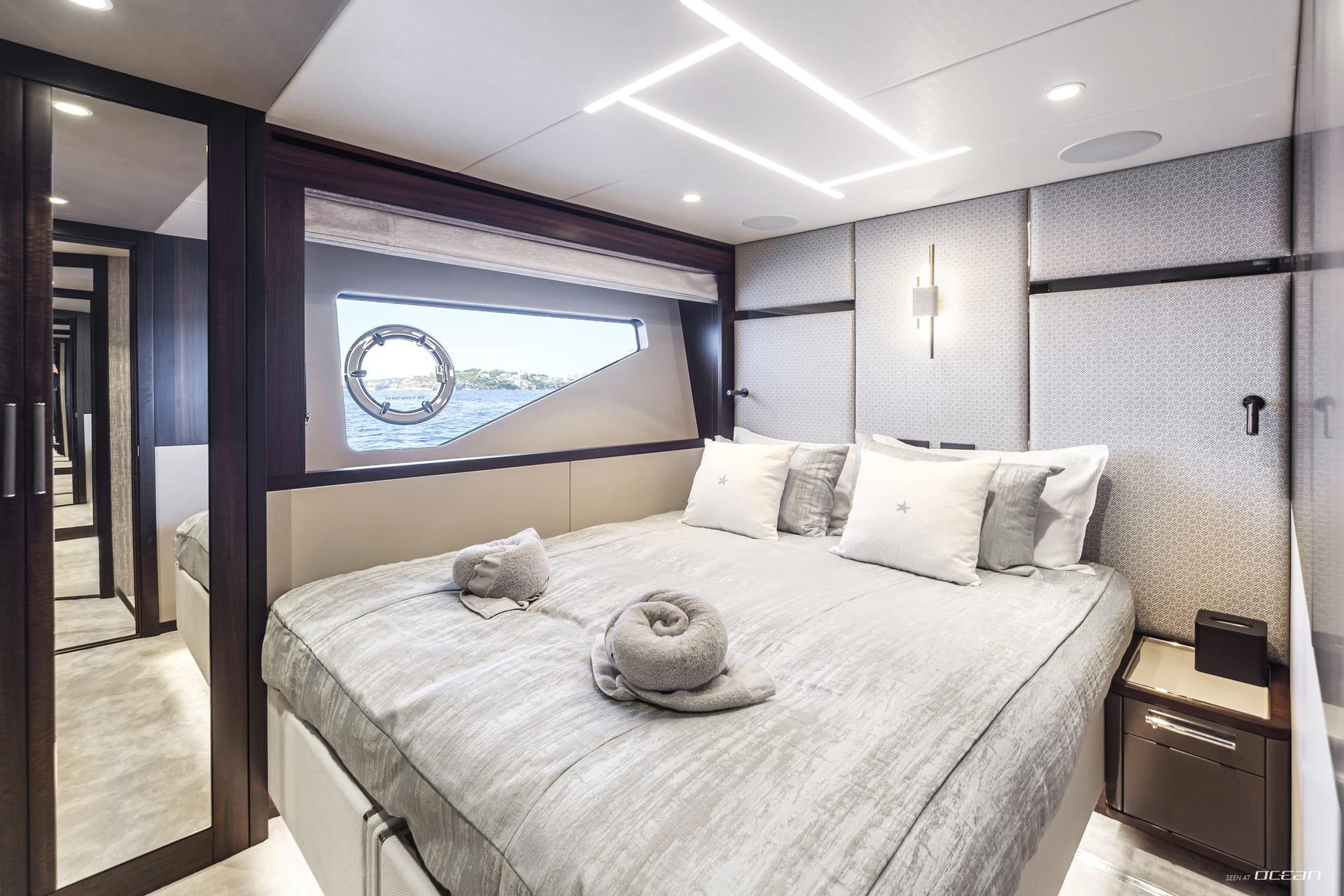 Life onboard JUNIOR is centered around generous outdoor spaces designed to bring guests closer to the sea. The signature Sunseeker beach club with X-TEND seating creates a flexible sea-level lounge, while the aft cockpit flows naturally into the main salon. Above, the flybridge offers a versatile social setting for dining, sunbathing, and long afternoons with panoramic views, complemented by a welcoming foredeck lounge.