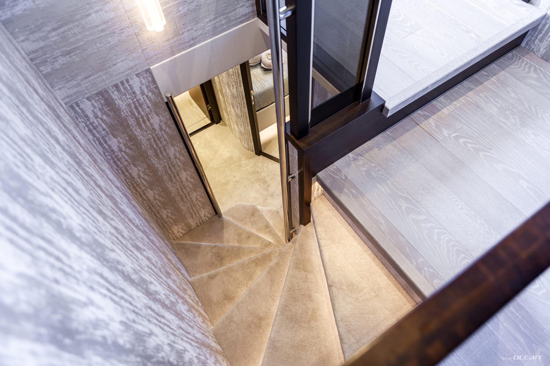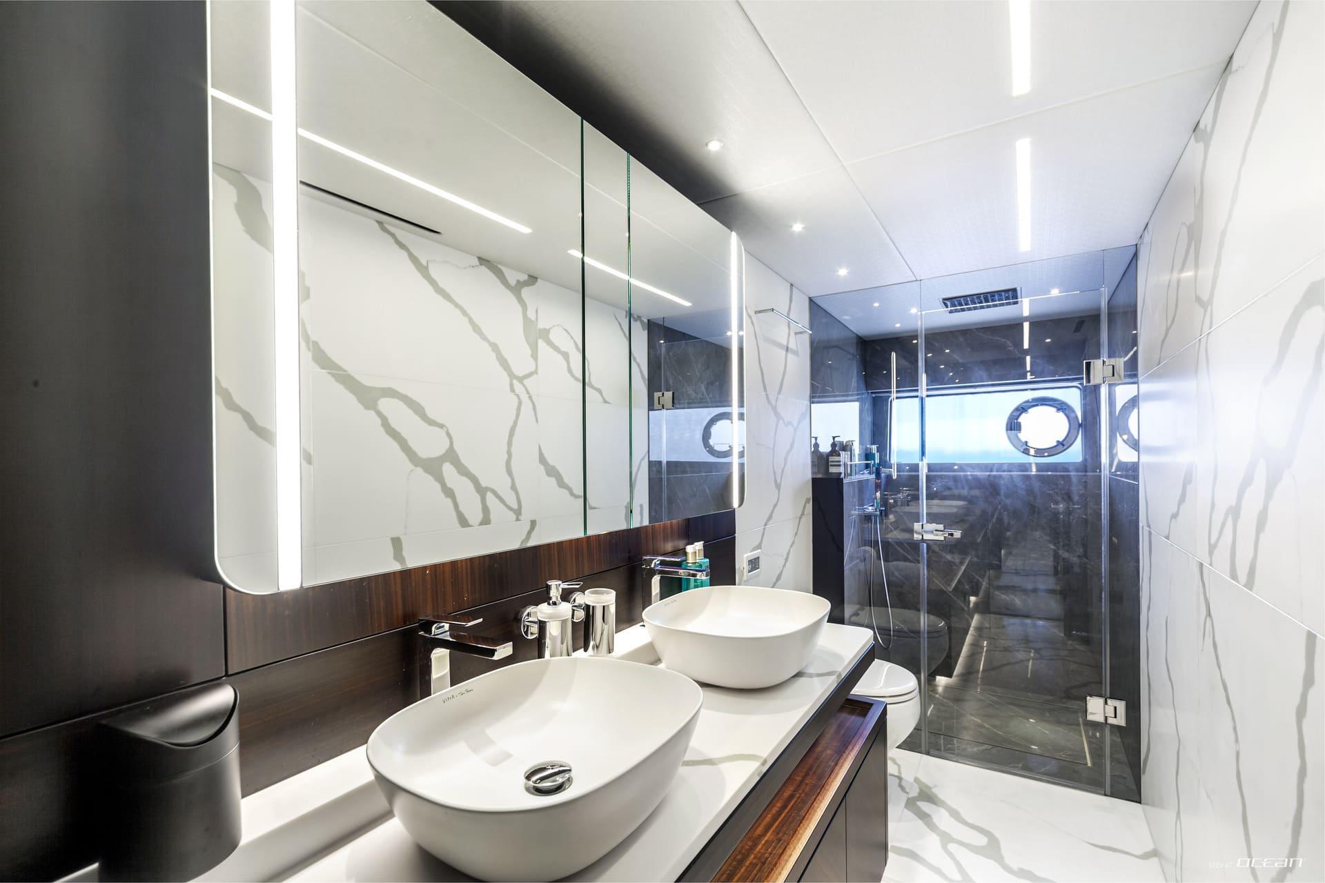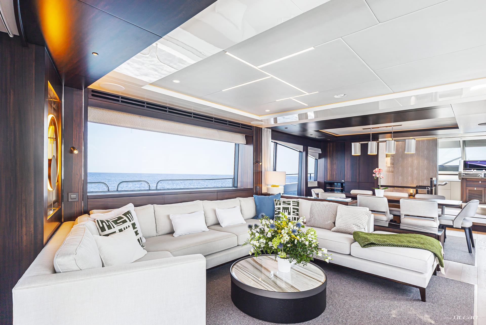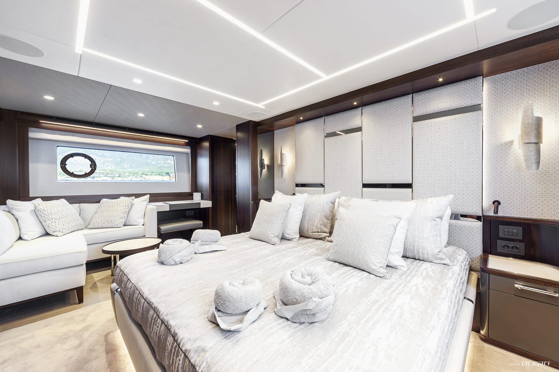 Accommodation aboard JUNIOR is arranged for up to 8 guests across 4 ensuite cabins, including a full-beam master suite, a VIP cabin, and 2 twin cabins, one convertible to a double. Each cabin is equipped with smart TVs or Apple TVs and Wi-Fi internet, ensuring modern comfort and privacy. The interior atmosphere is light and contemporary, making JUNIOR equally suited for short escapes or extended charters.