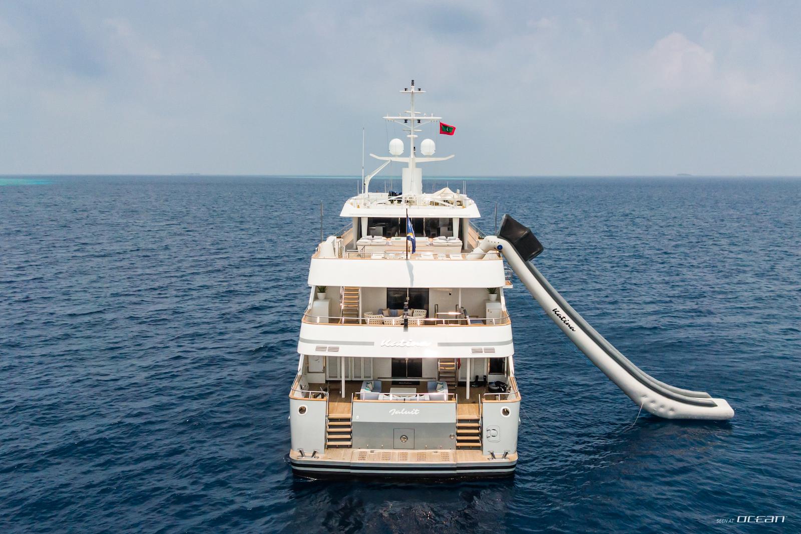 Luxury motor yacht for charter, KATINA delivers expansive outdoor spaces ideal for sun lounging, open-air dining and large entertainment events. A jacuzzi offers a relaxed spot to enjoy panoramic views, while stabilizers at anchor and underway ensure steady comfort. Her toy collection includes an inflatable slide from the sundeck, an inflatable aqua park, eFoils, 2 jet skis, a Zapata racing jet pack and a broad mix of equipment for water-based adventures. These features make her a standout choice for active charter groups. Quiet coves and vibrant coastlines across the Med and Indian Ocean complement her full onboard offering.