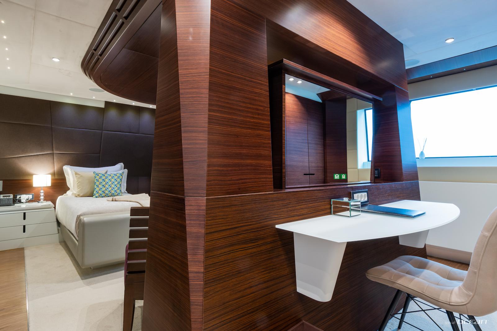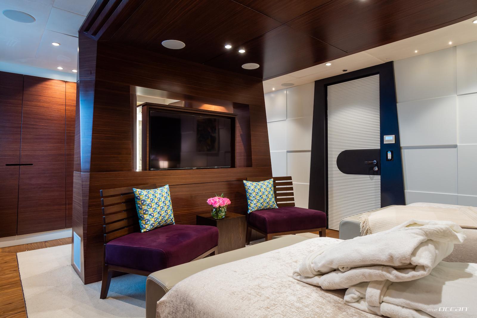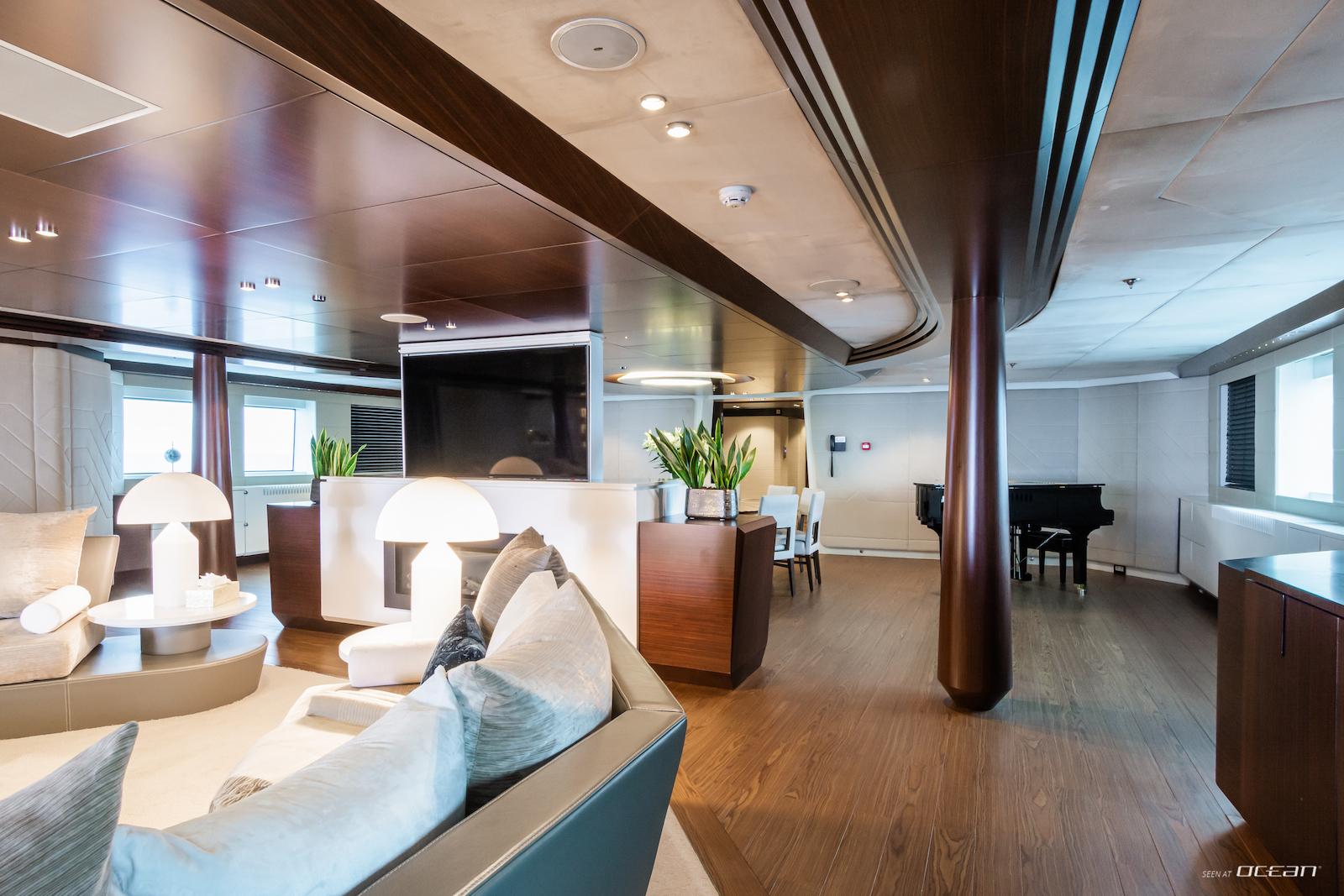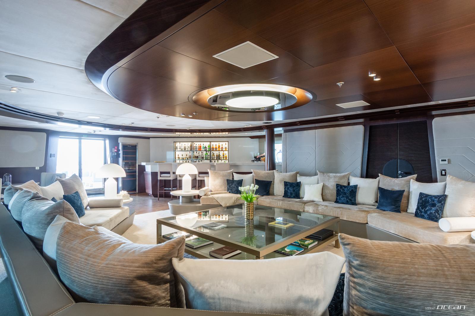KATINA luxury superyacht for charter offers a sophisticated interior atmosphere with warm woods, contemporary lines and abundant natural light. A dedicated whisky and cigar room with a separate ventilation system provides a refined retreat for relaxed evenings onboard. Wellness amenities include a massage room, a fully equipped gym and a sauna for full body rejuvenation during long cruises. An onboard elevator enhances ease of movement between the decks. Social spaces are configured for both intimate gatherings and large celebrations.