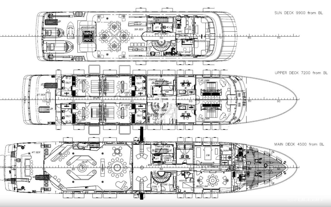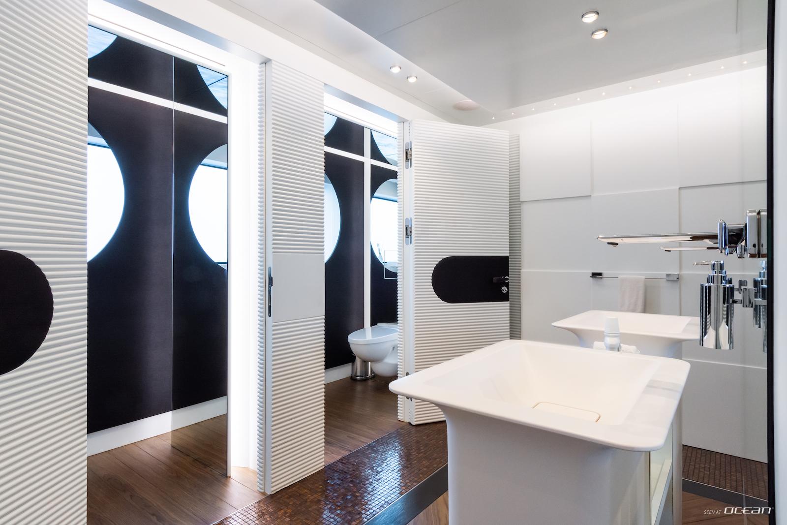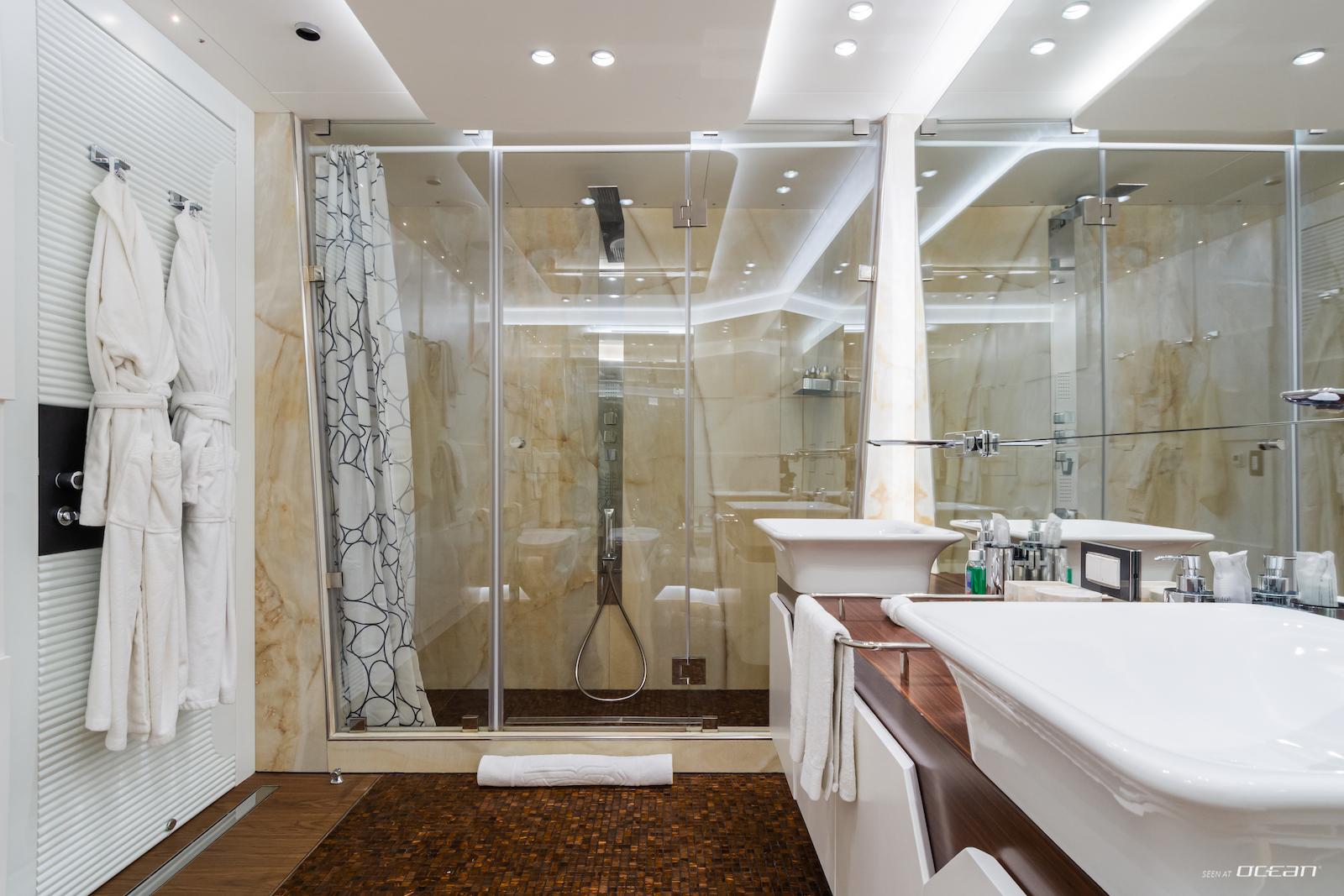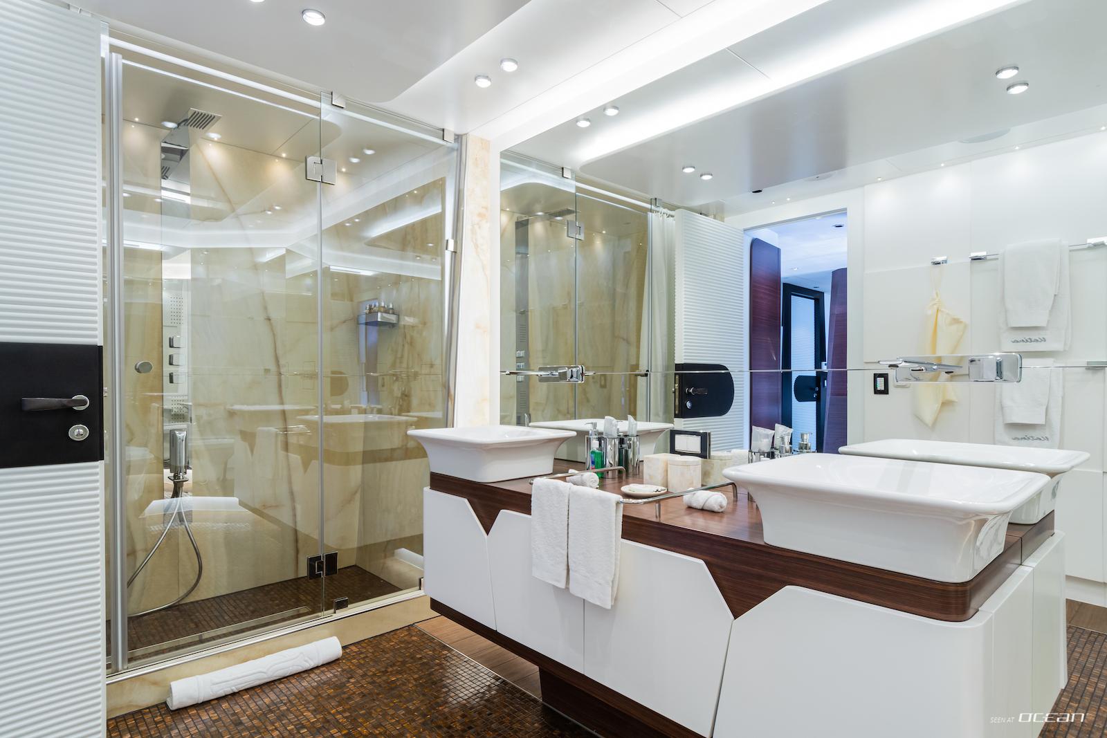 All cabins with en-suite bathrooms, air condition throughout, 3 generators, watermakers, stabilizers at anchor and underway, jacuzzi, elevator, TV in salon, sundeck and all cabins, Starlink, Wi-Fi internet, outdoor cinema, outdoor sound system, movie and music library, state of the art built-in light show and sound system, Whisky and cigar room (with separate ventilation system), Playstation, sauna, massage room, gym, and a variey of water toys.