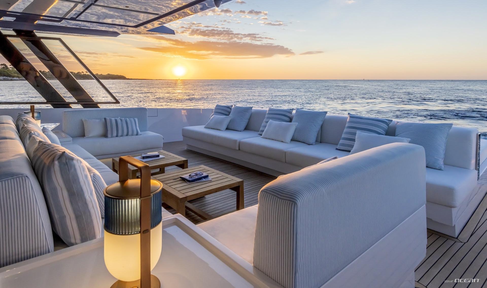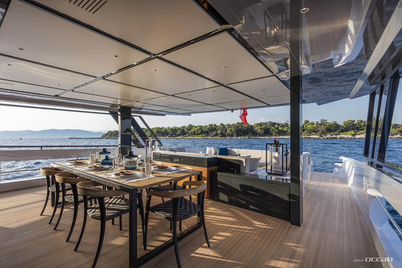 M/Y LA FOLYE for charter offers multiple exterior and interior areas for daily use, including a climate-controlled winter garden with sliding glass panels and a 50” TV, as well as additional lounge areas on the skylounge and main deck. A beach club at water level provides direct sea access, while a Williams jet tender, seabob, boards, and canoes support water activities at anchor.