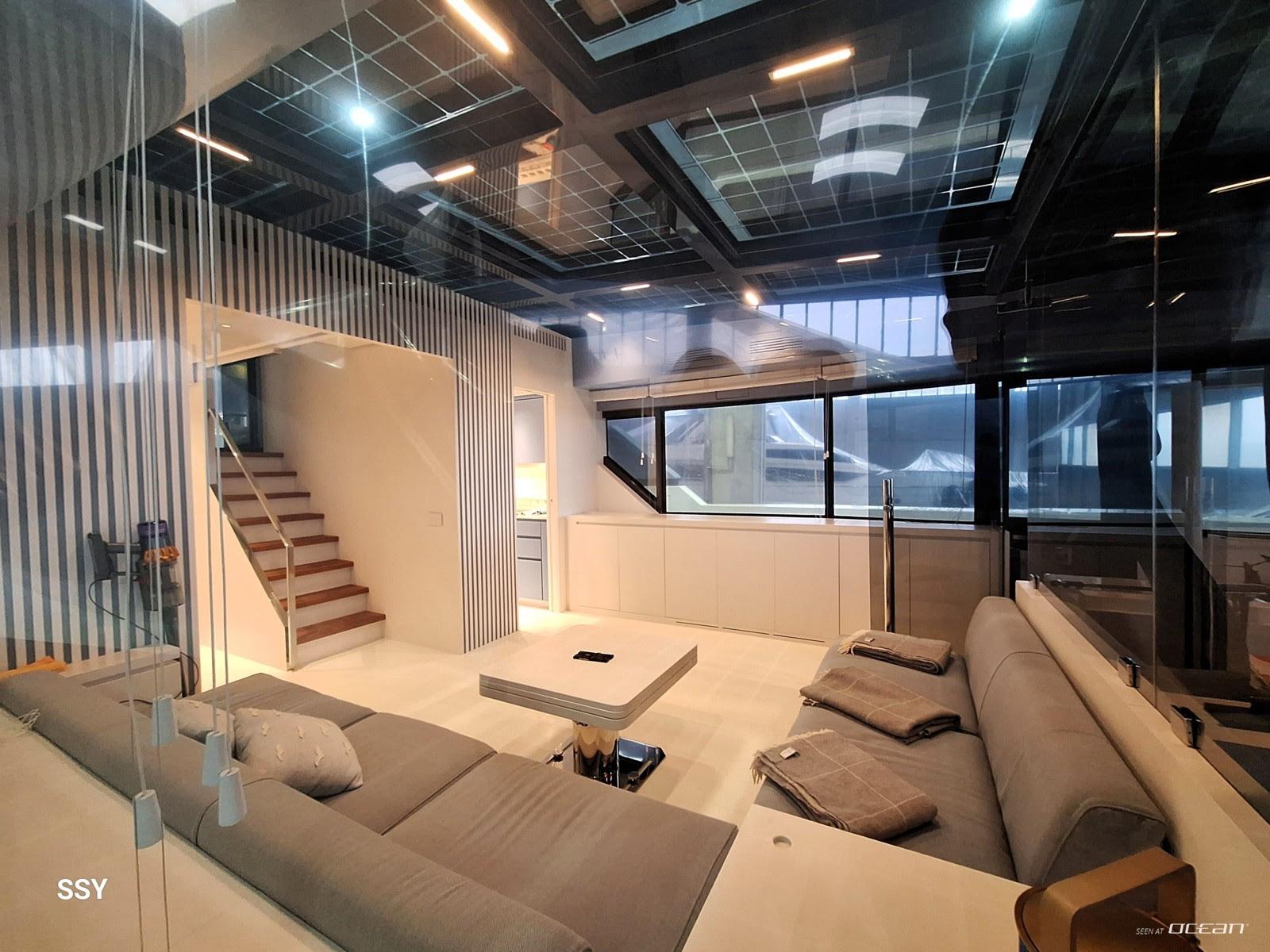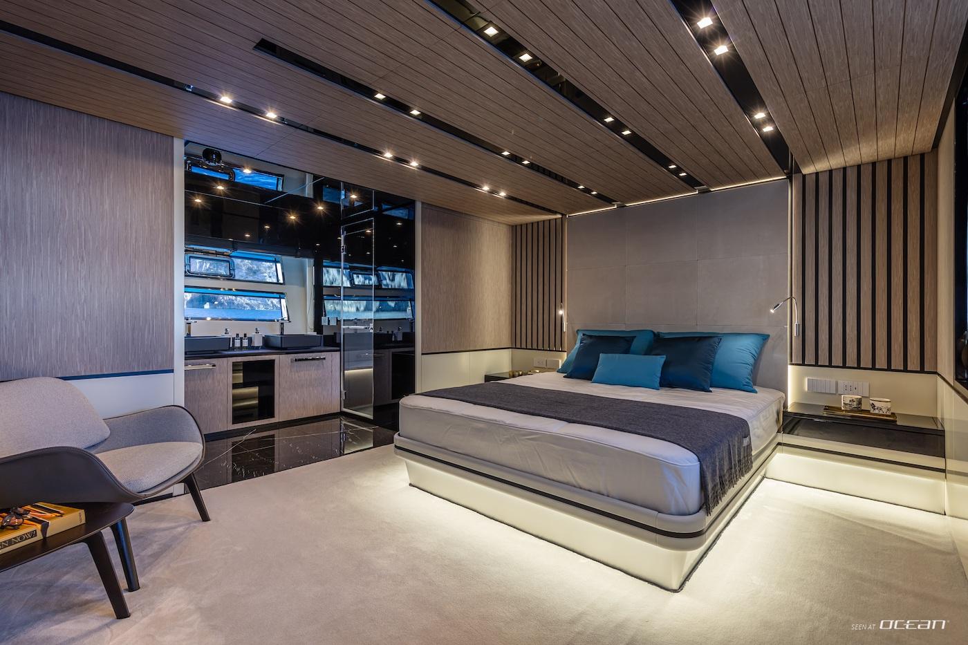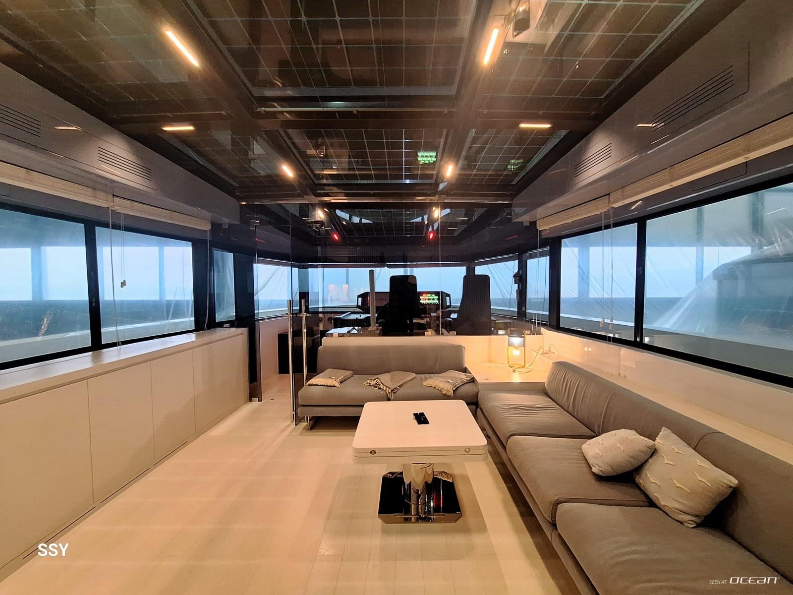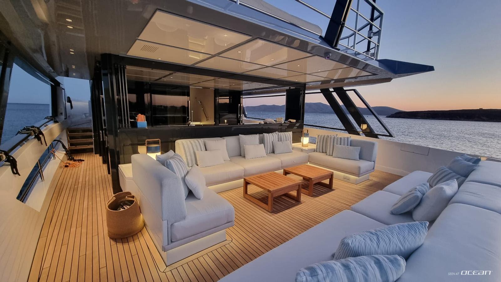 En-suite bathrooms in all cabins, air condition throughout, 2 generators, solar panels, watermaker, stabilizers underway and at anchor, climate-controlled winter garden protected by sliding glass panels and equipped with a 50” up-and-down TV, additional TVs on skylounge, master and VIP cabin, satellite TV system, music and movie library, outdoor sound system, Wi-Fi internet, day head, beach club and water toys