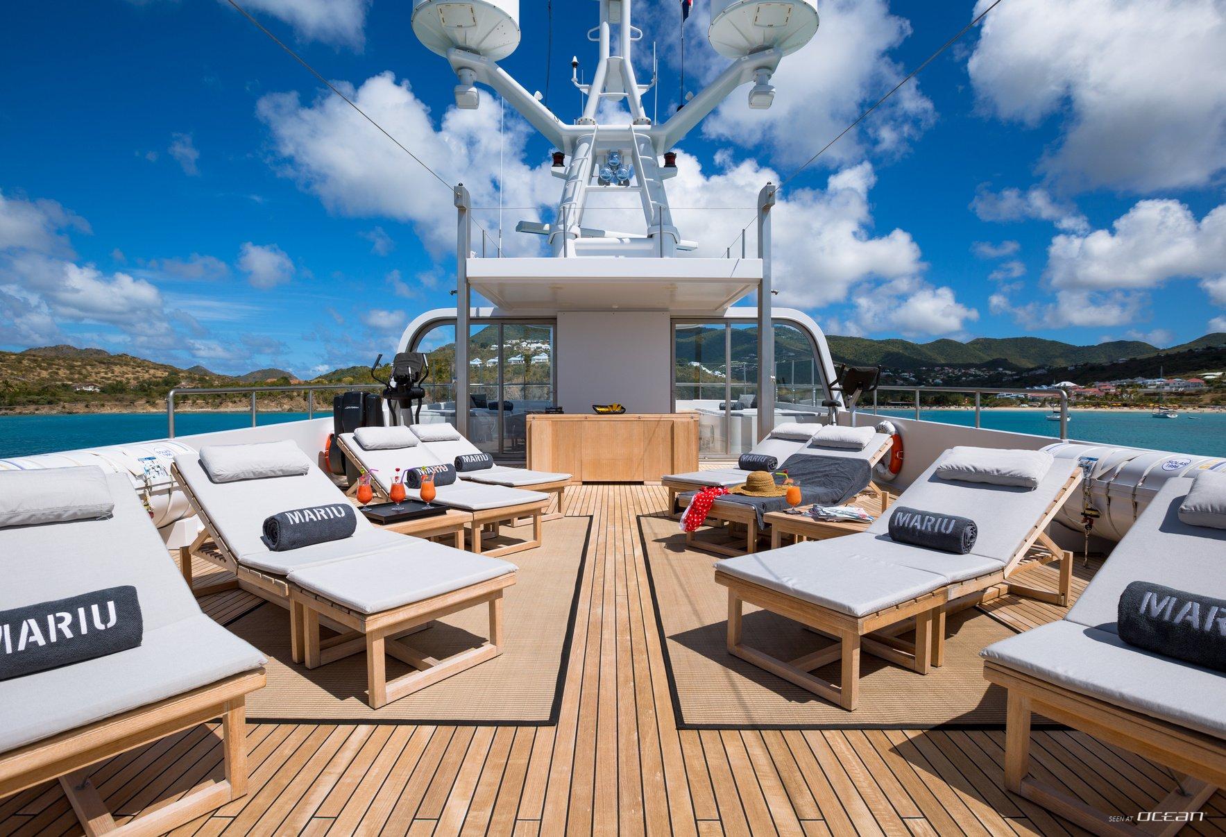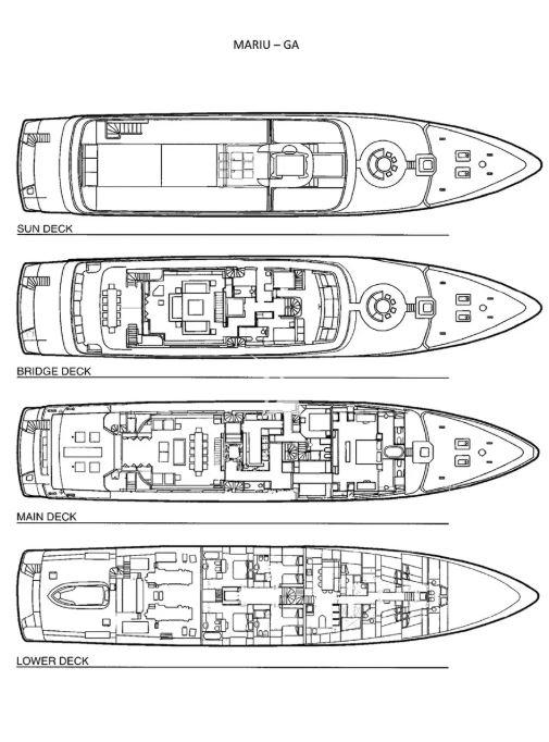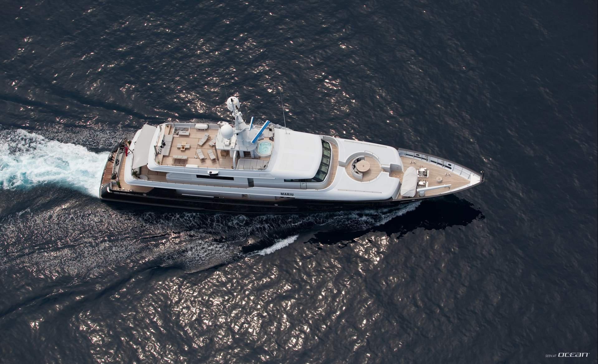 MARIU luxury motor yacht for charter accommodates up to 12 guests in 5 double cabins with king-size beds and 1 convertible cabin, perfectly suited for families and friends. Each cabin features en-suite bathrooms, Kaleidoscape AV systems, Apple TV, Satellite TV (upgraded 2020), Sonos entertainment system, iPad mini remote controls, AirDrop connectivity, and air conditioning throughout. The master suite offers his and hers bathrooms with a private jacuzzi. An elevator connects all four decks, including a large sun deck that can be flexibly shaded, with a forward Jacuzzi ideal for sundowners.