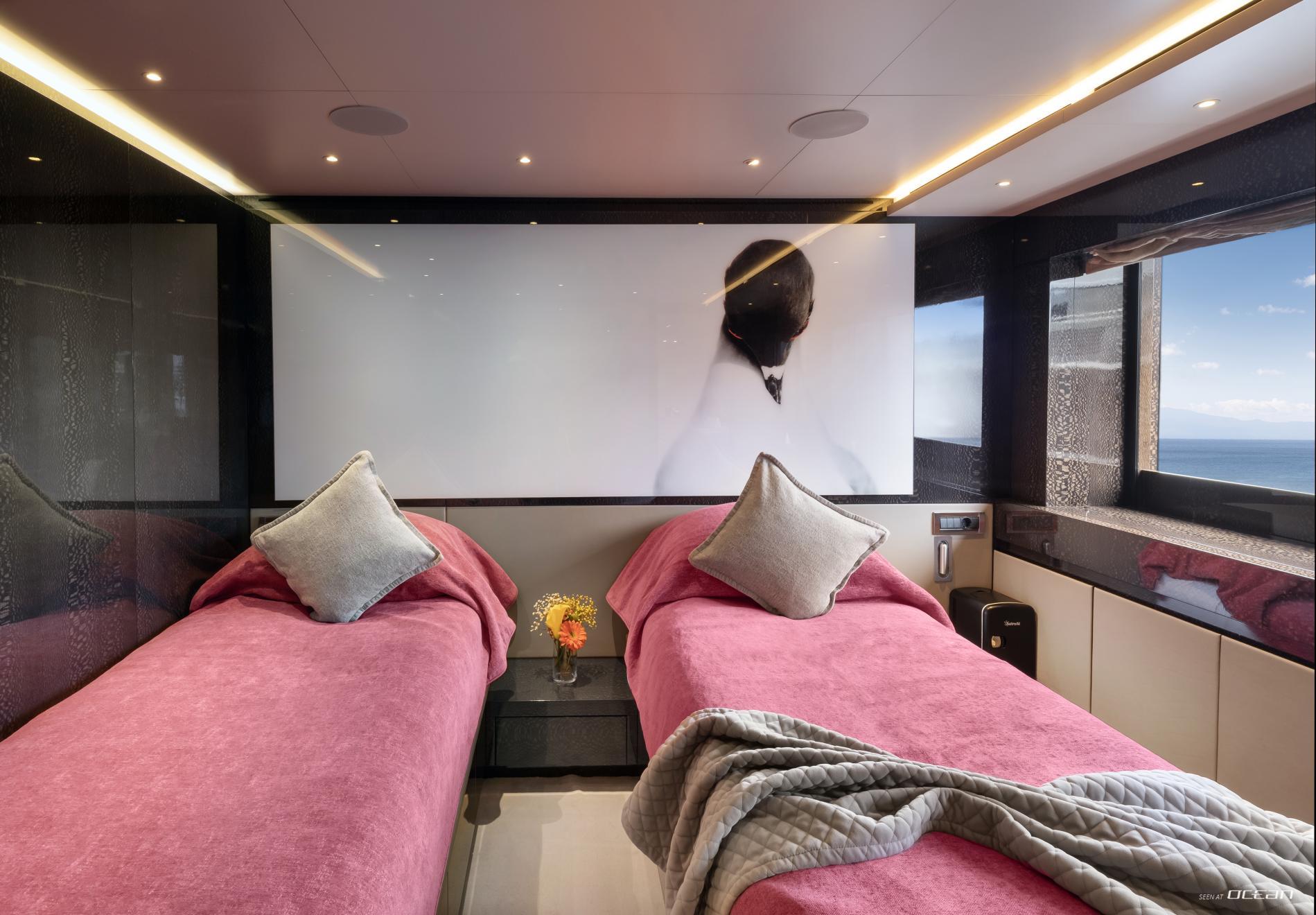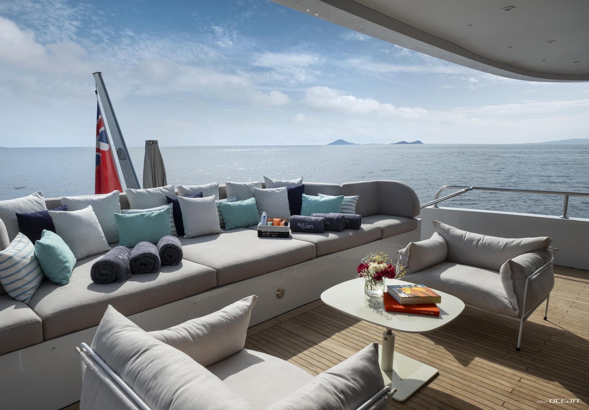 MY EDEN for charter has a layout conceived for up to 12 guests sleeping in 6 well-appointed cabins including a master stateroom with panoramic views and an own private deck with Jacuzzi. A VIP suite, 2 double and 1 convertible plus a twin cabin with pullman bed makes this superyacht perfect for families and couples at the same time. Guests will find the latest audio-visual entertainment systems on board ranging from LED-TV with DVD-player in all cabins, AirPlay for Apple devices, media libraries, iPod docking stations etc. The children's lounge is equipped with a home cinema and MY EDEN also features a sauna and a vast array of water toys.