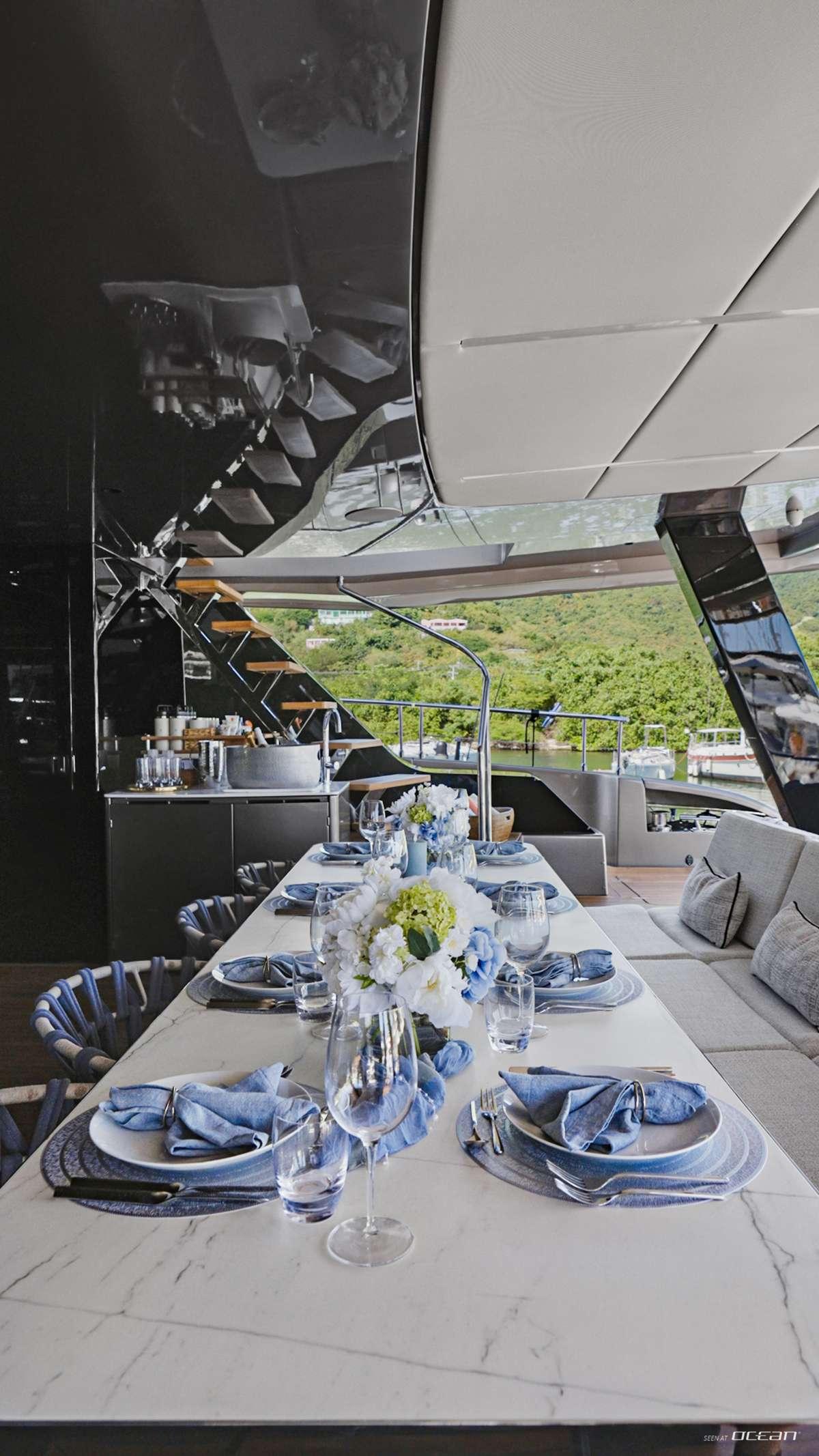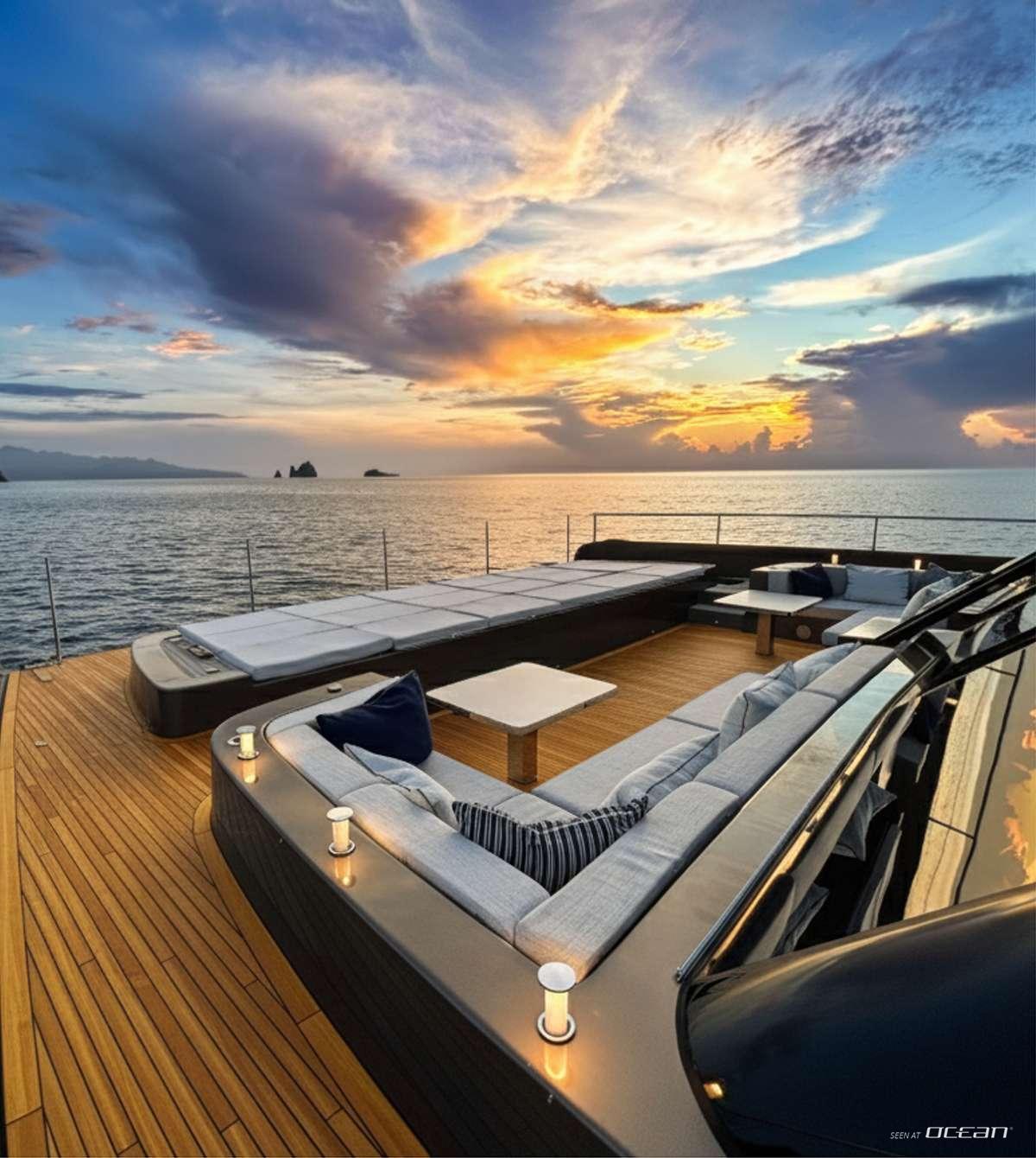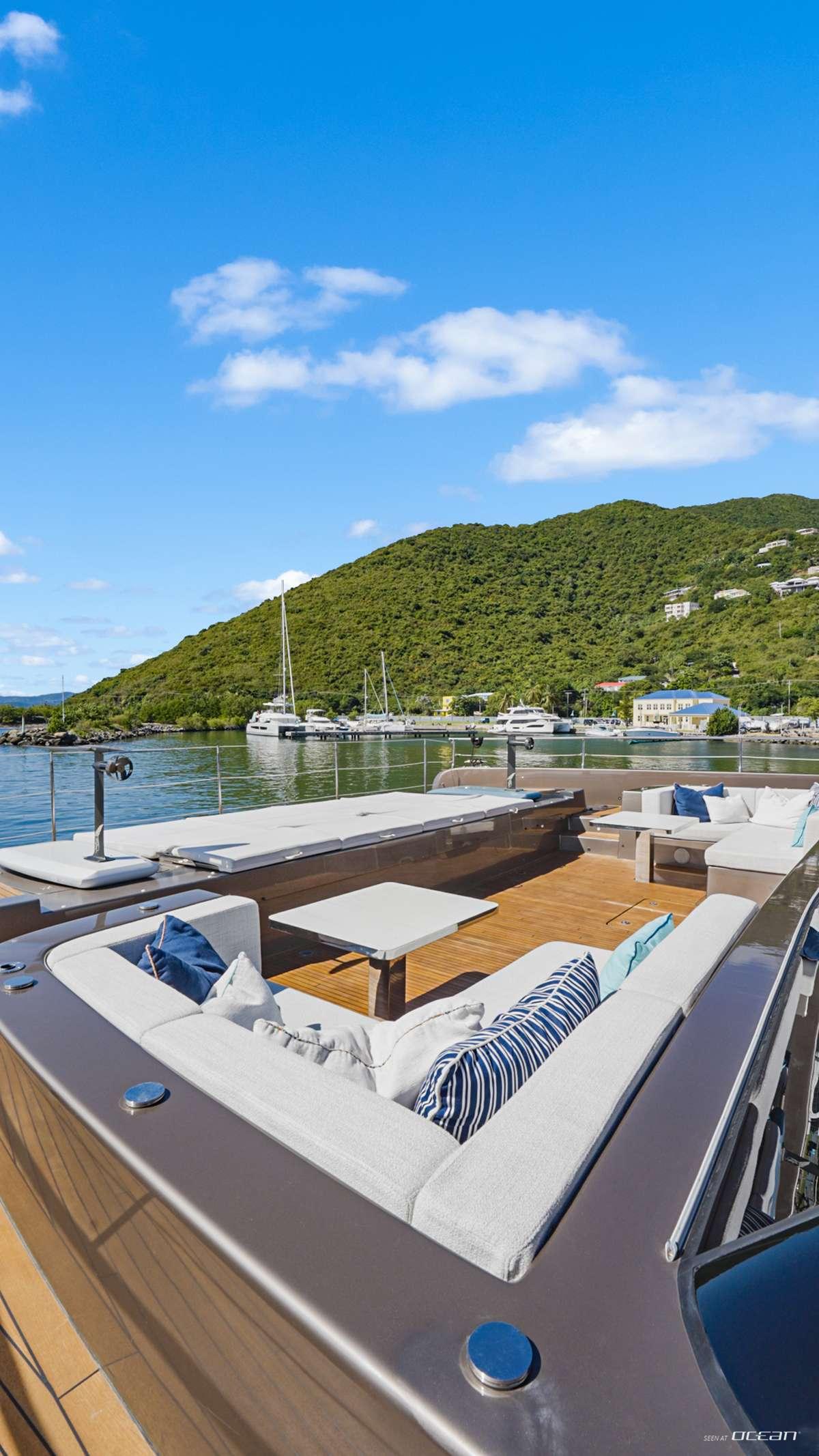 Life onboard flows naturally across expansive exterior areas, from the forward bow terrace to the spacious aft cockpit designed for open-air dining. The flybridge stands out as a true social hub, equipped with a retractable sun top, jacuzzi spa tub, BBQ, and multiple lounging zones. Panoramic sea views accompany every moment, whether cruising between anchorages or relaxing at anchor in the BVI.