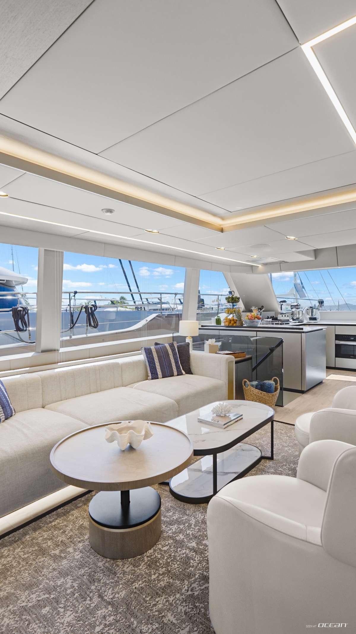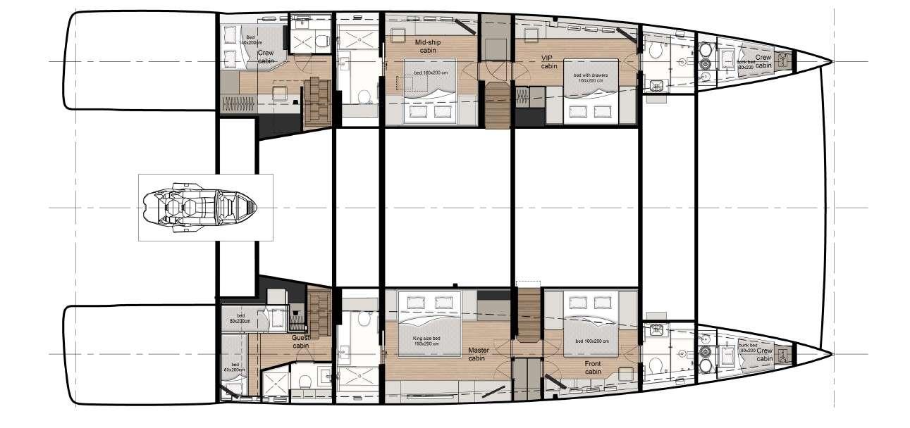 With her galley-up layout, Sunreef NAUTI NICKEL maximizes space below deck, creating a calm and private guest environment rarely found on yachts of this size. Accommodation is arranged across 5 double cabins for up to 10 guests, including a full-beam master stateroom, 3 doubles, and 1 twin cabin. All cabins feature ensuite bathroom facilities, smart TVs, and Starlink connectivity, making Charter Catamaran NAUTIC NICKEL equally well suited for families, couples, or groups of friends.
