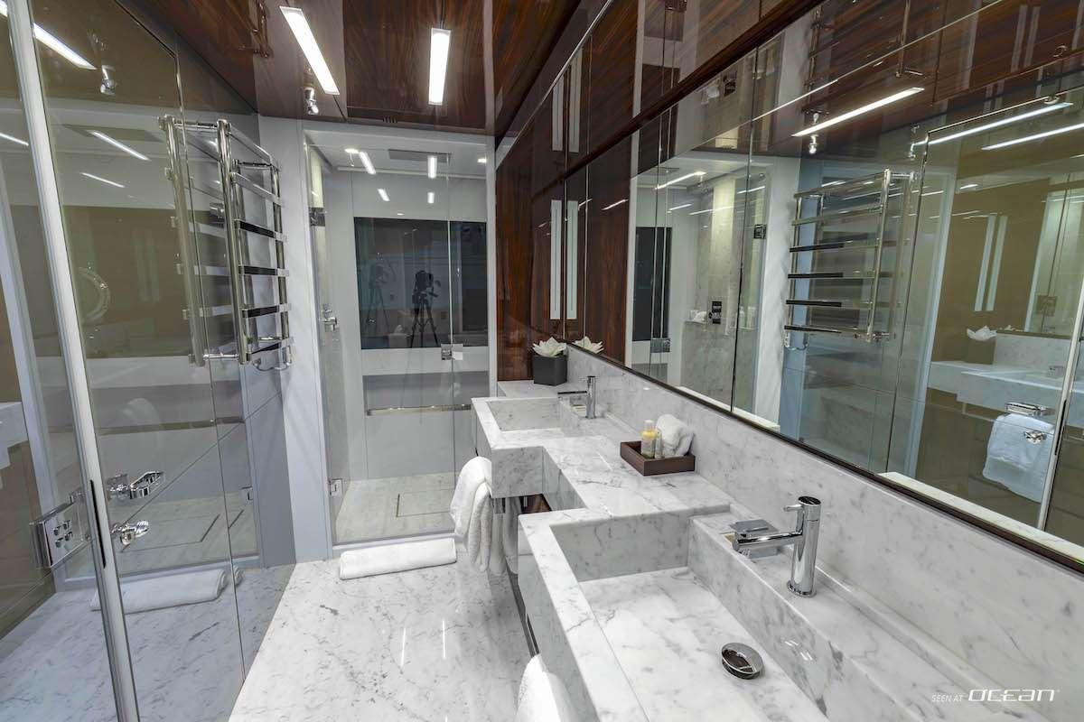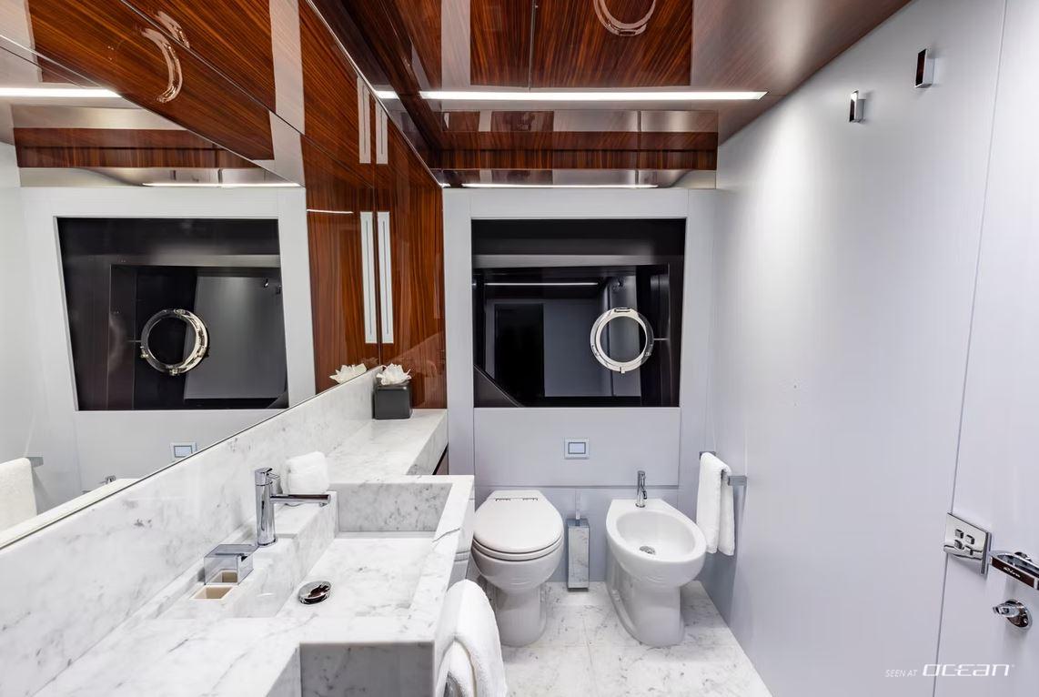 All cabins with en-suite bathrooms, air condition throughout, generators, stabilizers at anchor, stabilizers underway, watermaker, jacuzzi, TV in salon and all cabins, Apple TV and mini-iPad for A/V control, Bluetooth audio and iPad minis for wireless control, Wi-Fi internet, gym equipment, swimming platform, and a variety of water toys.