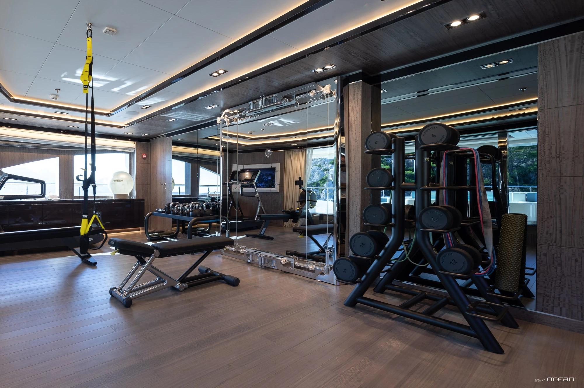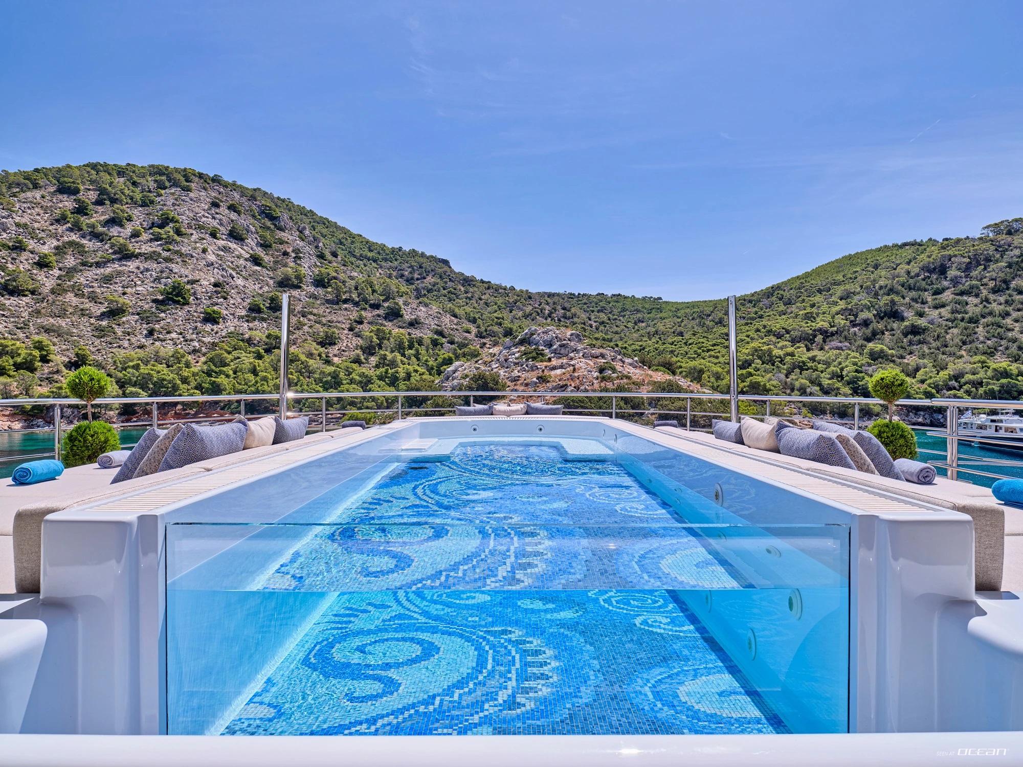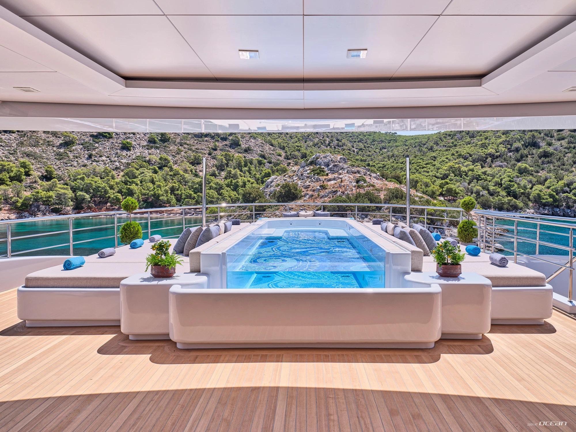 Guests can enjoy an outdoor cinema on the sundeck, a hot tub with sunbathing areas, and expansive social spaces for alfresco dining. The beach club offers a bar, massage area, steam room, and hydraulic ladder for accessibility, complemented by an elevator connecting all decks. A fully equipped high-tech gym with sea views and a wellness center ensures guests can maintain their routines while cruising. Charter Yacht O'PTASIA is perfect for those seeking relaxation and active lifestyle options alike.