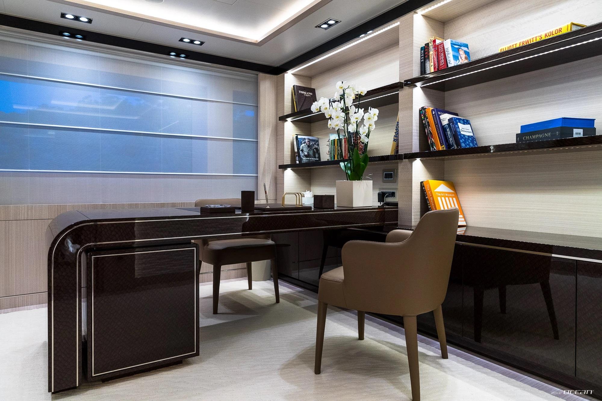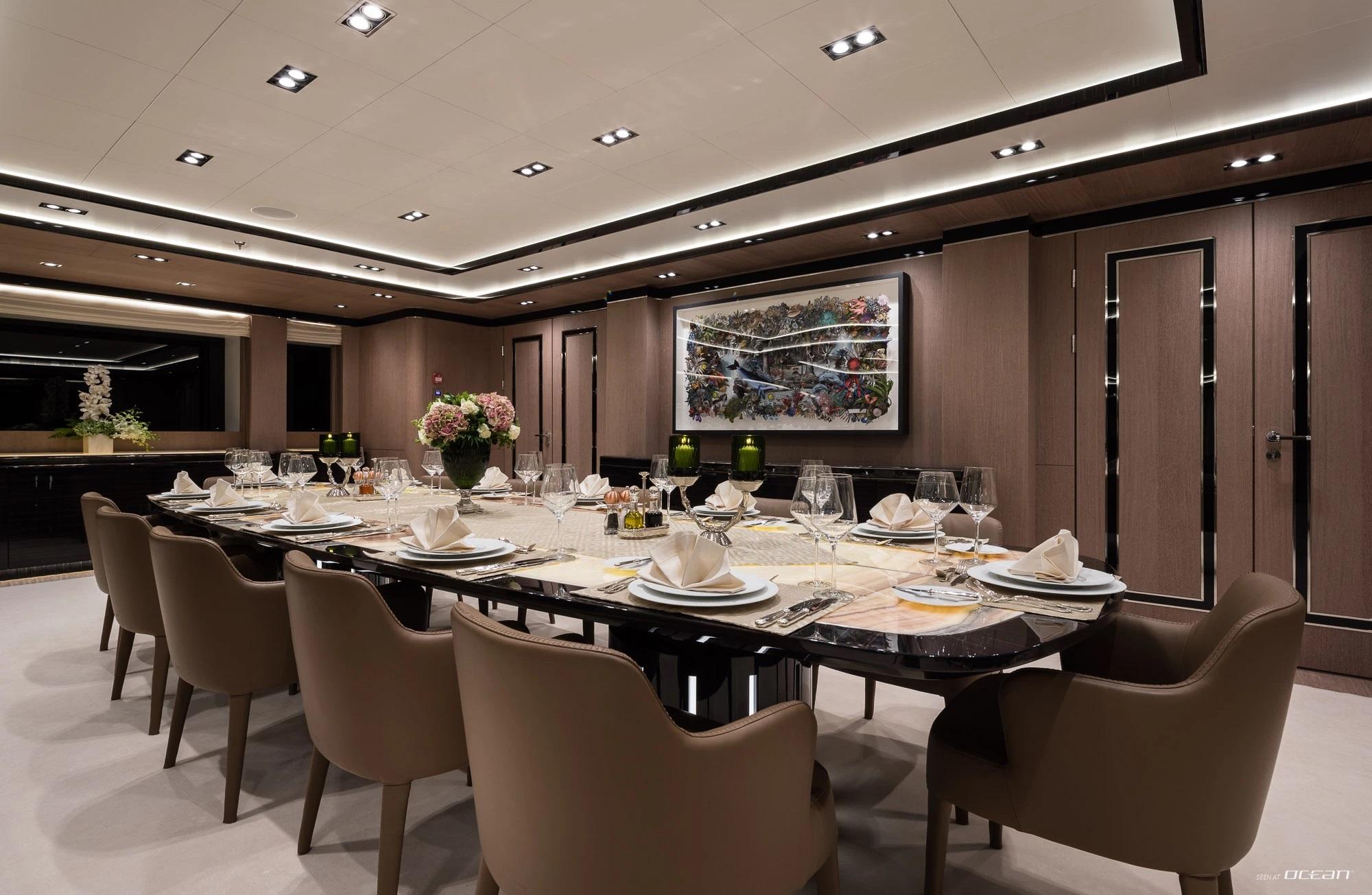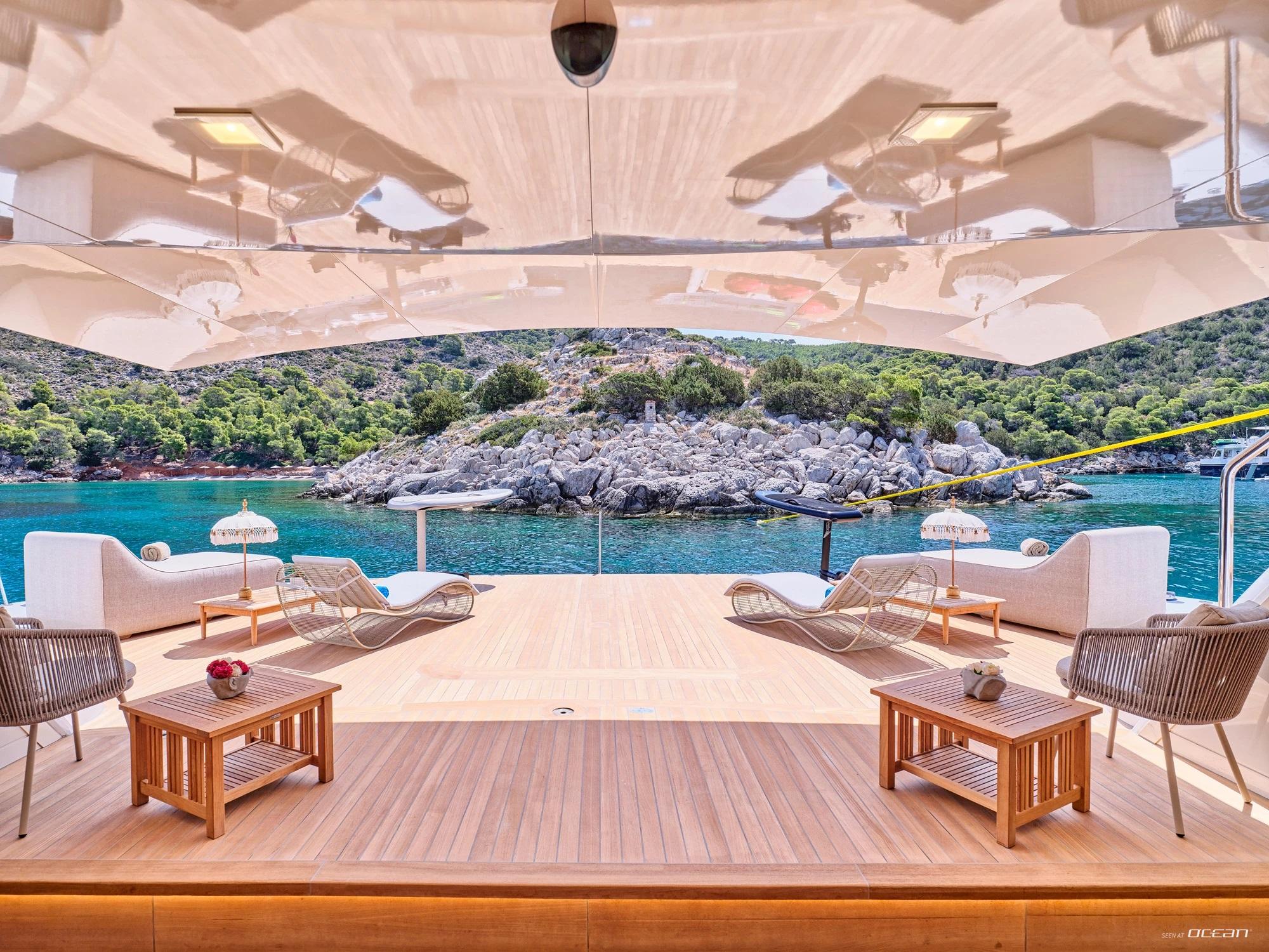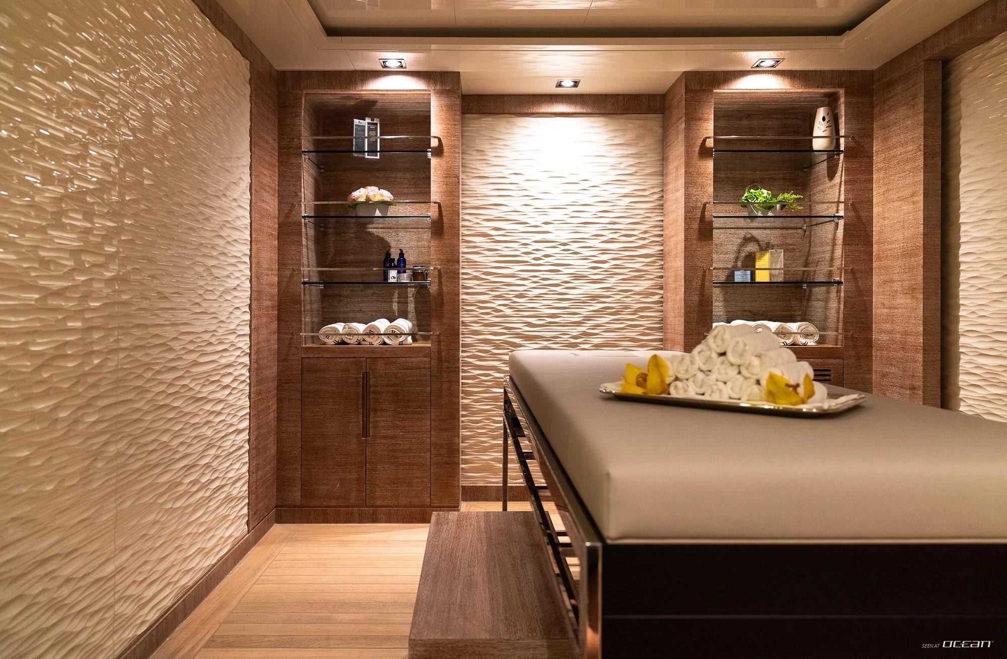 Guests can enjoy an outdoor cinema on the sundeck, a hot tub with sunbathing areas, and expansive social spaces for alfresco dining. The beach club offers a bar, massage area, steam room, and hydraulic ladder for accessibility, complemented by an elevator connecting all decks. A fully equipped high-tech gym with sea views and a wellness center ensures guests can maintain their routines while cruising. Charter Yacht O'PTASIA is perfect for those seeking relaxation and active lifestyle options alike.