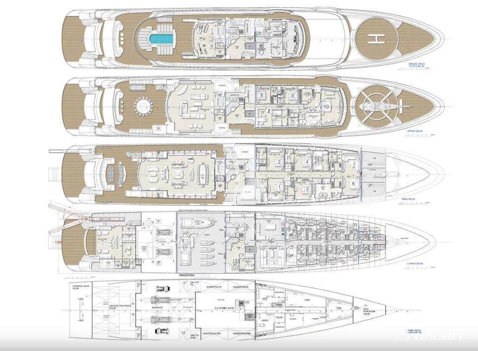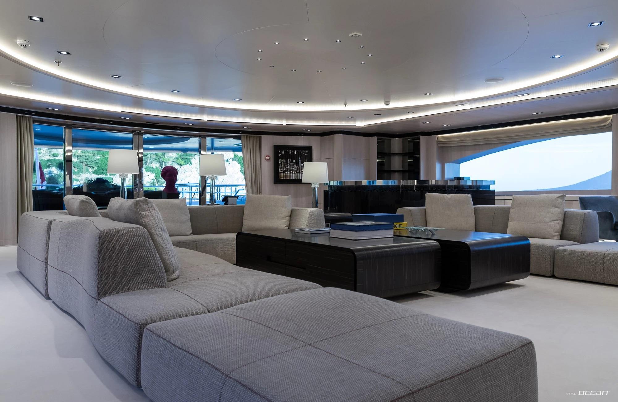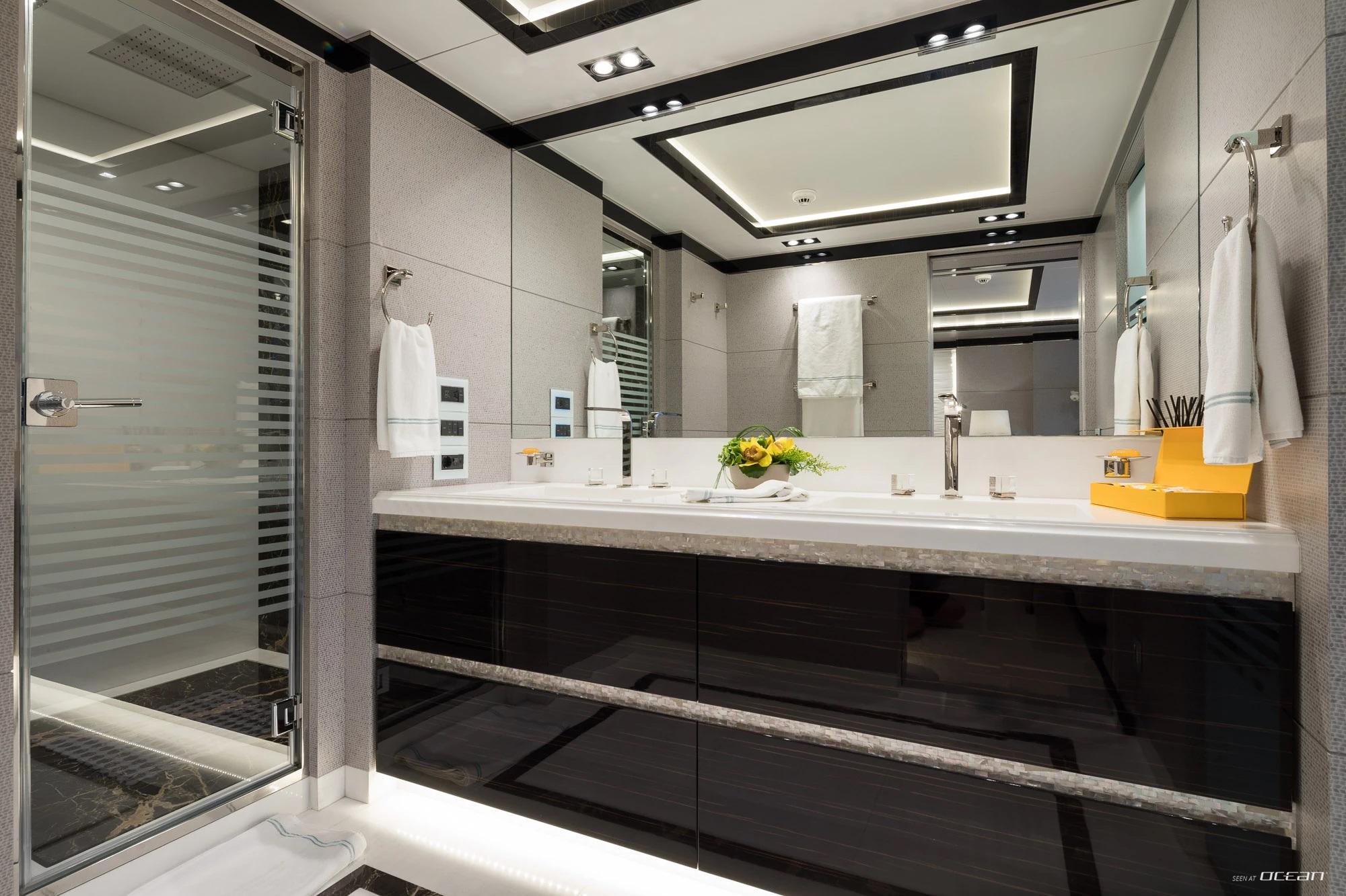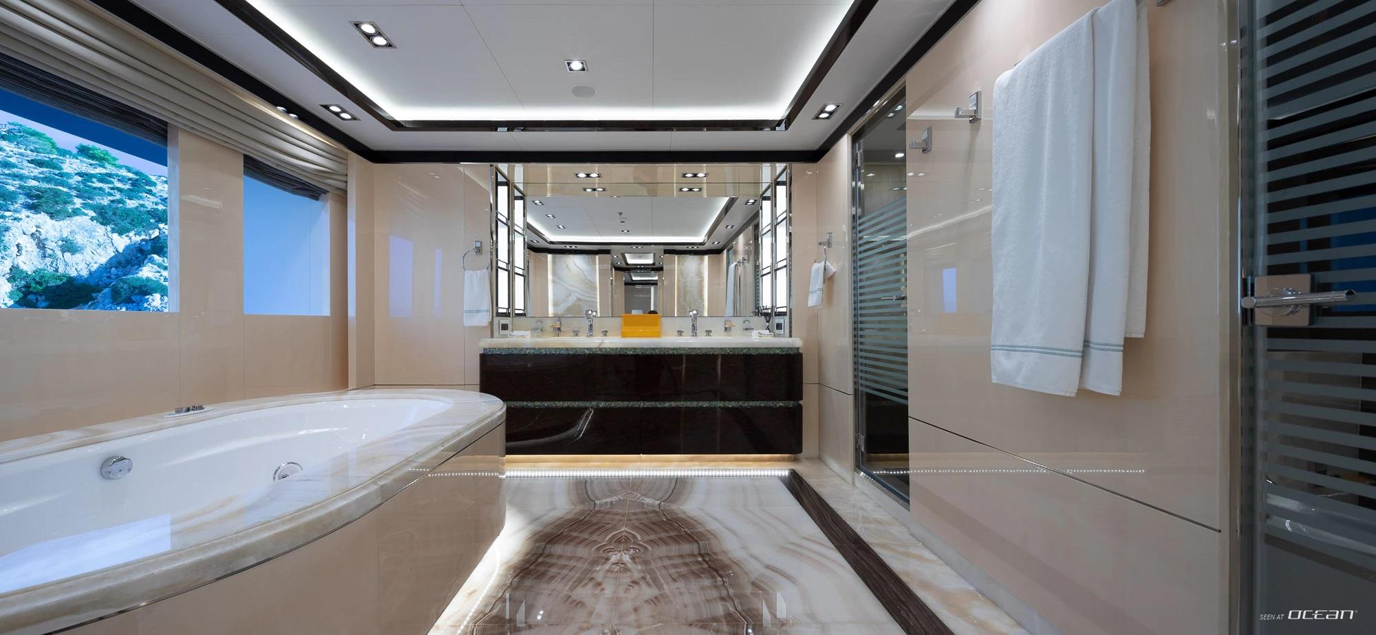 En-suite bathrooms in all cabins, air condition throughout, 3 generators, ice maker, watermaker, Wi-Fi internet, stabilizers underway, stabilizers at anchor, audio distribution system with independent Airplay, Bluetooth, Internet radio, Spotify, tune in radio, Pandora, Sirus XM, Deezer, Napster in each area of the yacht, indoor and outdoor B&W speakers and sound bars, mini iPads in each cabin for music and TV control, the guests can connect their own iPhone/iPad/Android device, 20 outlets for high power party speakers and DJ booths, 21 LED-TVs 32”-88” are installed throughout the yacht each with independent movie players, satellite receiver, media player, Apple TV, blue ray players, local TV channels and local inputs for gaming consoles, video cameras etc. 7.1 Dolby Atmos installed in master suites, VIP suites and salon, Central Digital Media System that can project images to all TVs, outdoor cinema in the sun deck area that can connect with media players, satellite receivers and Apple TV, Movies server with 450+ movies that are updated annually, movie room, beach club with steam room, massage room, bar, pool on the sundeck, helipad for touch and go helicopter size MD500E, elevators on all decks, deck jacuzzi, swimming platform, stern/cockpit shower and a variety of water toys.