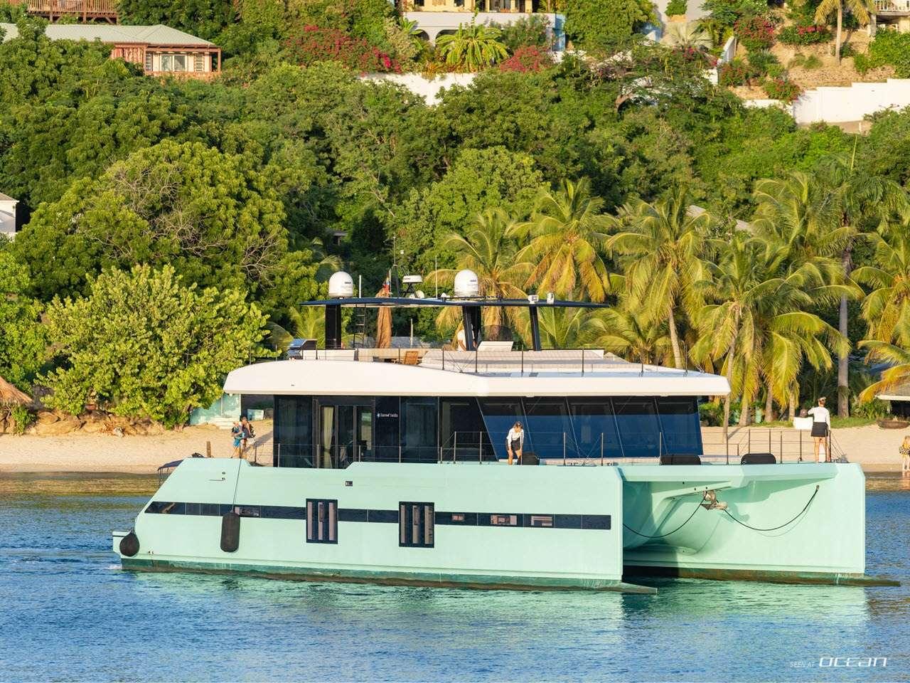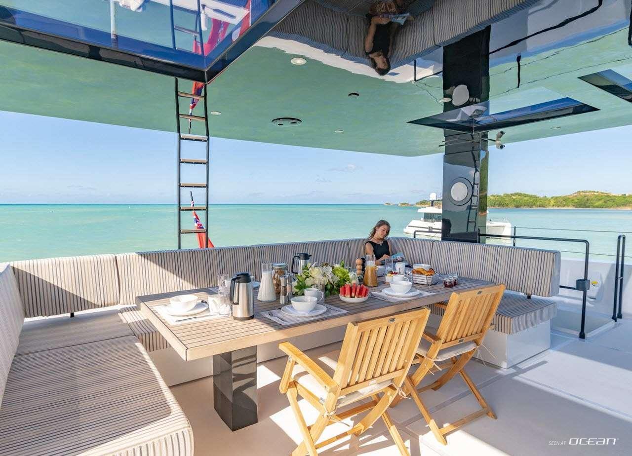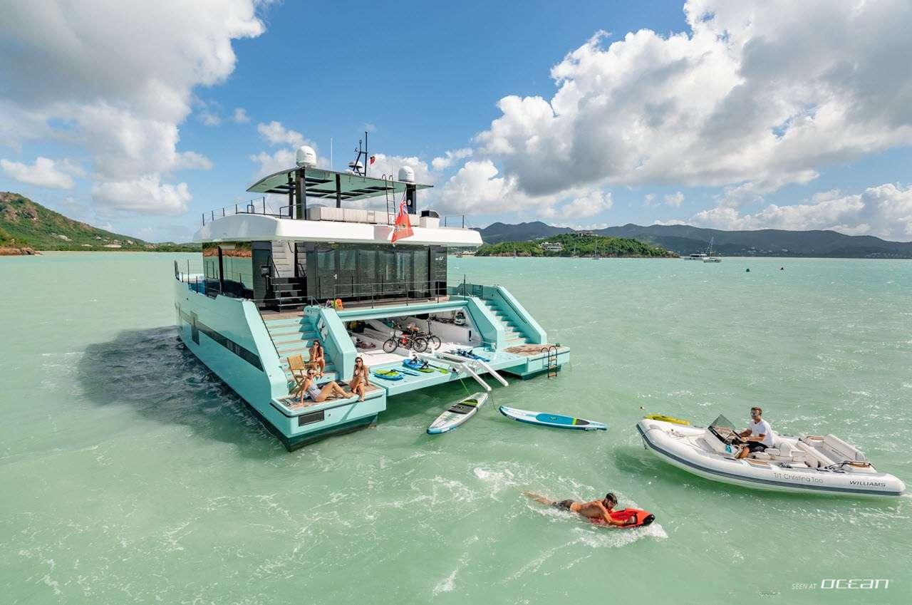 ORCA, previously known as CHRISTINA TOO, is a striking Sunreef Supreme 68 Power catamaran combining performance, innovation, and luxury. Powered by twin IPS Volvo engines, she offers smooth and agile cruising, while her dynamic positioning system ensures effortless maneuvering in marinas or at anchor. Her expansive bow terrace features large sunbeds, a Jacuzzi, and a wide sun awning, creating the perfect space for relaxation under the sun. ORCA luxury power catamaran for charter delivers a seamless blend of comfort and style in the Bahamas and Florida.