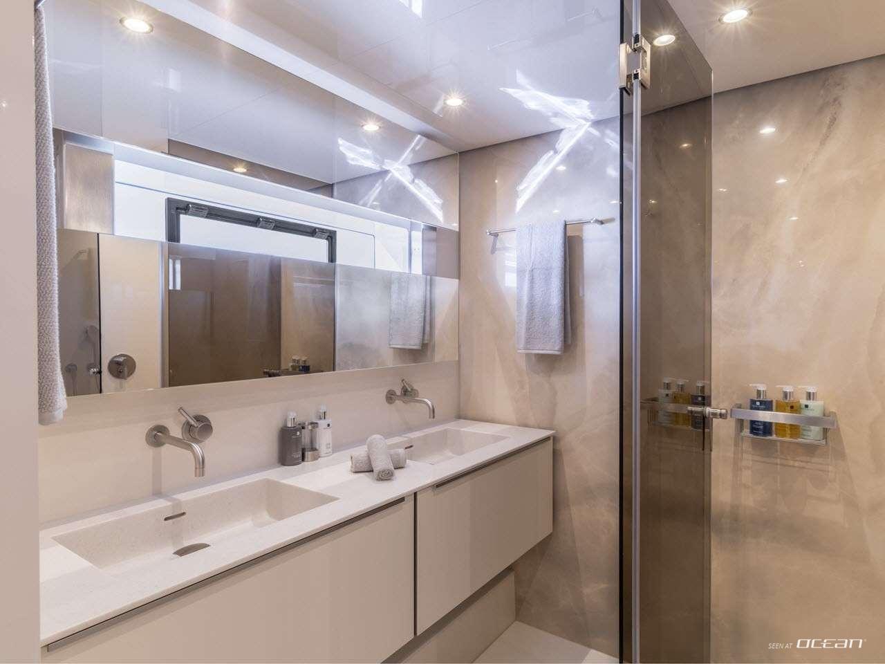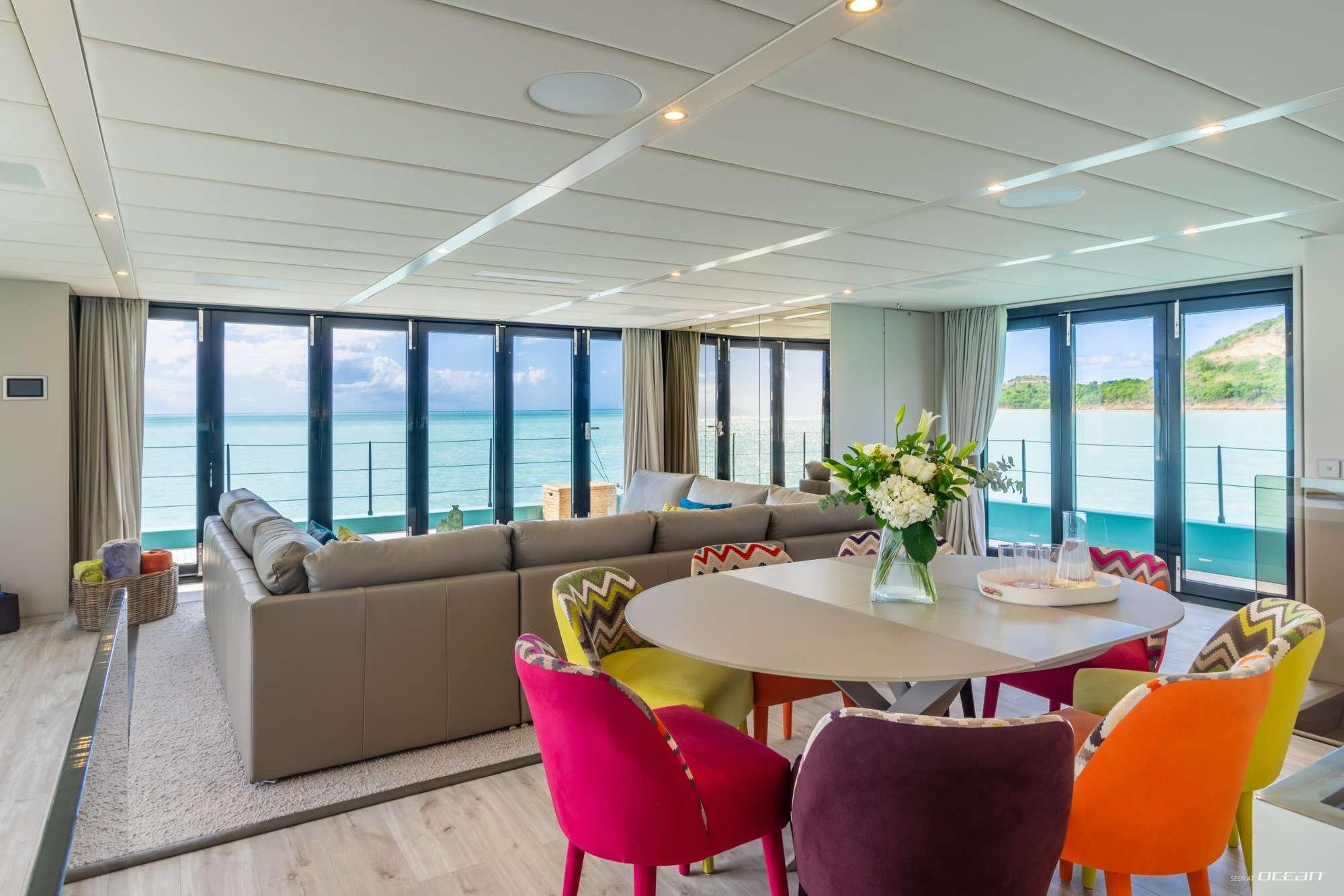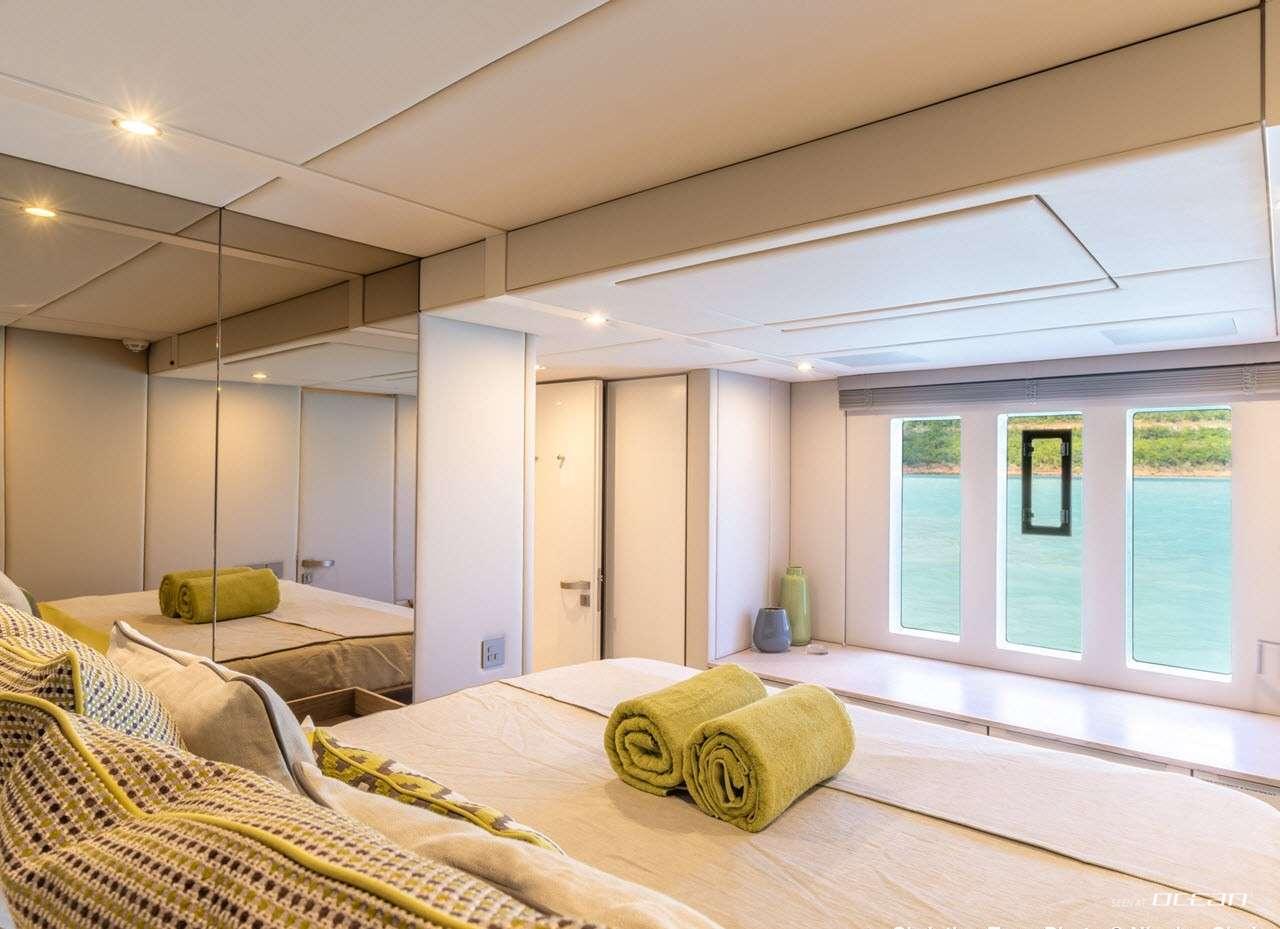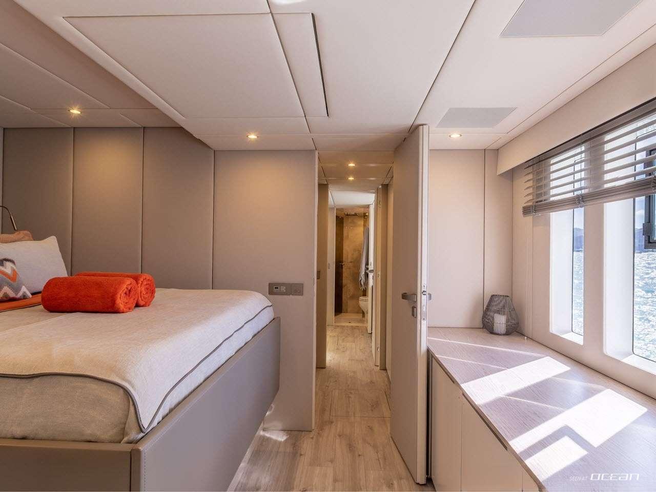 Designed for 8 guests, the ORCA luxury power catamaran for charter features 2 master suites and 2 double cabins, each with generous quartz-clad bathrooms and thoughtful details. The main deck saloon and galley span the full beam of the yacht, accented with soft grey and cream tones and bold, colorful furnishings. Interiors are bright, inviting, and meticulously designed for both comfort and practicality. Every space reflects a modern and elegant atmosphere for a refined catamaran experience.